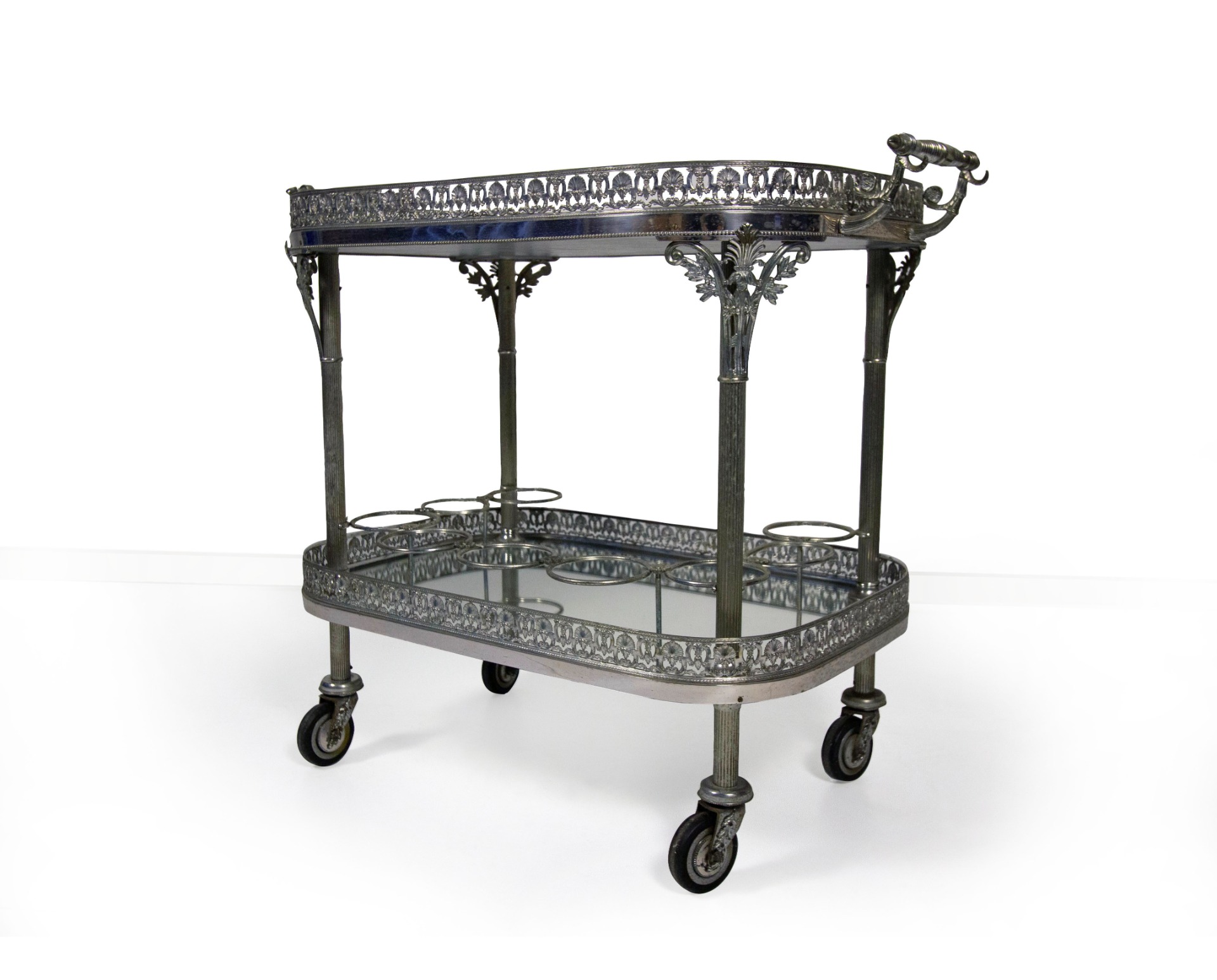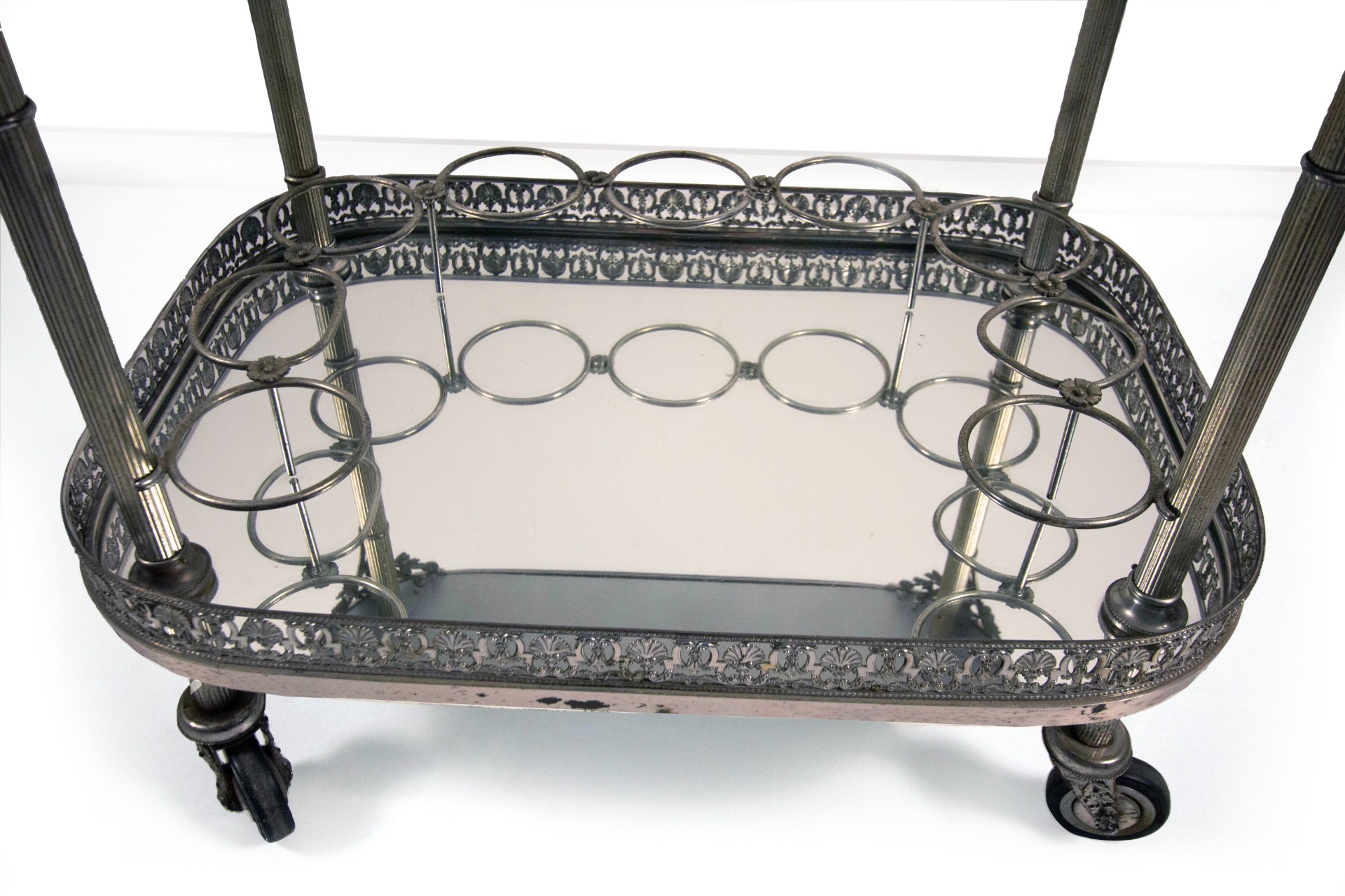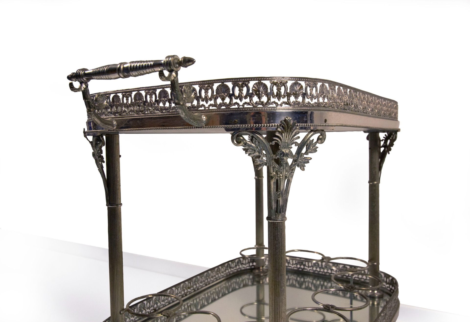 Silver-plated metal trolley, 20th century, ferrule with palmette decorations, column uprights; on the lower level nine bottle rings, cm 74x85x48