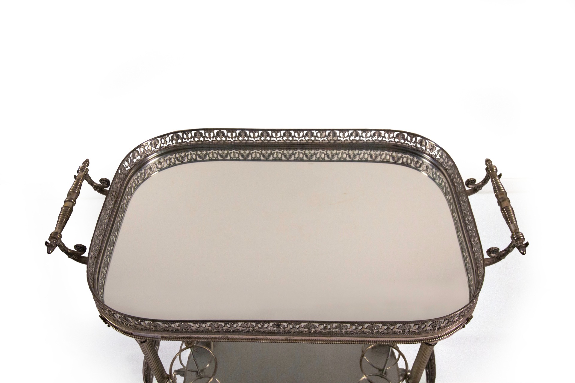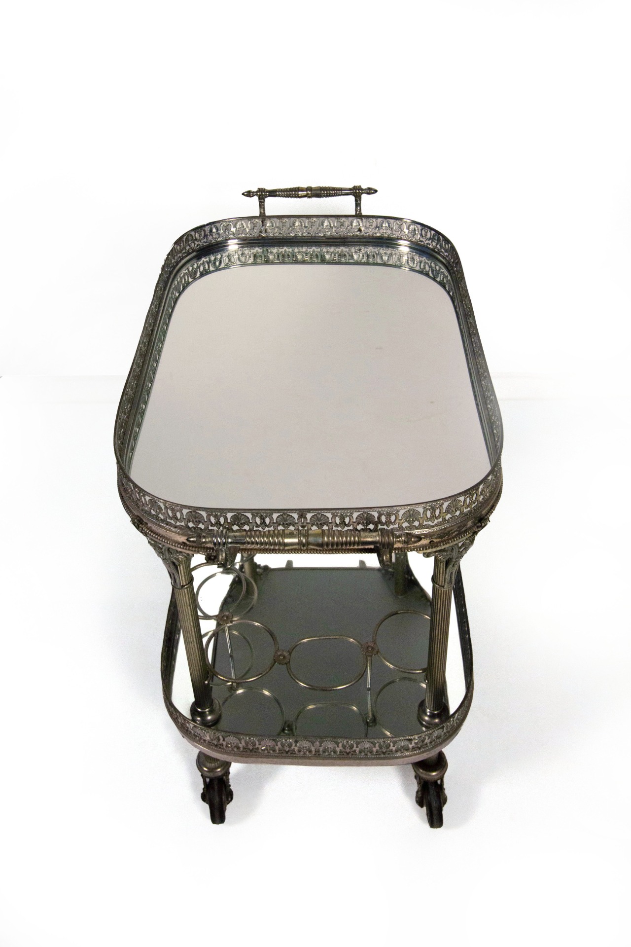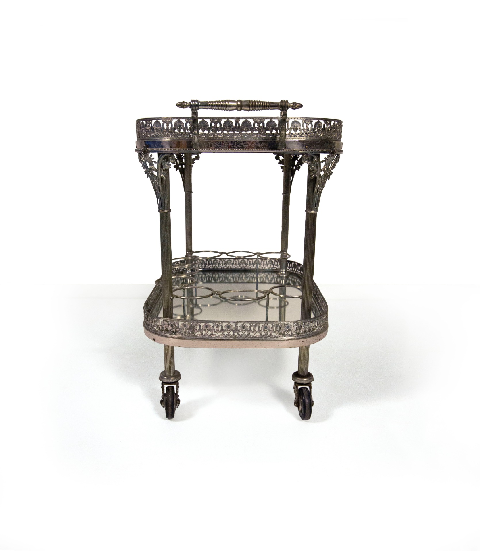 Silver-plated metal trolley, 20th century, ferrule with palmette decorations, column uprights; on the lower level nine bottle rings, cm 74x85x48