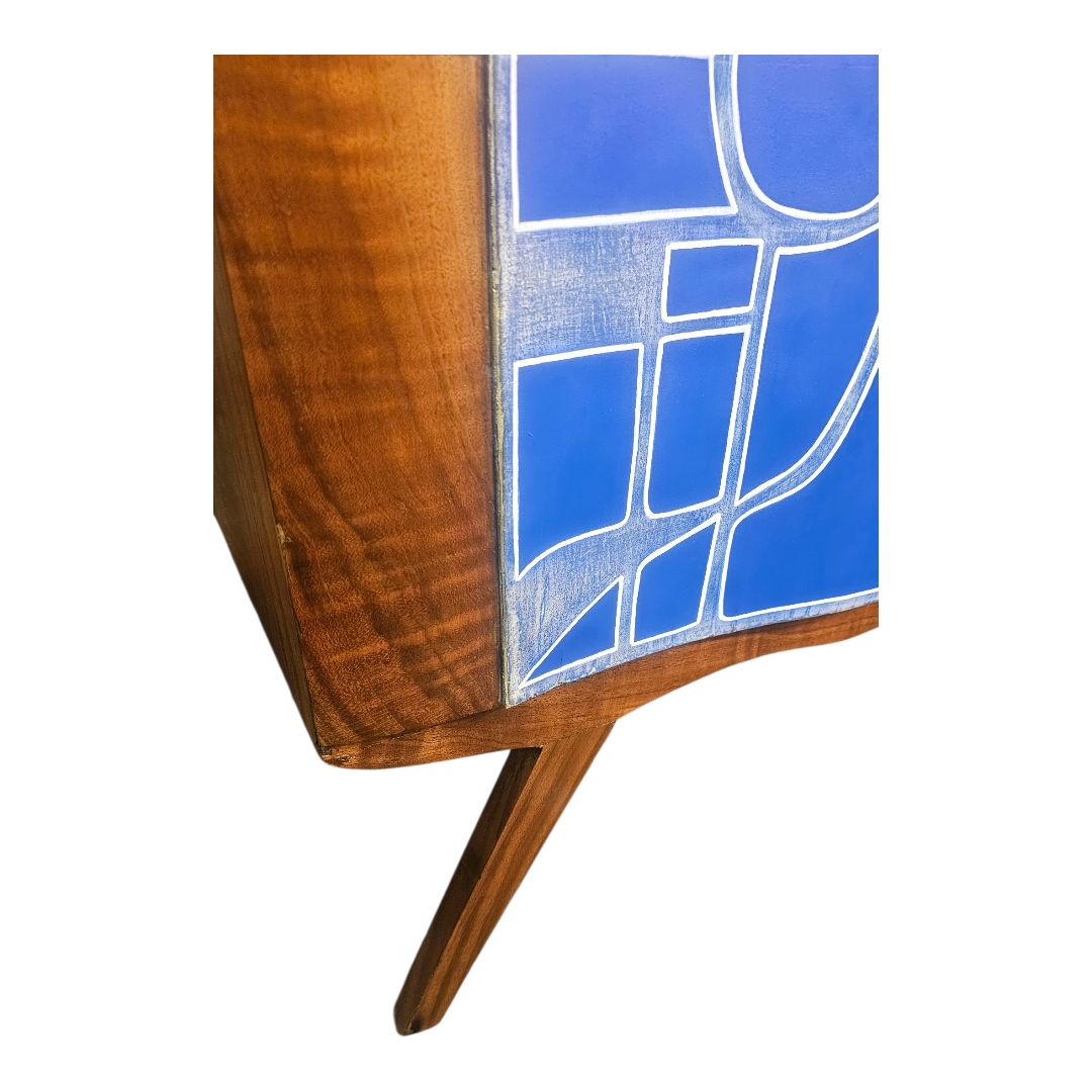 Beautiful sideboard. 1950s walnut burl. With a blue and silver leaf design on the front. Splayed legs. Measures one meter wide, sixty deep, and ninety-five high.