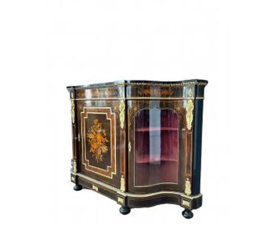 Questa antica servante intarsiata rappresenta una perfetta fusione di eleganza e maestria artigianale, tipica dello stile Napoleone III. La sua struttura in legni pregiati offre una resistenza impeccabile, mentre gli intricati intarsi le conferiscono un aspetto sontuoso. Tra le caratteristiche distintive: