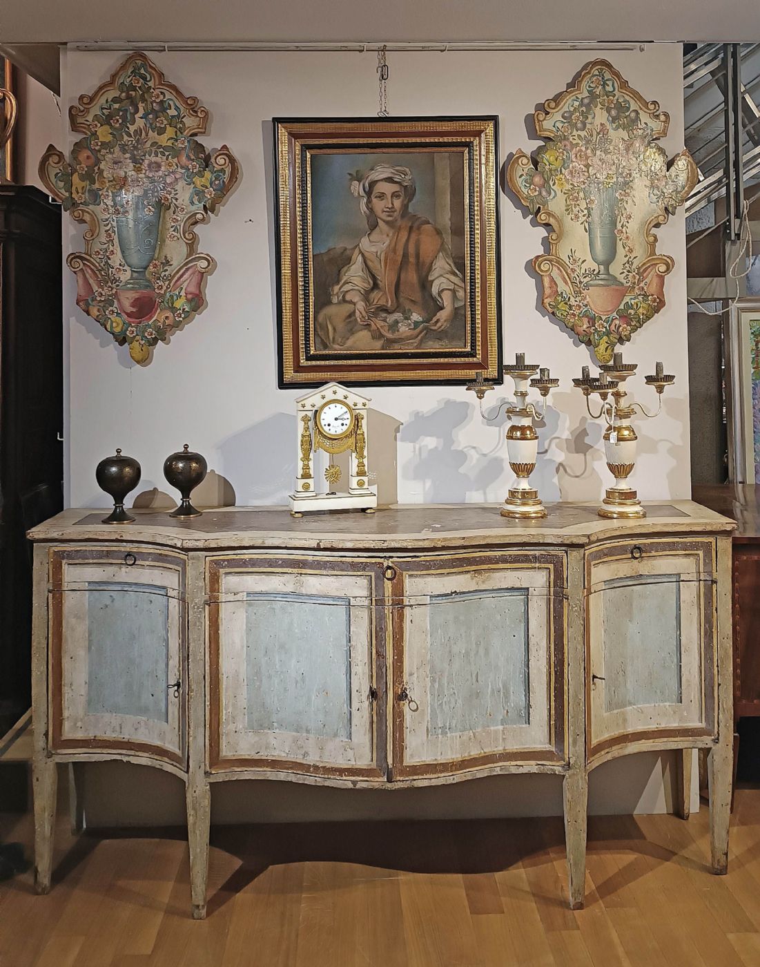Raffinata credenza in legno intagliato e dipinto a tempera magra, con pittura coeva al mobile. La credenza si caratterizza per gambe troncopiramidali e un fronte mosso, che conferiscono unicità. Le decorazioni pittoriche sul fronte e sul piano, realizzate con colori come marrone, bianco,...