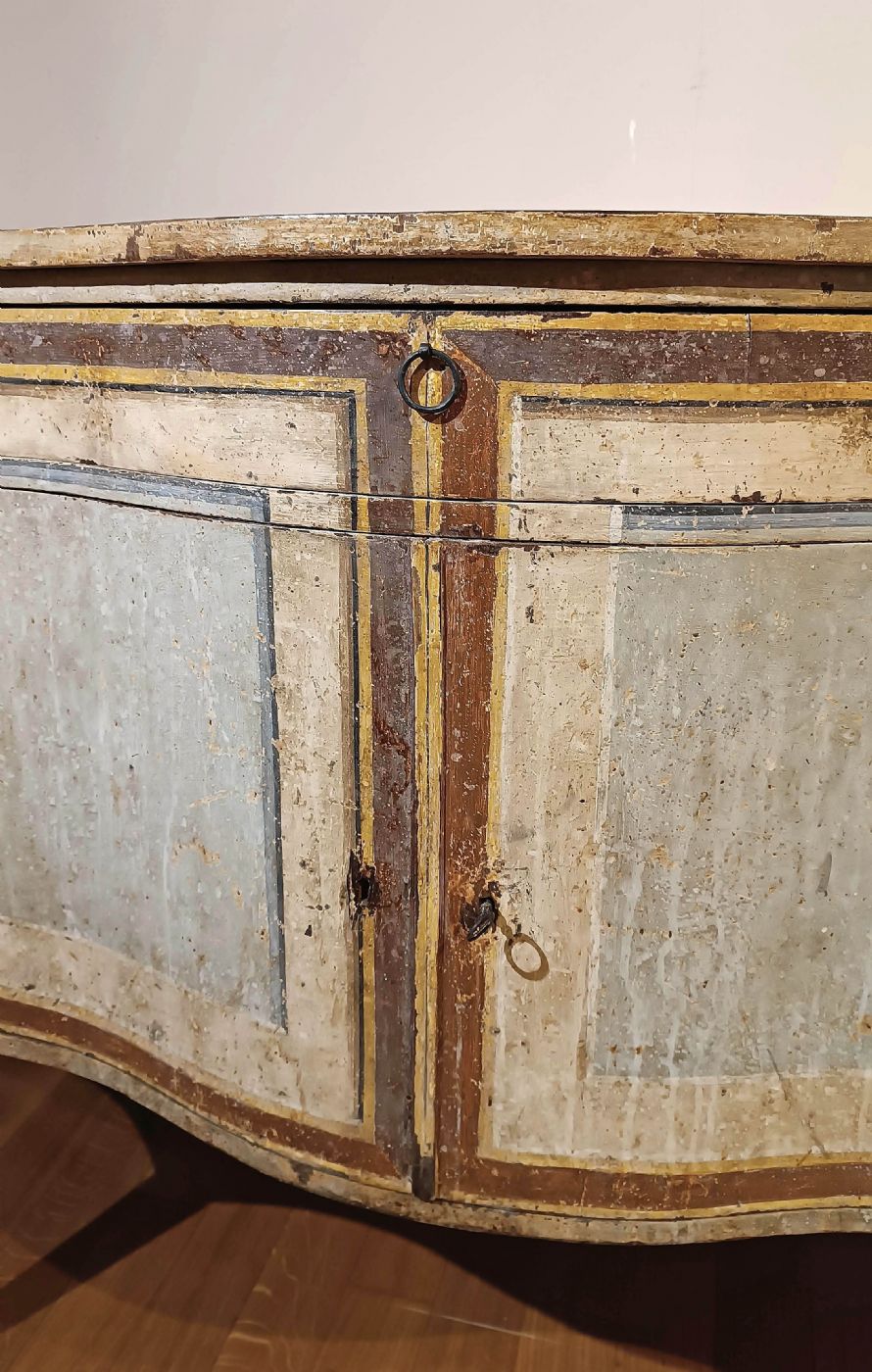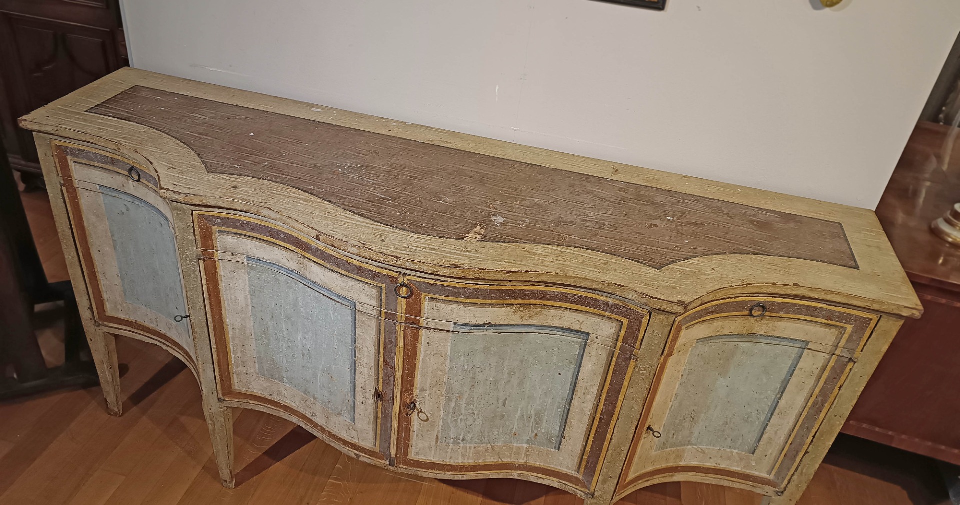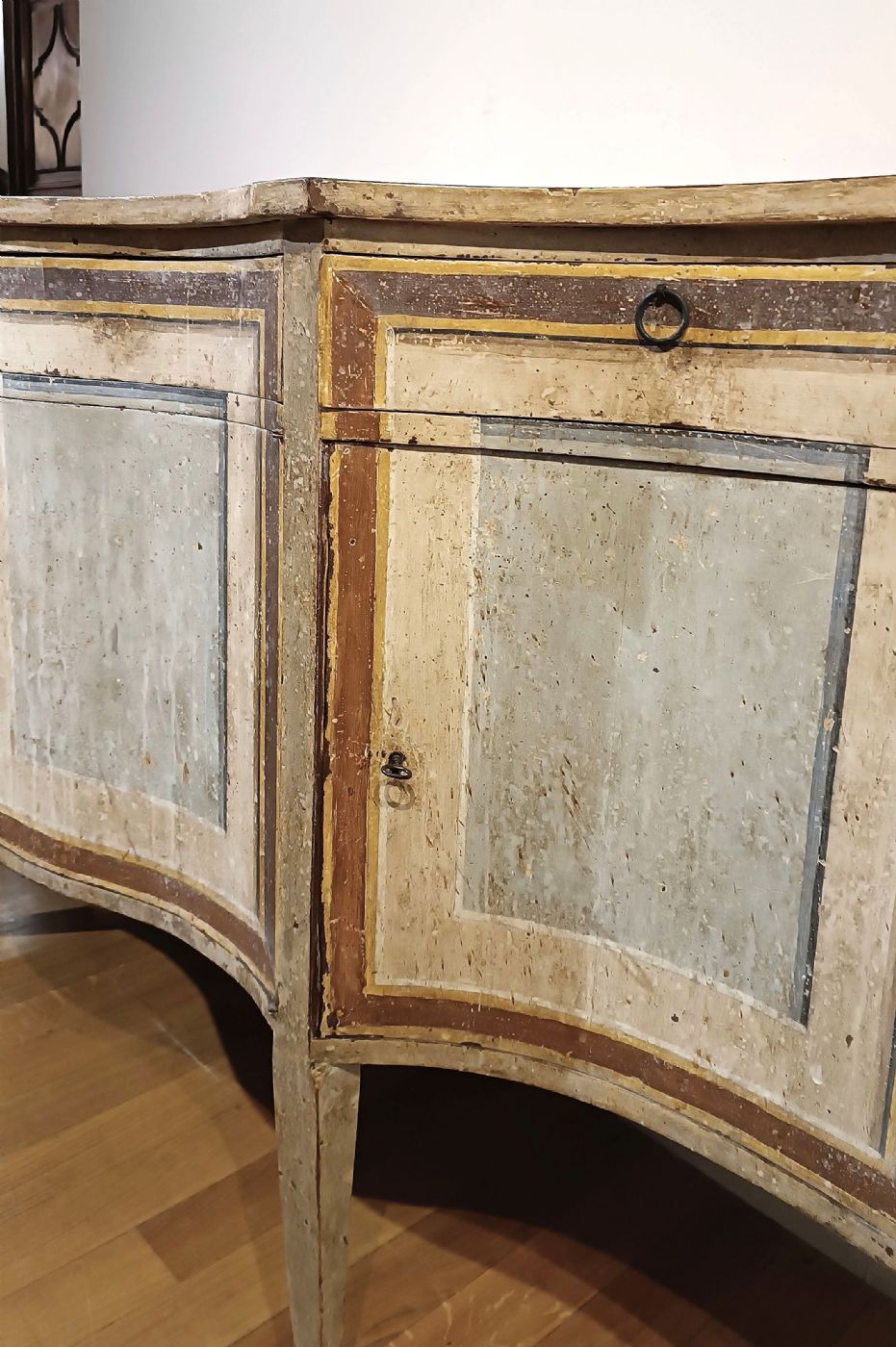 Raffinata credenza in legno intagliato e dipinto a tempera magra, con pittura coeva al mobile. La credenza si caratterizza per gambe troncopiramidali e un fronte mosso, che conferiscono unicità. Le decorazioni pittoriche sul fronte e sul piano, realizzate con colori come marrone, bianco, giallo e azzurro, sono di tipo geometrico e arricchiscono con eleganza l’intera struttura. Il mobile dispone di tre cassetti a scomparsa e quattro sportelli, apribili mediante serratura e tiranti, ergonomici e spaziosi per la sistemazione degli oggetti. Si tratta di un mobile di grande gusto ed eleganza, capace di arredare con classe e raffinatezza qualsiasi ambiente. Manifattura del centro-Italia nello stile neoclassico, della metà del XIX secolo. Misure: H x L x P 101 x 199 x 60cm