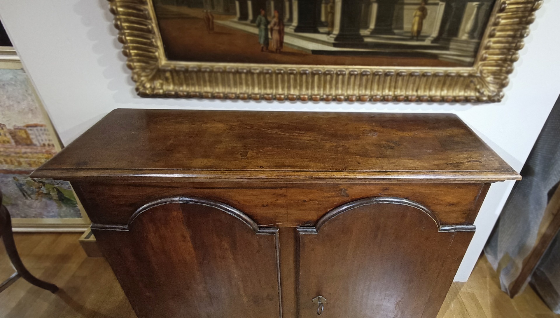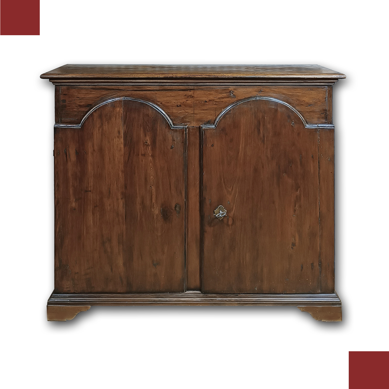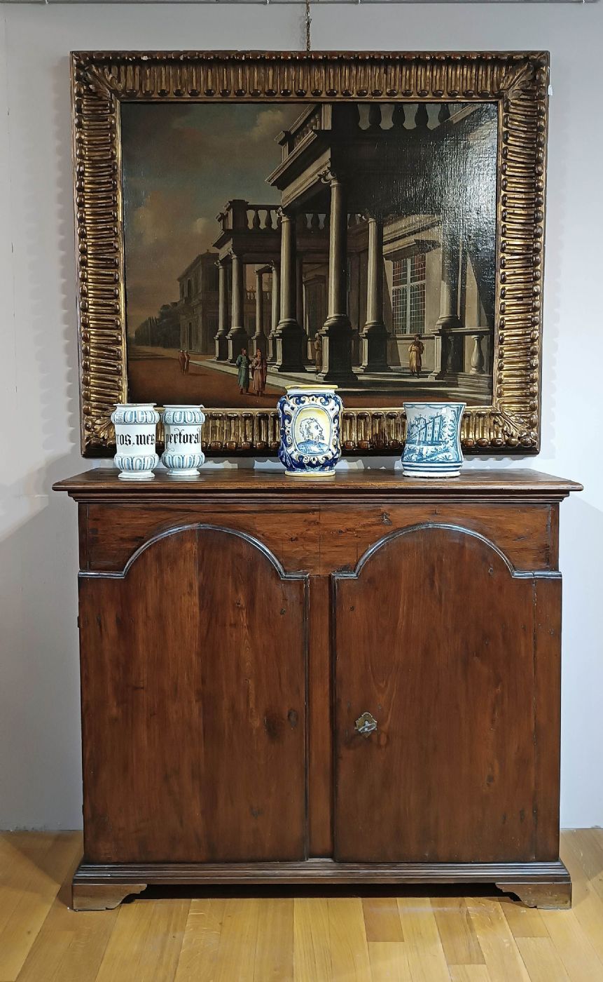 Splendid walnut credenza, finely hand-carved. It is characterized by corbel feet and two mullioned doors that give harmony and elegance to the structure, opening access to three capacious internal shelves. The side hinges, skilfully inserted on the side, make the furniture ergonomic and functional, while maintaining a limited depth, thus allowing it to be placed in different environments without taking up too much space. This is a credenza of excellent workmanship and quality, capable of furnishing any context with antiquity and refinement. Tuscan manufacture from the Louis XIV period, around the end of the 17th century.