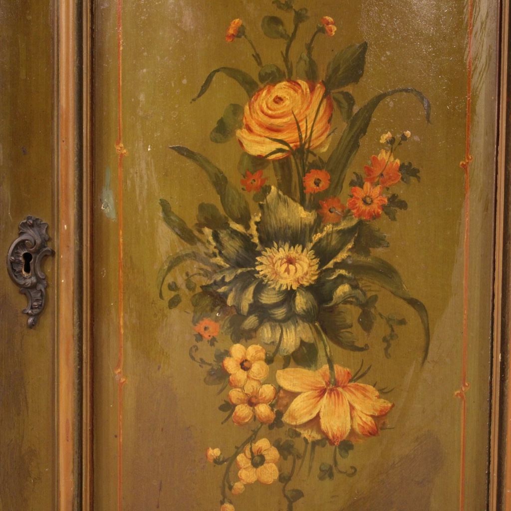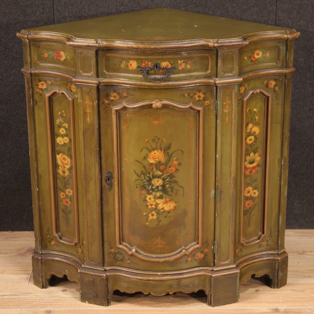 cod. 9625/2Large Venetian corner cupboard from the first half of the 20th century. Furniture in finely carved wood, lacquered and hand painted with very pleasant floral decorations. Corner cupboard equipped with a drawer and a door of good capacity and service. Wooden top in character also lacquered and painted in good measure. Corner cupboard lacking keys, which offers a large internal compartment with a fixed support surface plus a base (see picture). Furniture that is part of a pendant (see picture and ask for the bulk price if available). Structurally sound corner cupboard, with signs of wear and color recovery, overall in a fairly state of conservation. Side 70 cm