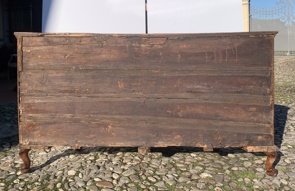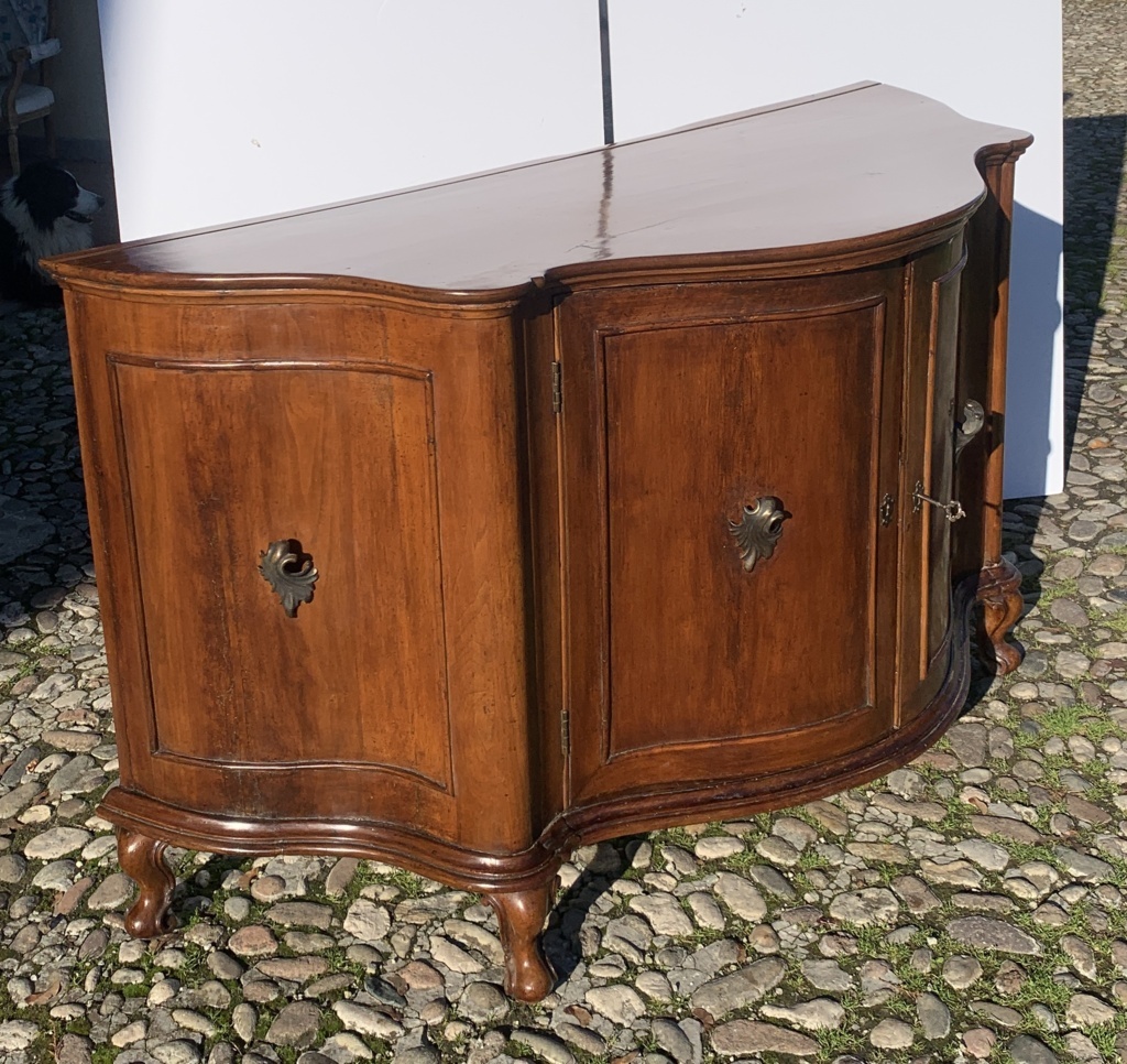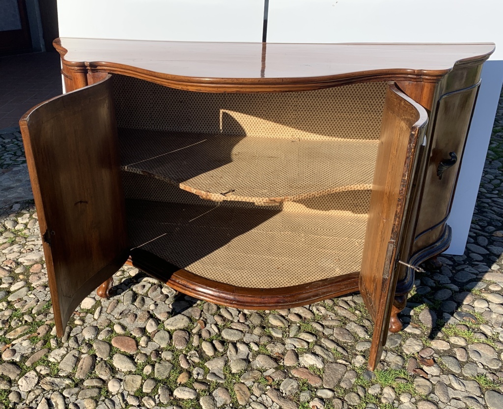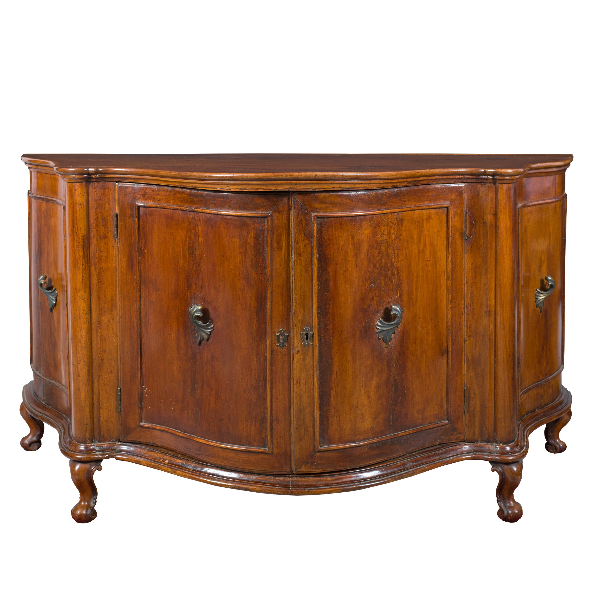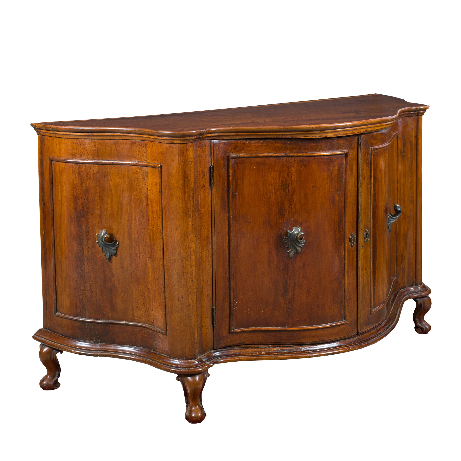 Venetian manufacture from the first half of the 18th century in the Rococo/Louis XV style. Curved front and sides, two doors and curled feet, gilded bronze handles presumably from the same period.