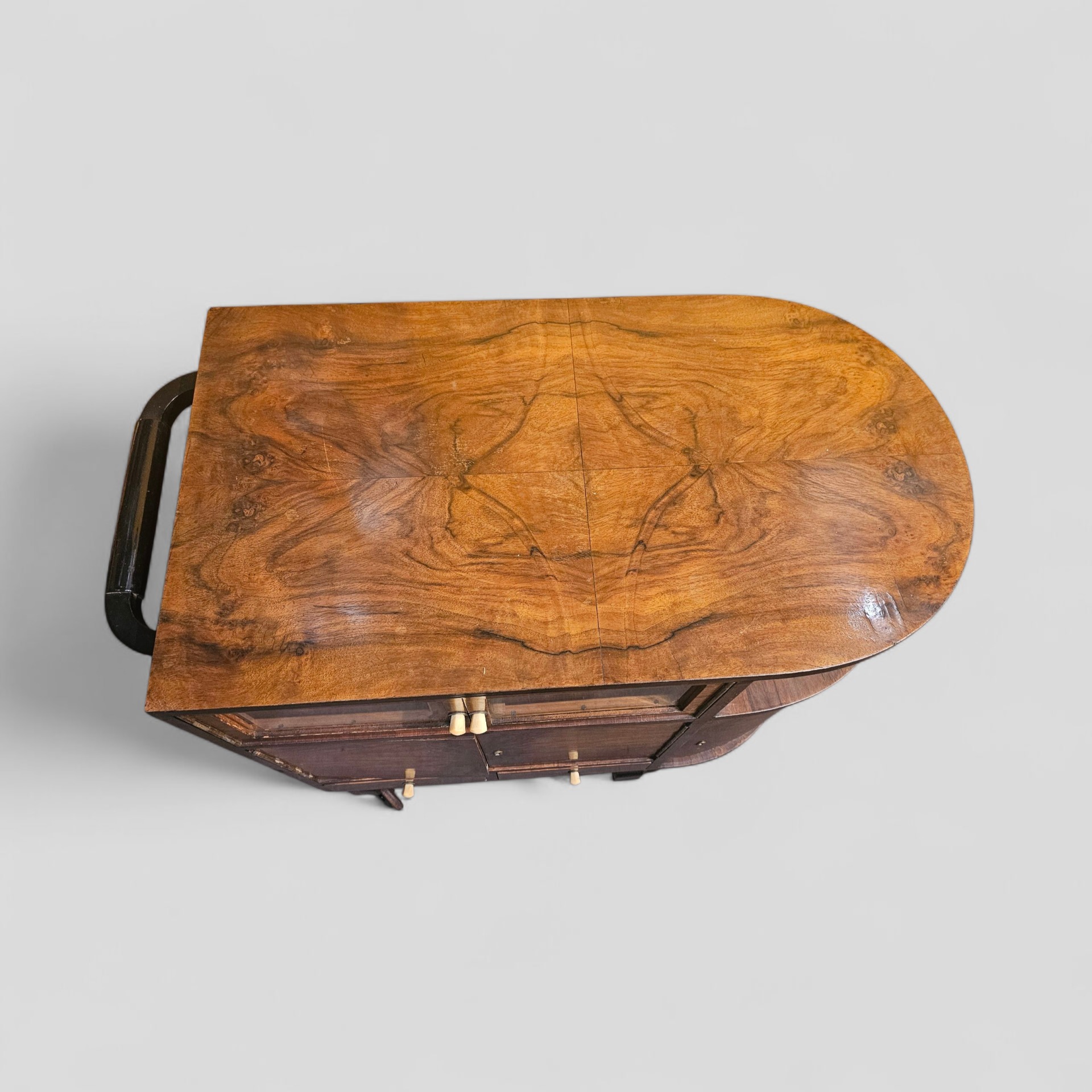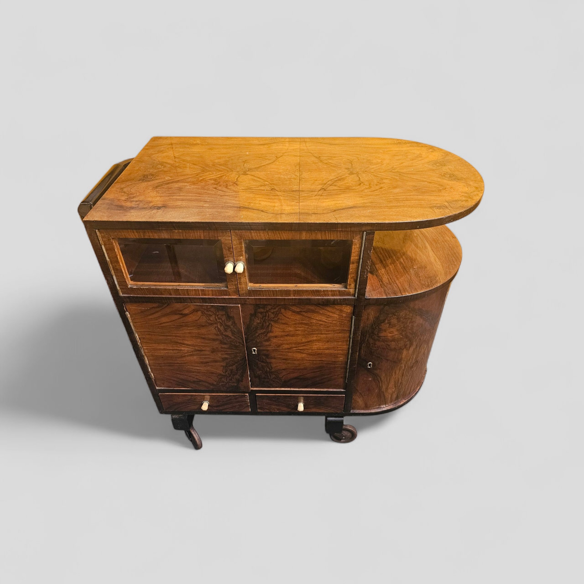 Beautiful Art Deco bar table in walnut and walnut veneer with doors and drawers with ground glass. It measures eighty in width, forty-five in depth, and sixty-five in height.