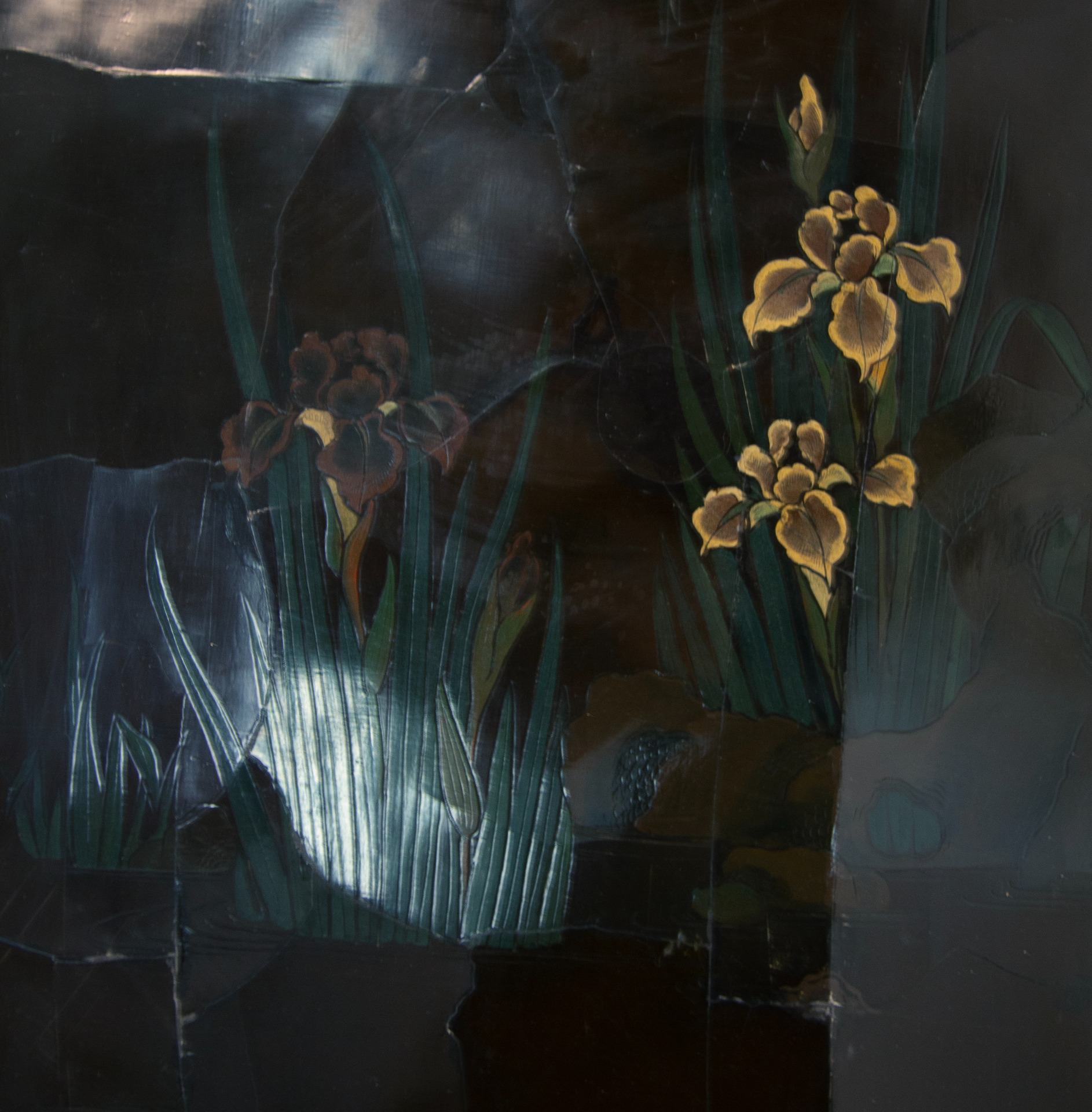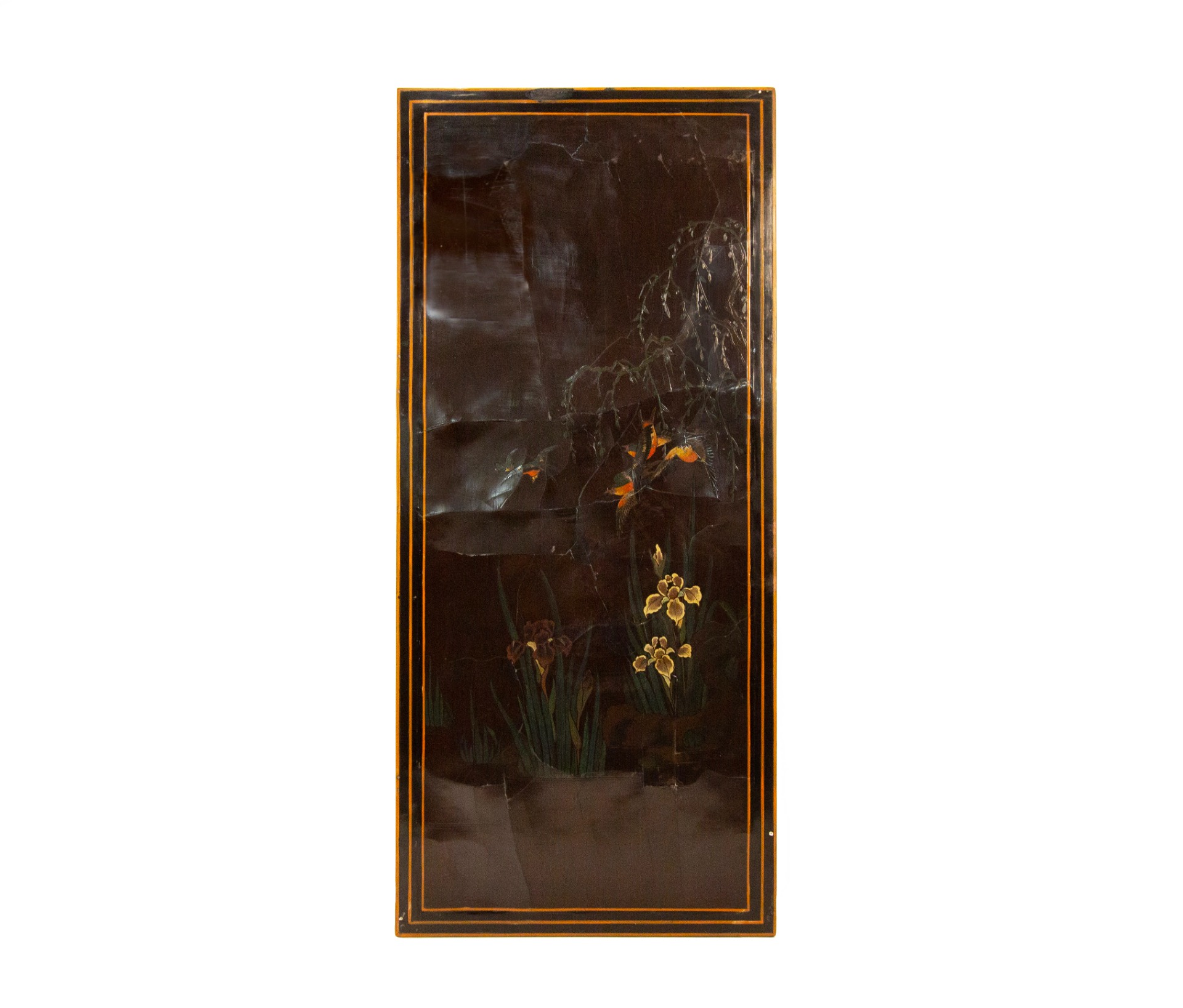 Coffee table in gilded bronze and lacquered wood, 20th century, rectangular top decorated with irises and birds in polychromy on a black background. The bronze support is shaped as a continuous vine on both the belt and the four uprights, cm 42x137x60