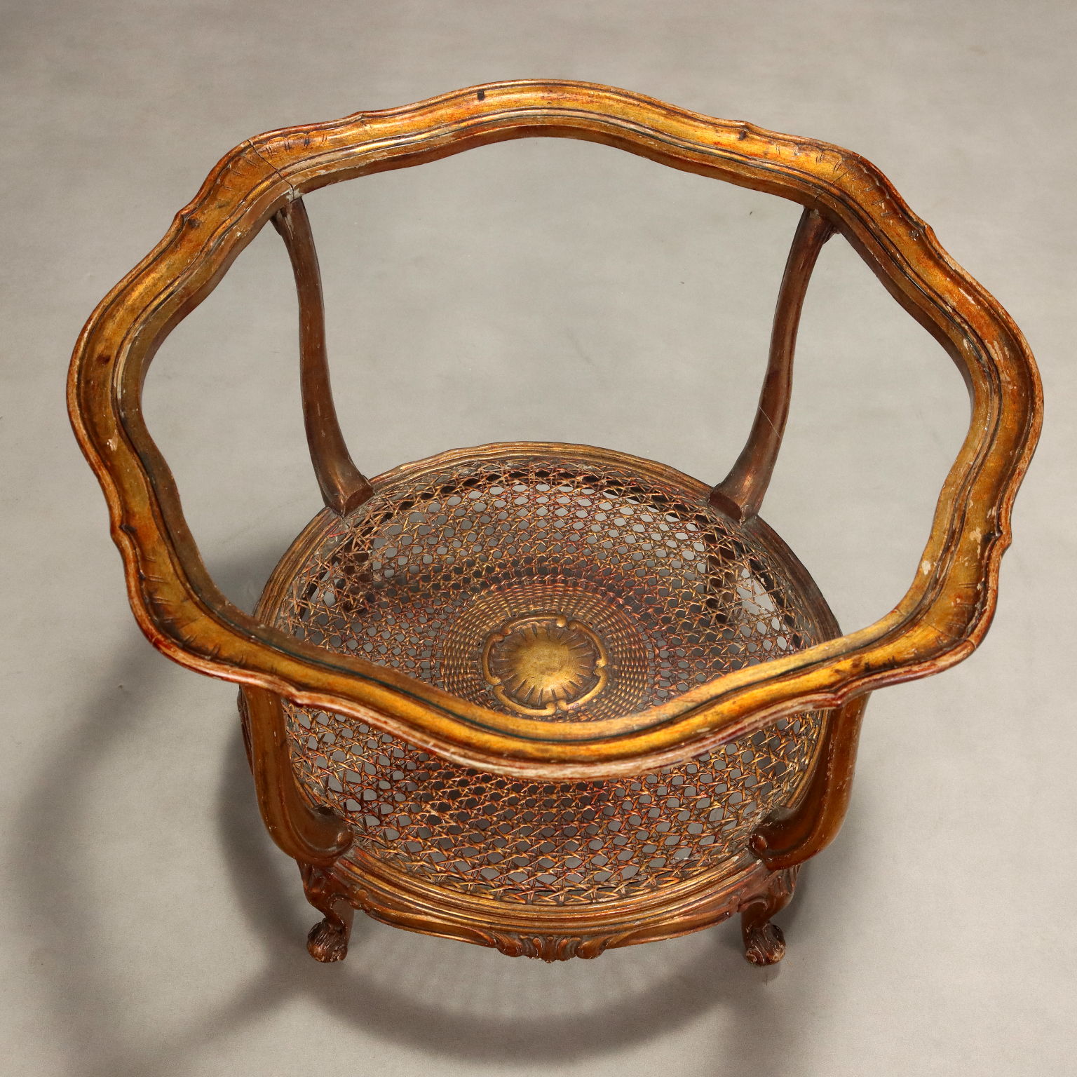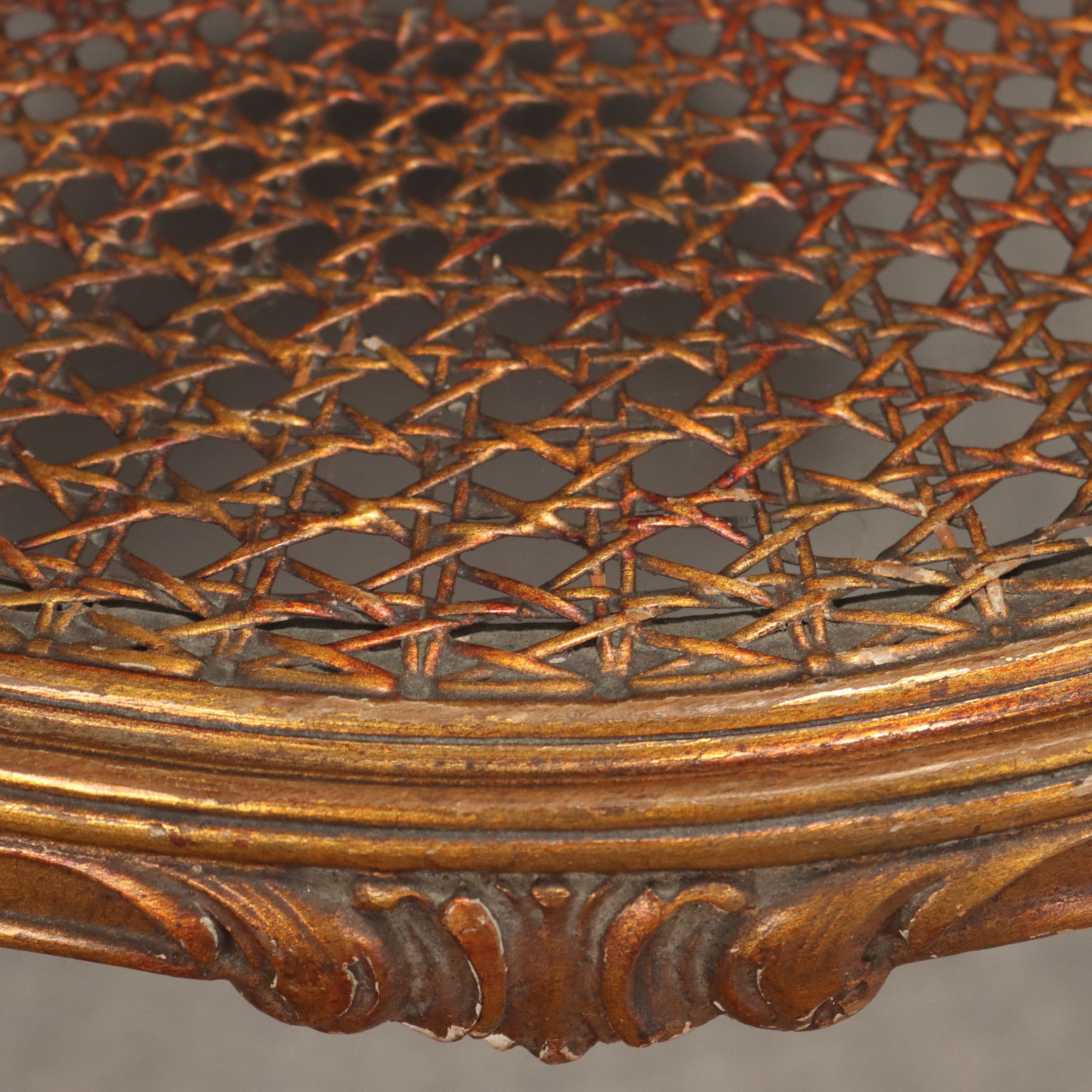 Center table in style, with a gilded wood structure, glass top supported by four curved legs with volute and scroll carvings, lower cane shelf with carved central rosette. Italy, early 20th Century.