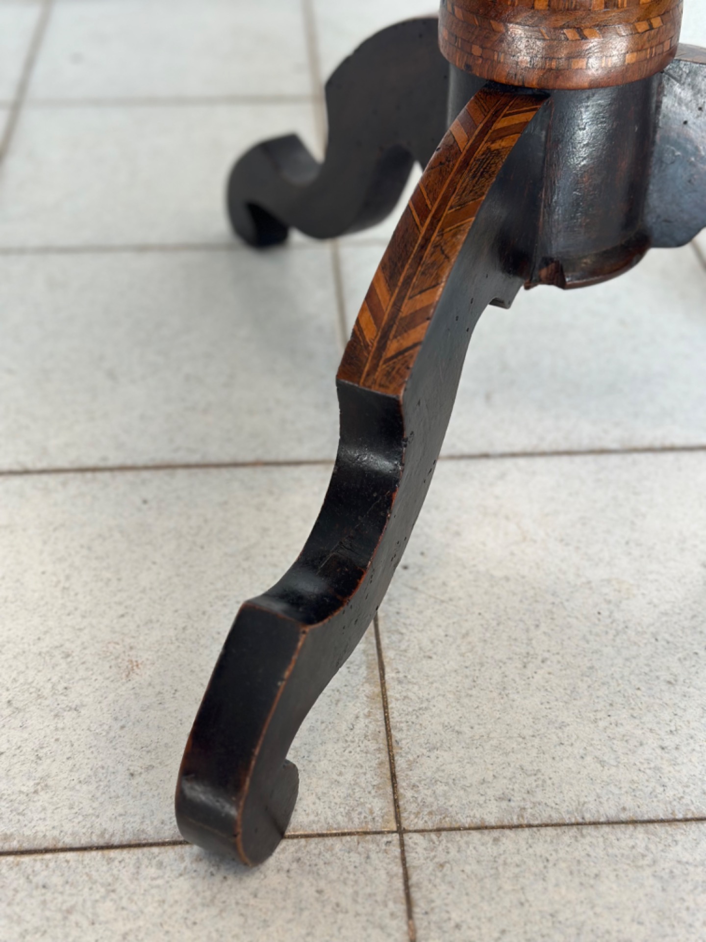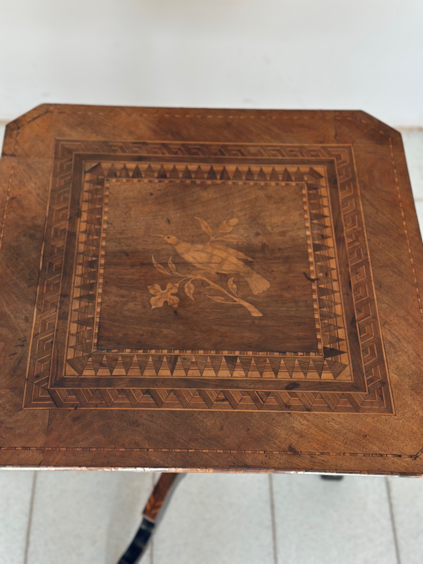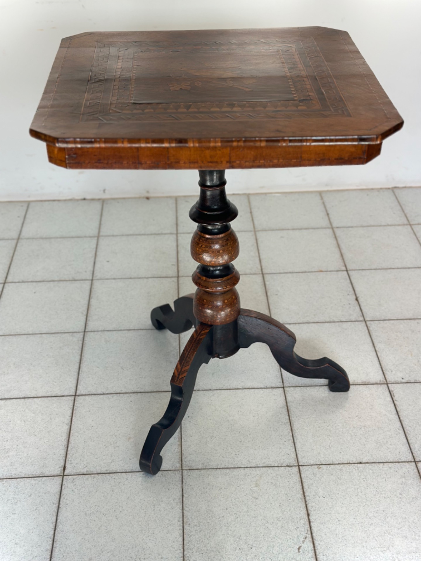 Inlaid Rolo coffee table, mid-19th century, supported by a central turned stem supported by three arched feet partly ebonized. The table is characterized by a refined inlaid decoration made with small tiles of fine wood of various essences. The top has geometric elements and a small bird in the center, typical of the famous Rolo (Reggio Emilia) manufacture, made famous for its fine inlay work.