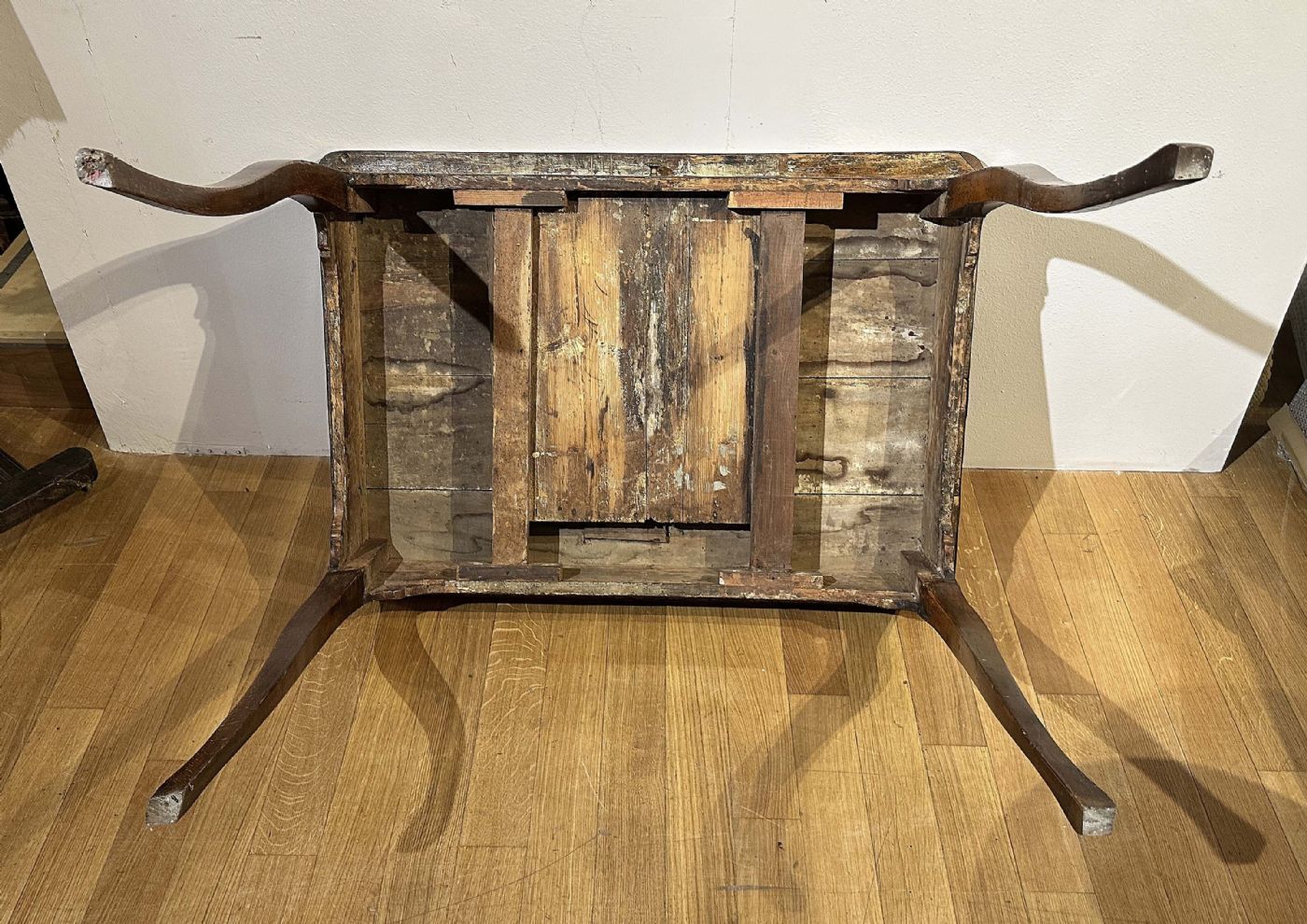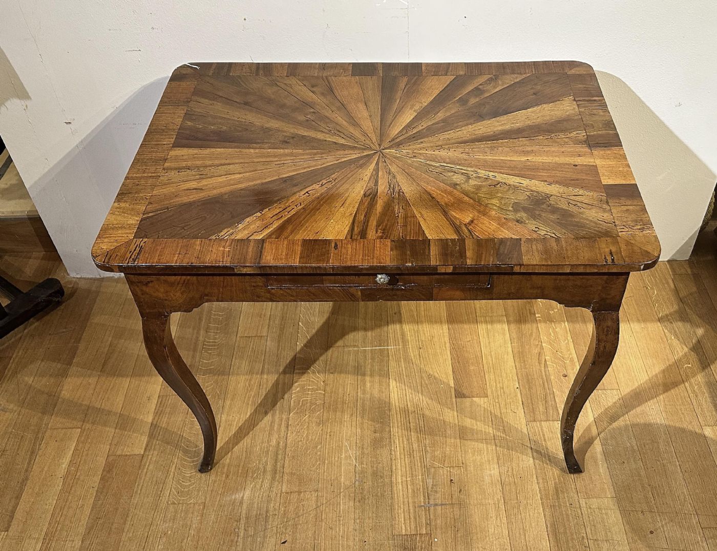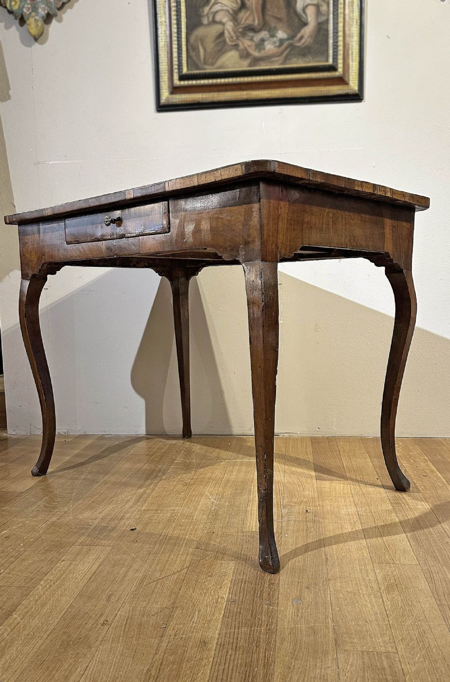 Elegant desk entirely veneered in walnut and olive wood, embellished with inlays on the top. The table is distinguished by its slightly curved legs, typical of the style of the era, and by an ergonomic central drawer, ideal for storing small objects. Further enhancing its refinement are the inlays on the top, made in a geometric segmented pattern, which create refined plays of light and shadow. This table can be used both as a side table and as a writing desk for the center of the room, adding a touch of class and elegance to any environment. Tuscan manufacture, from the Louis XV period, around the mid-18th century.