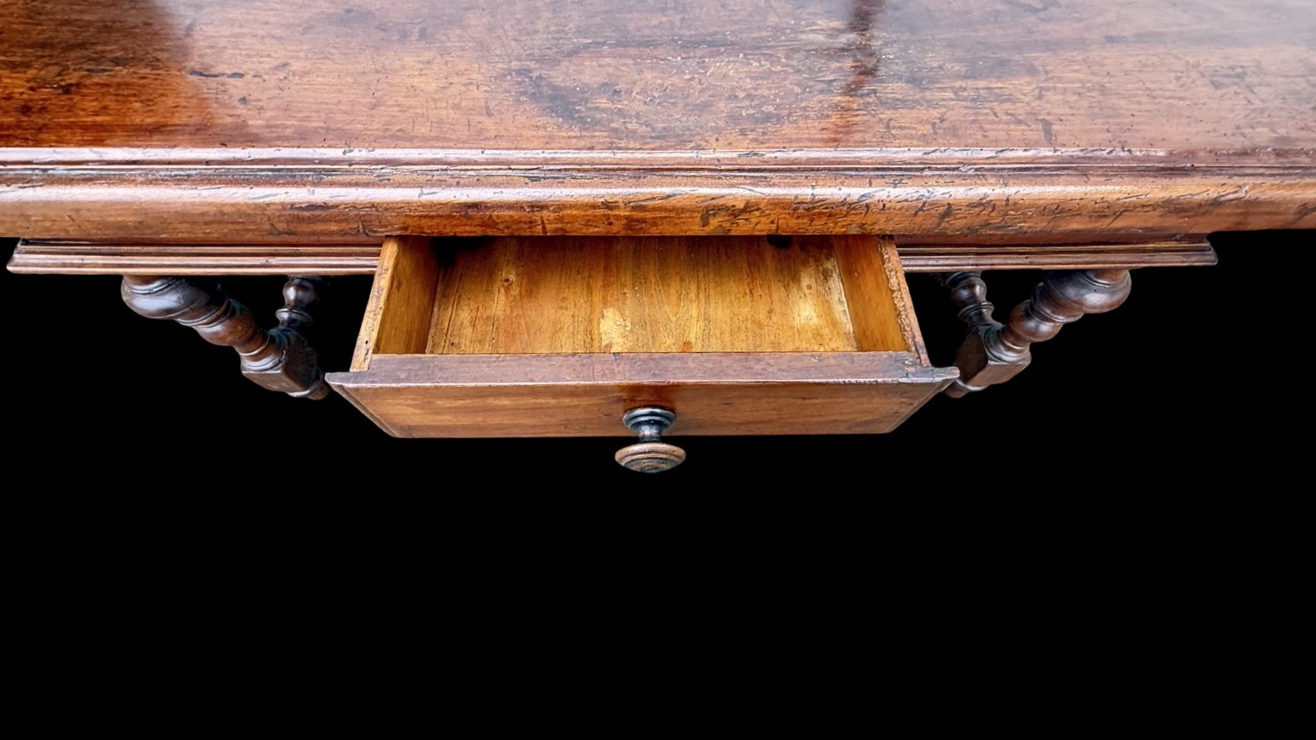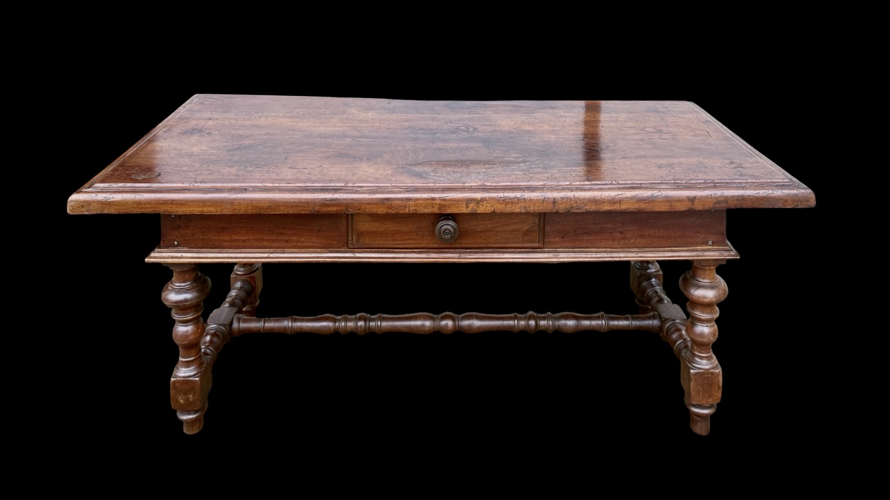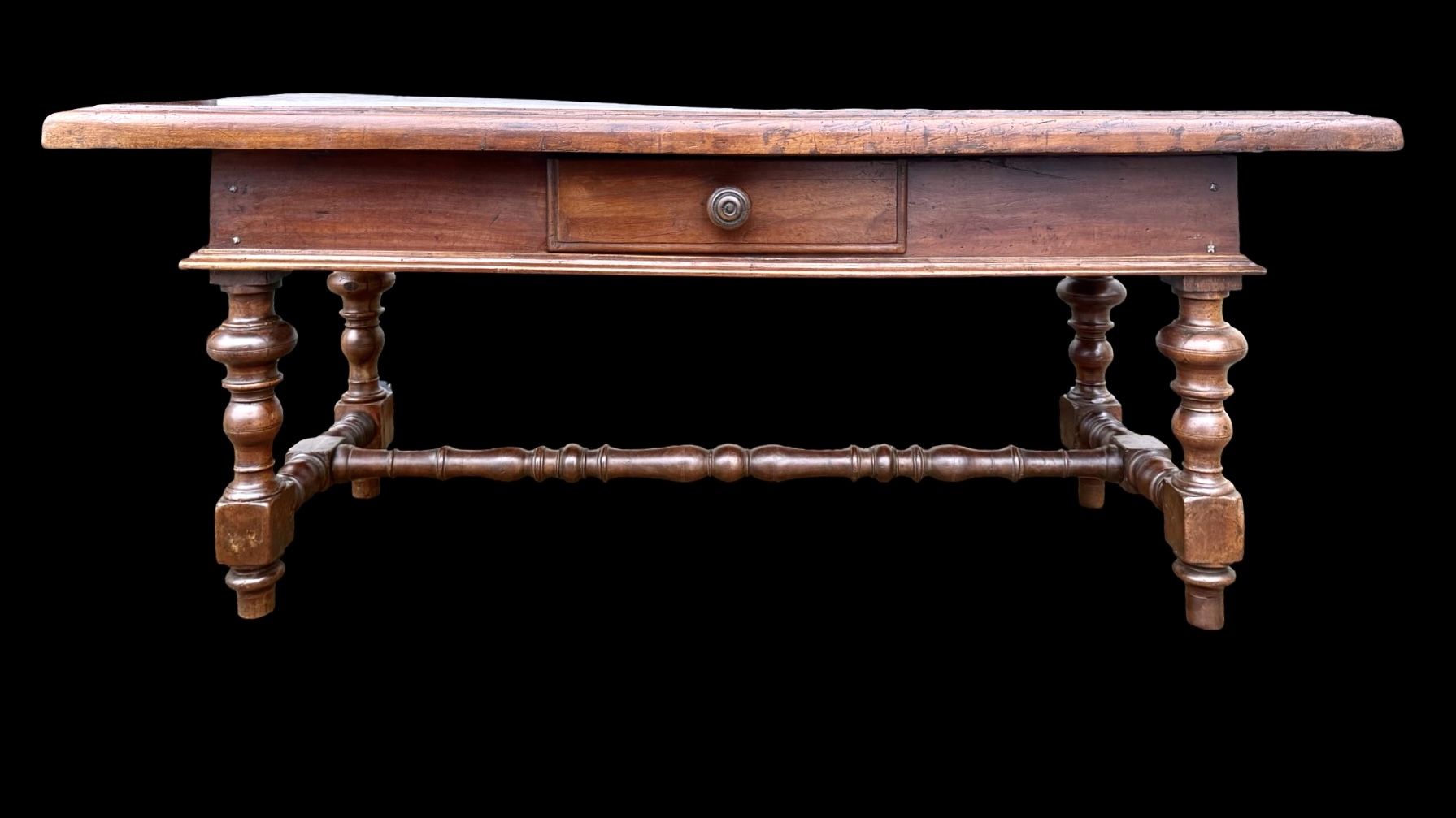 Solid walnut coffee table with drawer. Composed of furniture parts from the 17th century. (base probably from a Monetiere style cabinet and top from a chest of drawers). 132x59 cm. H: 54 cm.