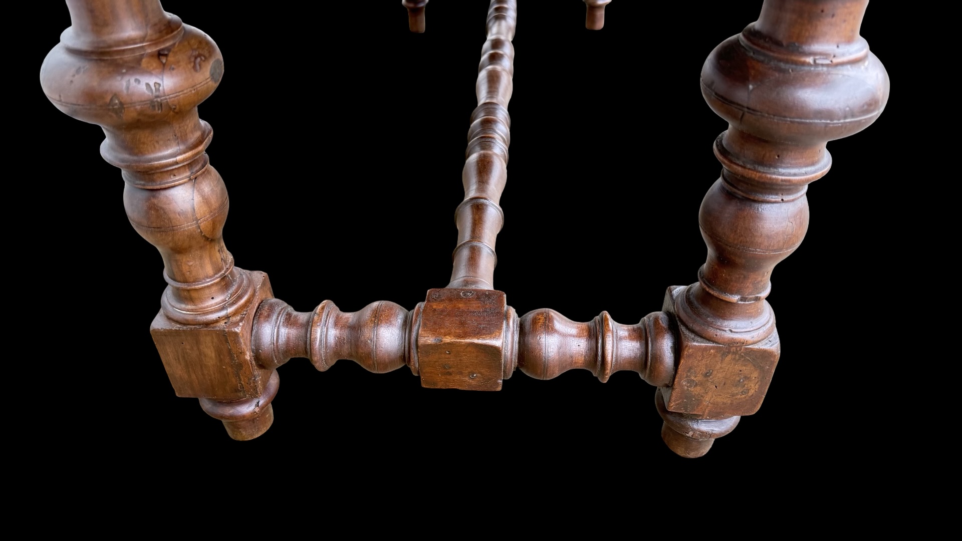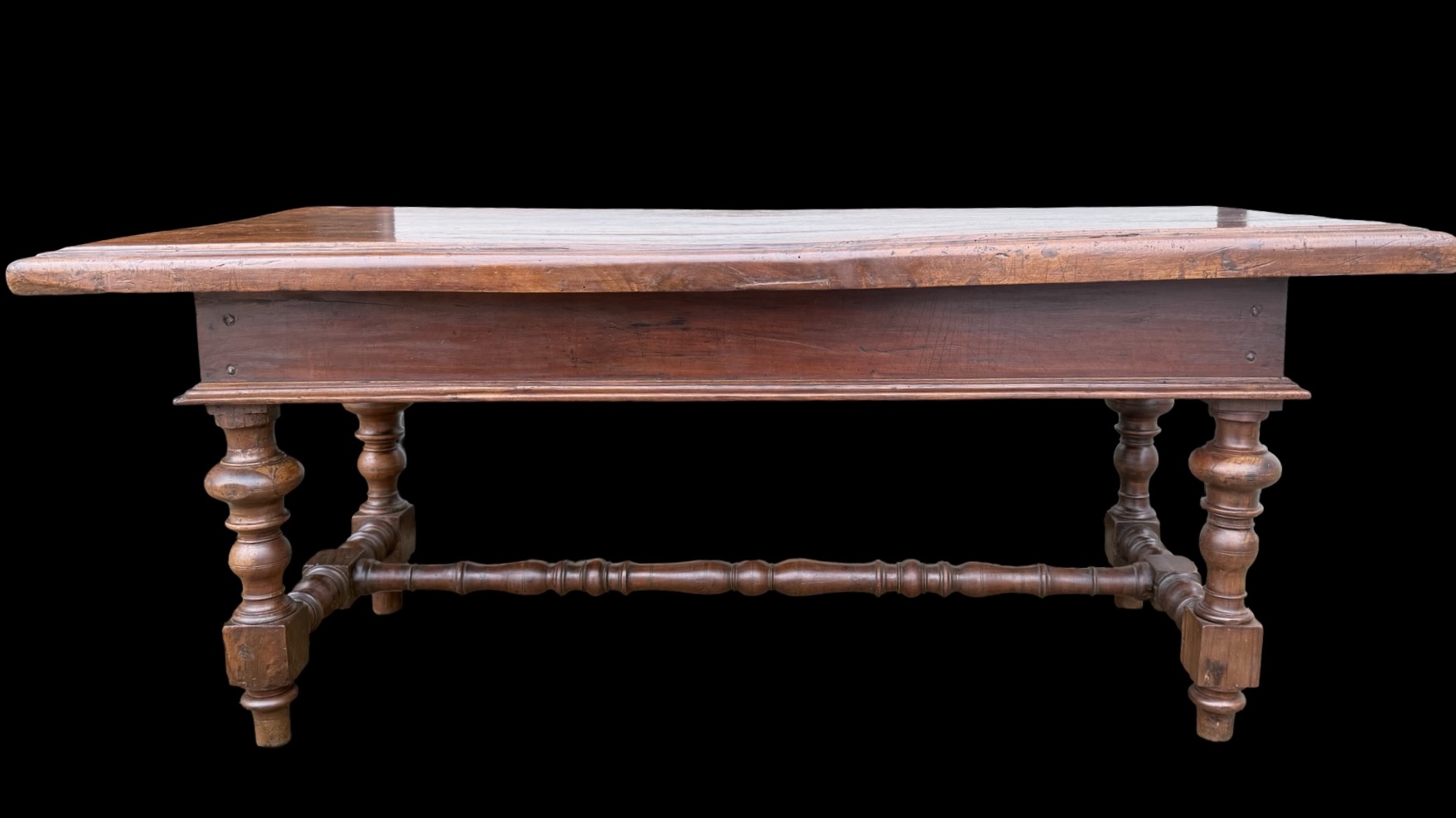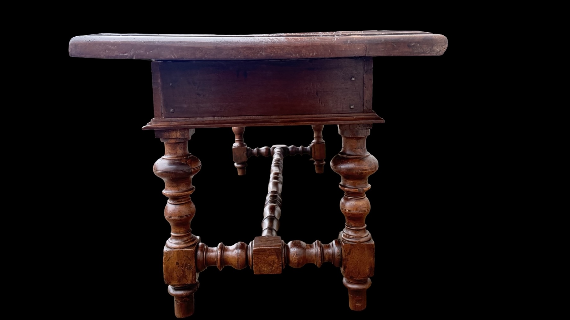 Solid walnut coffee table with drawer. Composed of furniture parts from the 17th century. (base probably from a Monetiere style cabinet and top from a chest of drawers). 132x59 cm. H: 54 cm.