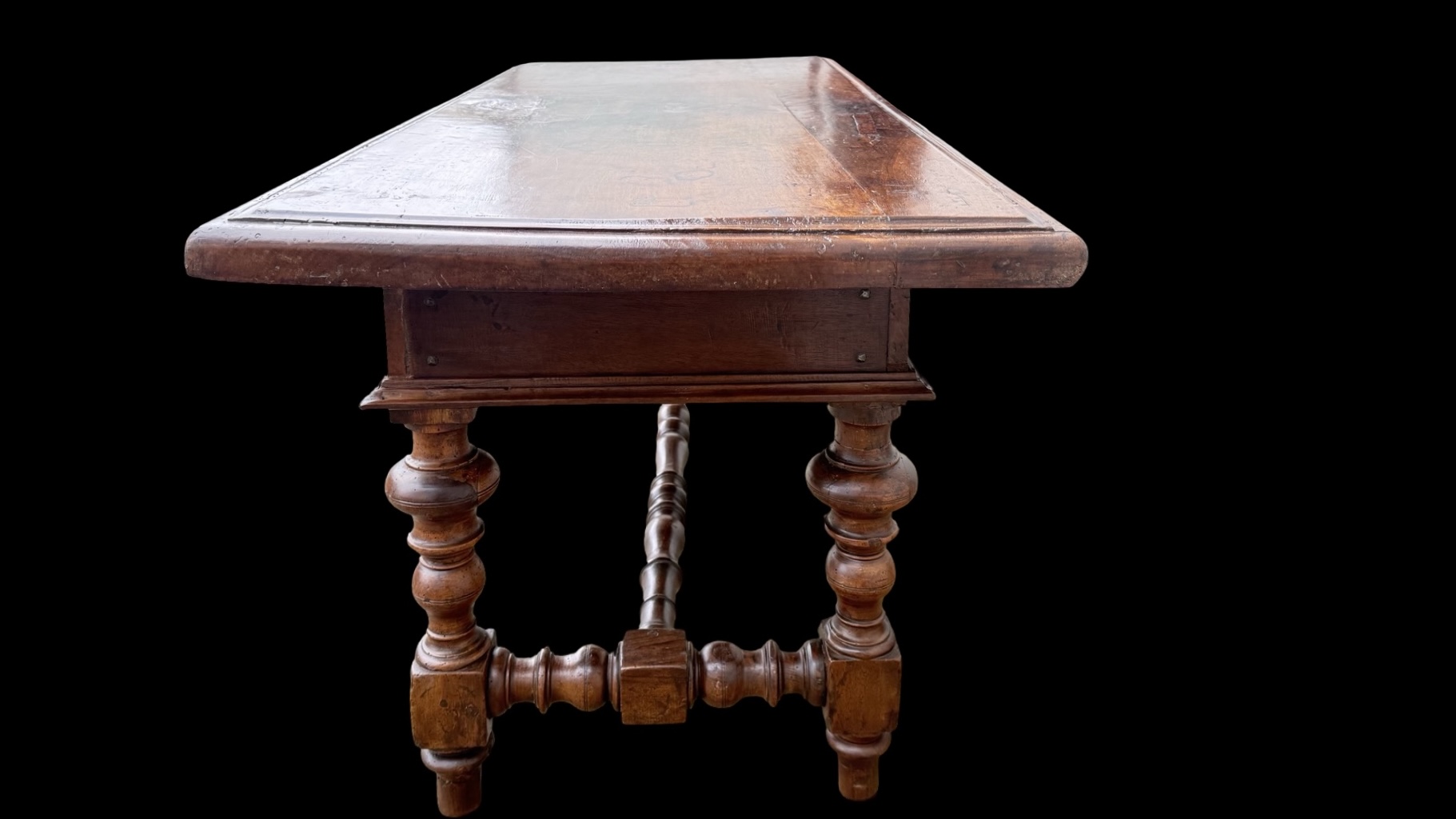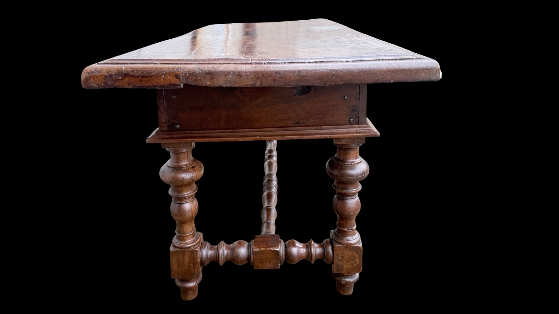Solid walnut coffee table with drawer. Composed of furniture parts from the 17th century. (base probably from a Monetiere style cabinet and top from a chest of drawers). 132x59 cm. H: 54 cm.