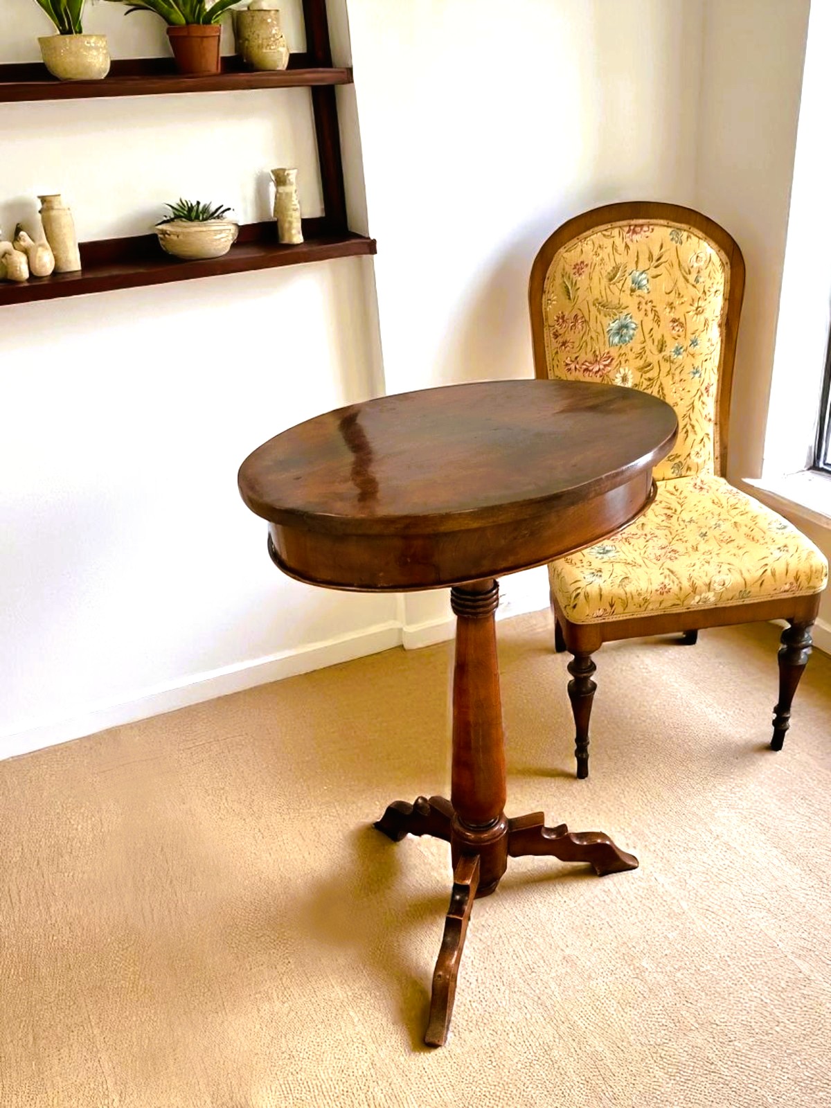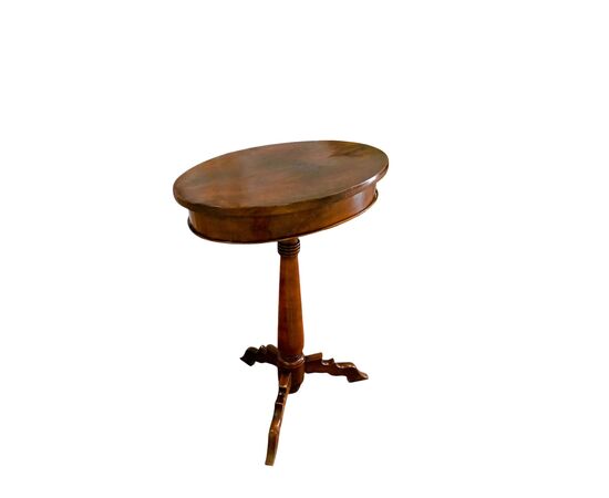 Il tavolino si distingue per il suo piano ovale, dalle proporzioni armoniose e raffinate, sostenuto da una gamba centrale tornita che si dirama in tre piedi, tipica lavorazione dell’epoca.
