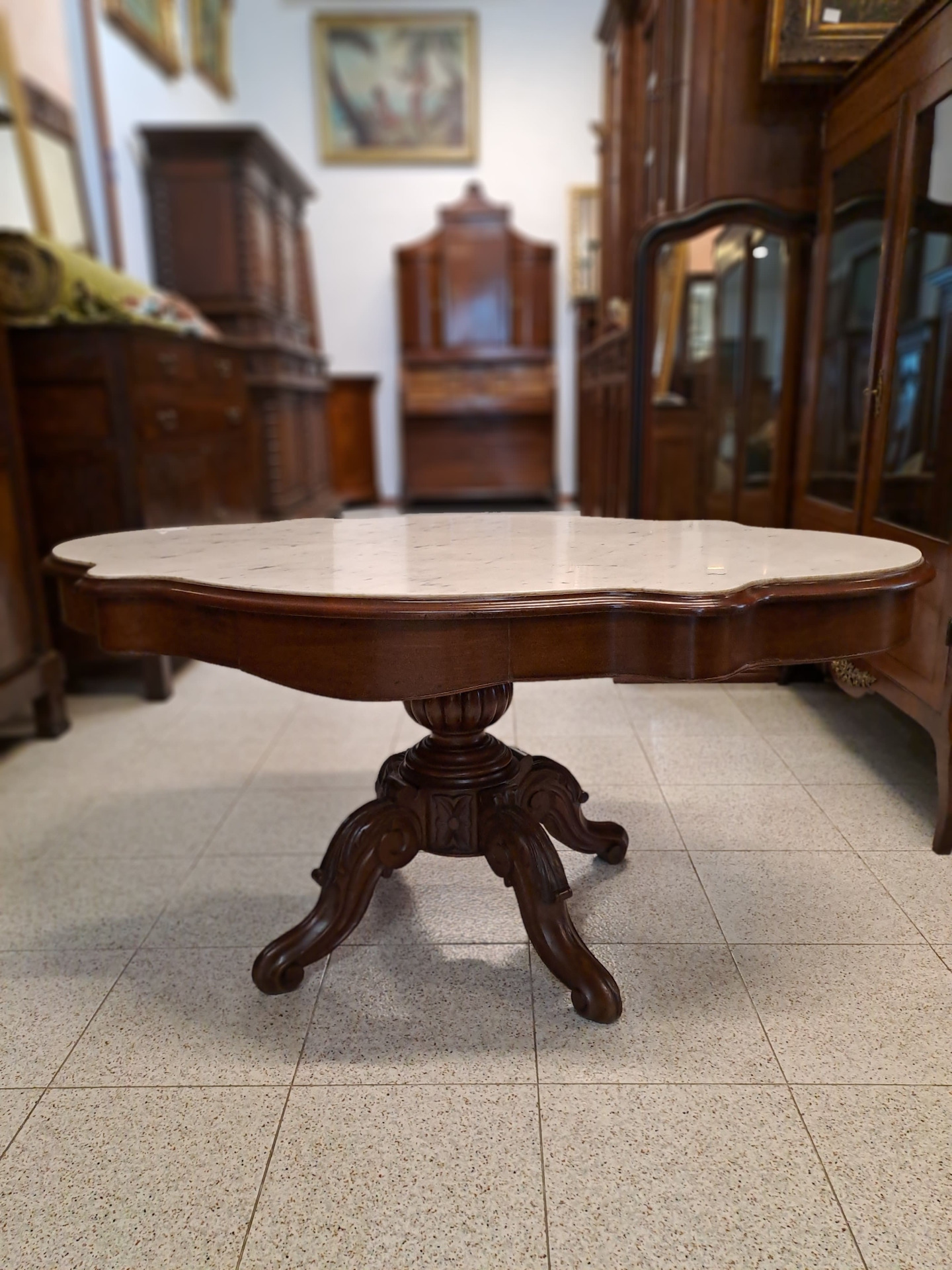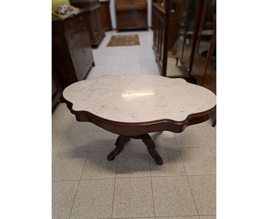in mogano, con piano in marmo. Dimensioni: Altezza 62 cm – 130 x 80 cm Spese di spedizione a carico cliente. Per maggiori informazioni: info@antichitadaziano.com