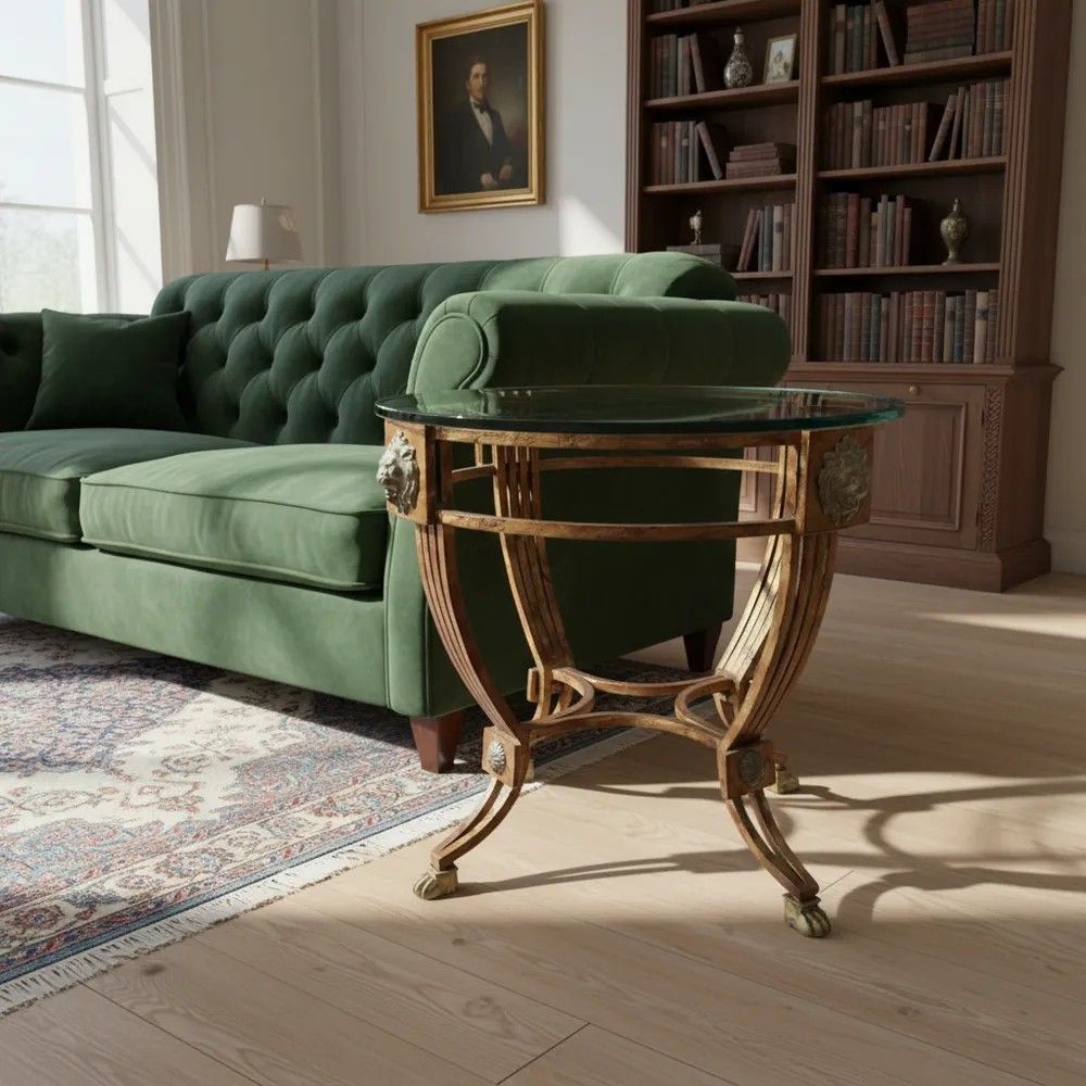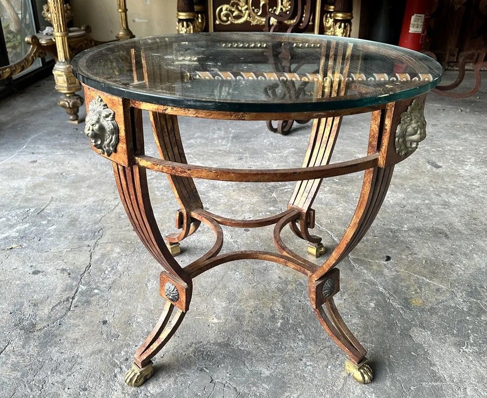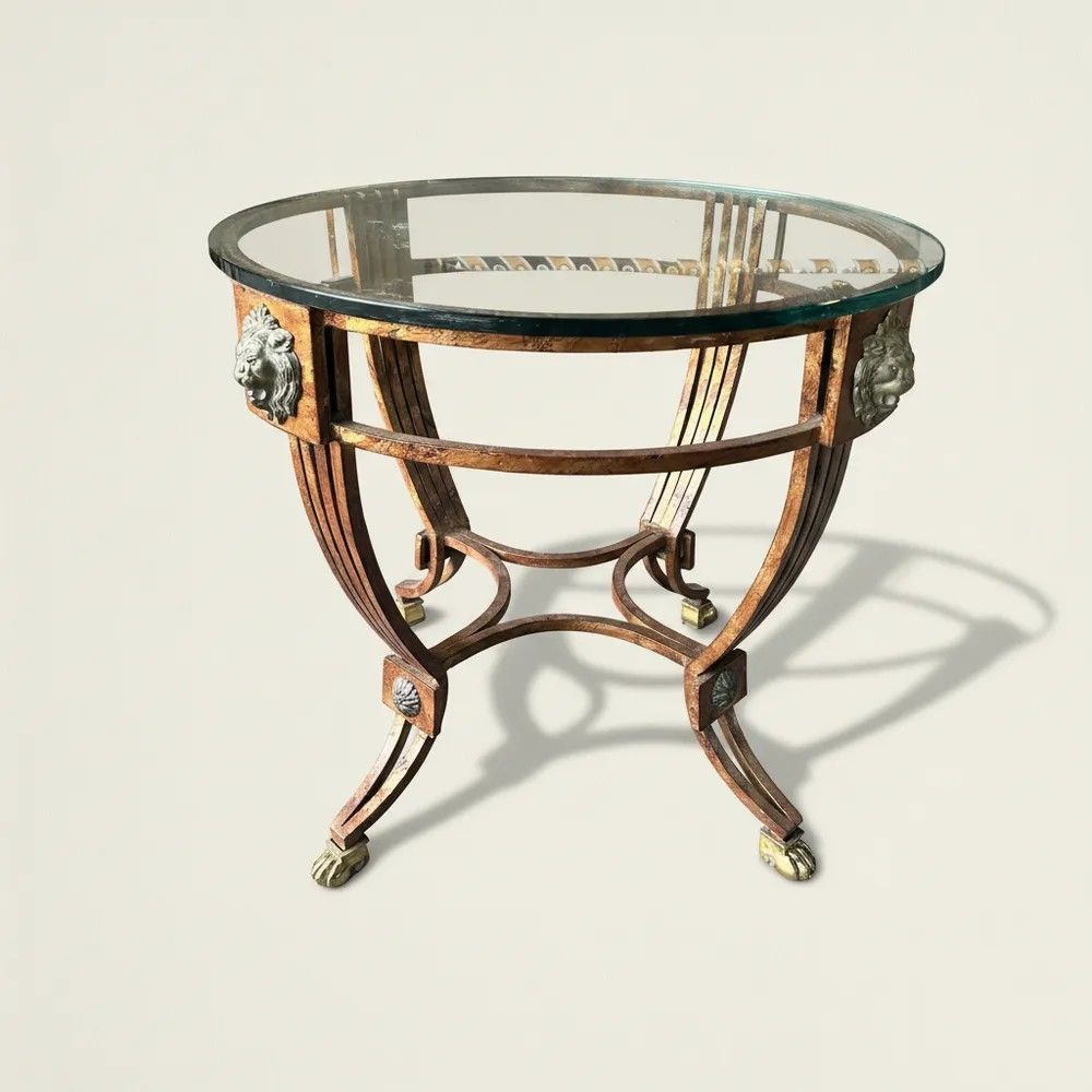 Questo raffinato tavolino in ferro bronzato proviene dall’Italia dei primi decenni del XX secolo e conquista al primo sguardo grazie alla sua estetica nobile e scultorea. La struttura circolare, composta da quattro slanciate lamelle di ferro sapientemente curvate, accoglie un solido piano in vetro molato che lascia intravedere l’eleganza dell’intelaiatura sottostante.Su ciascun supporto campeggia un’imponente maschera di leone in bronzo, simbolo di potere e protezione, che aggiunge un tocco monumentale al mobile. Alla base, i piedi a zampa felina in ottone dorato assicurano stabilità e continuità stilistica, creando un dialogo armonioso tra materiali e finiture.Materiale: ferro bronzato, e ottone doratoEpoca: XX secolo (circa 1900-1930)Stile: gusto neoclassico con richiami décoCondizioni: ottime, con leggera patina coerente con l’etàUtilizzo: coffee table, tavolino da centro, complemento d’accentoL’affascinante finitura bronzata, ottenuta con sapienti tecniche di ossidazione, restituisce calde sfumature ambrate che dialogano con la lucentezza del vetro. Il tavolino si inserisce con disinvoltura tanto in interni classici quanto in ambienti contemporanei, dove diventa protagonista assoluto grazie al suo carattere scenografico.Perfetto per esporre libri d’arte, una composizione floreale o un prezioso servizio da tè, questo pezzo garantisce valore aggiunto a salotti, ingressi o suite d’hotel di charme. Grazie alle dimensioni contenute, può essere facilmente collocato al centro di un’area conversazione o accanto a un divano.L’articolo è stato controllato dai nostri restauratori: la struttura è solida, il vetro privo di scheggiature, le applicazioni in bronzo ben fissate. Su richiesta offriamo servizio di imballo professionale e spedizione assicurata in tutto il mondo.Regalati o regala un oggetto dal fascino intramontabile, testimonianza della migliore tradizione artigianale italiana.Materiale: FerroAltezza (cm): 63Diametro: 56Epoca: XX Secolo - 1900