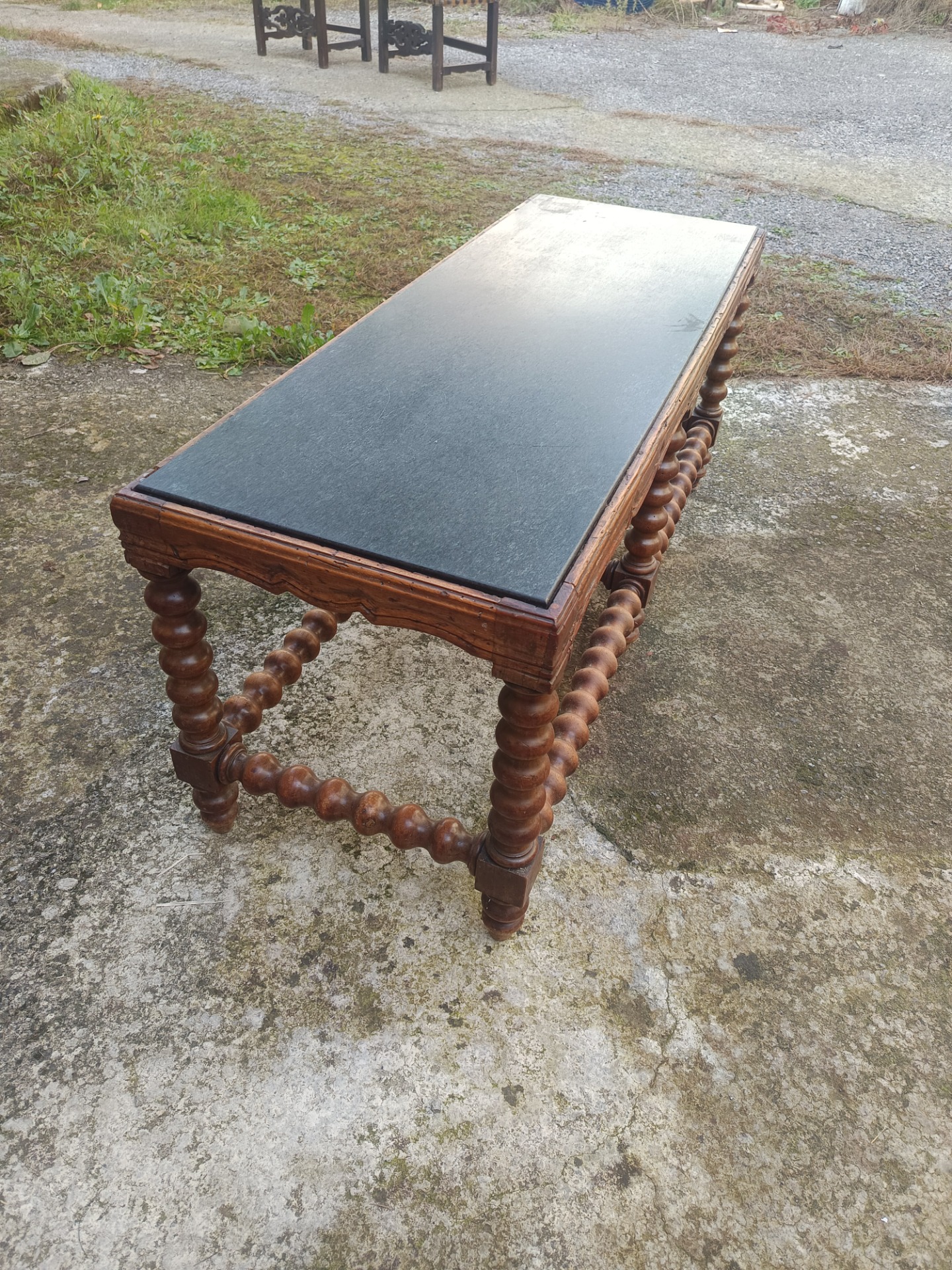Ex panca del Seicento trasformata in tavolo da salotto con aggiunta di un piano in marmo verde alpi. Misure: cm 115 x 41 x 50