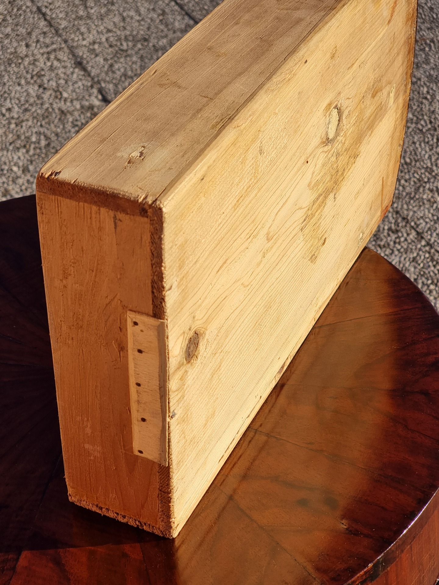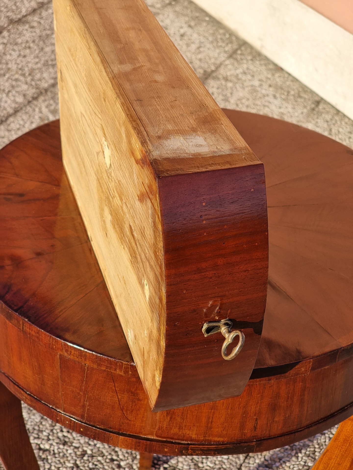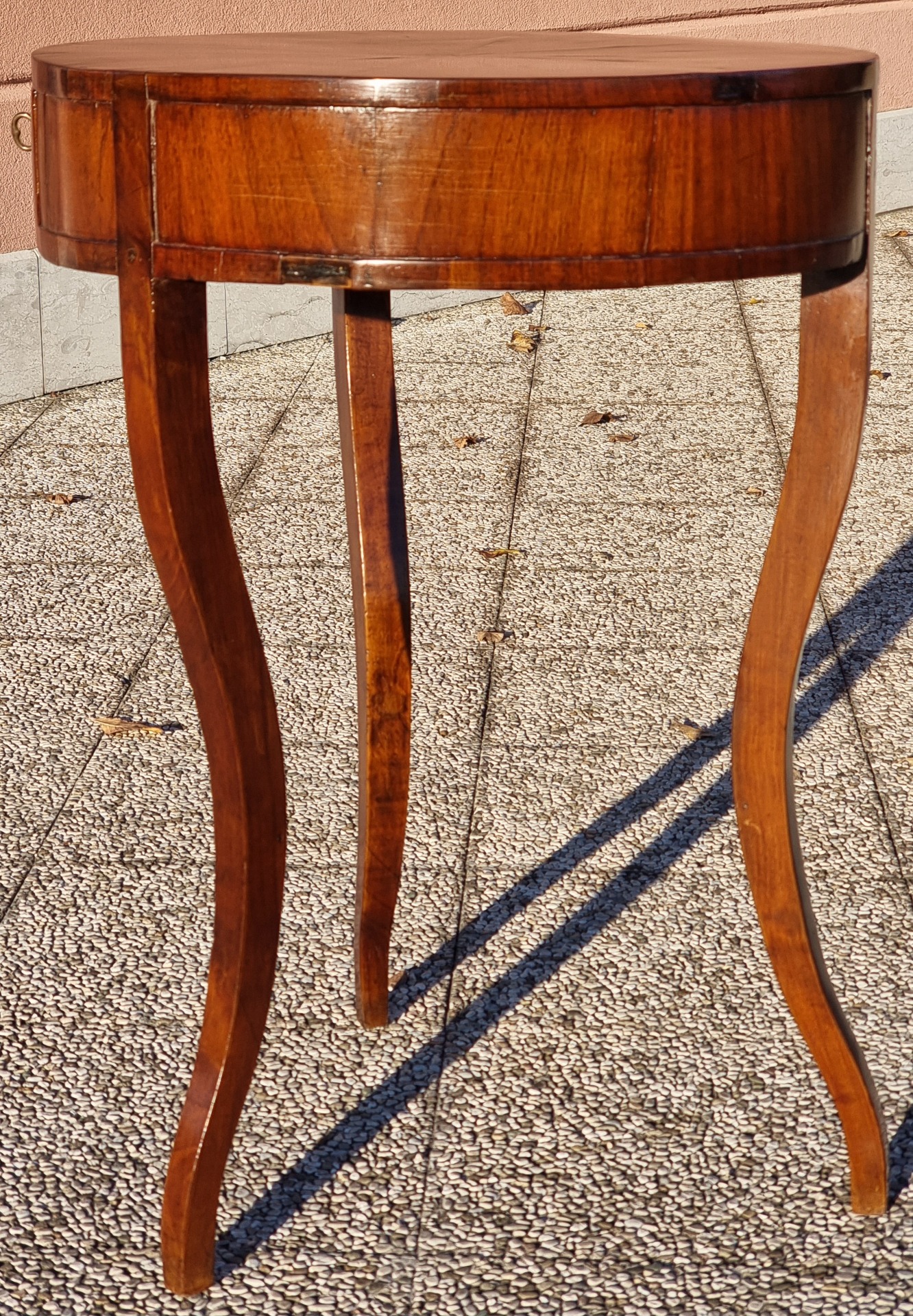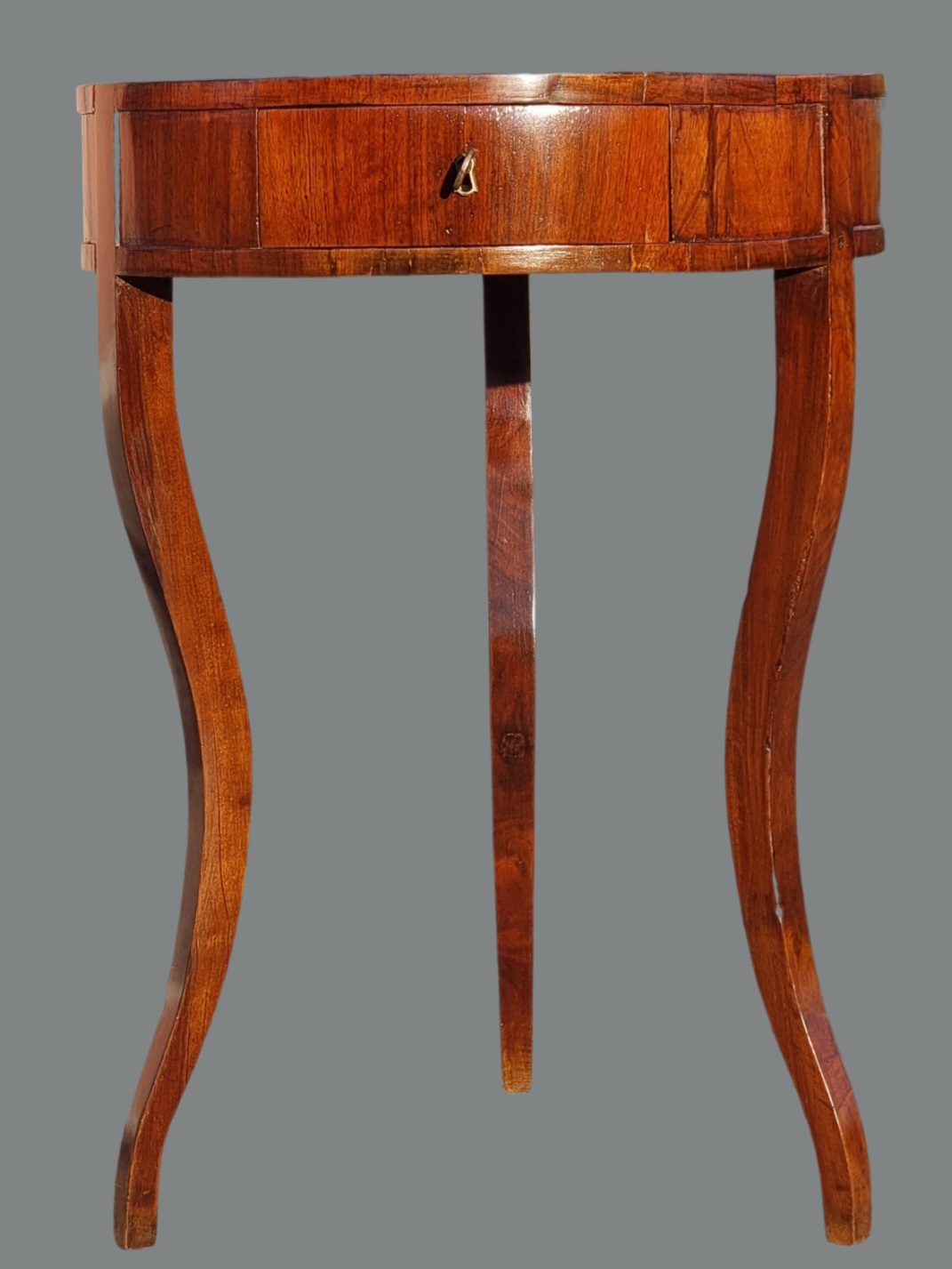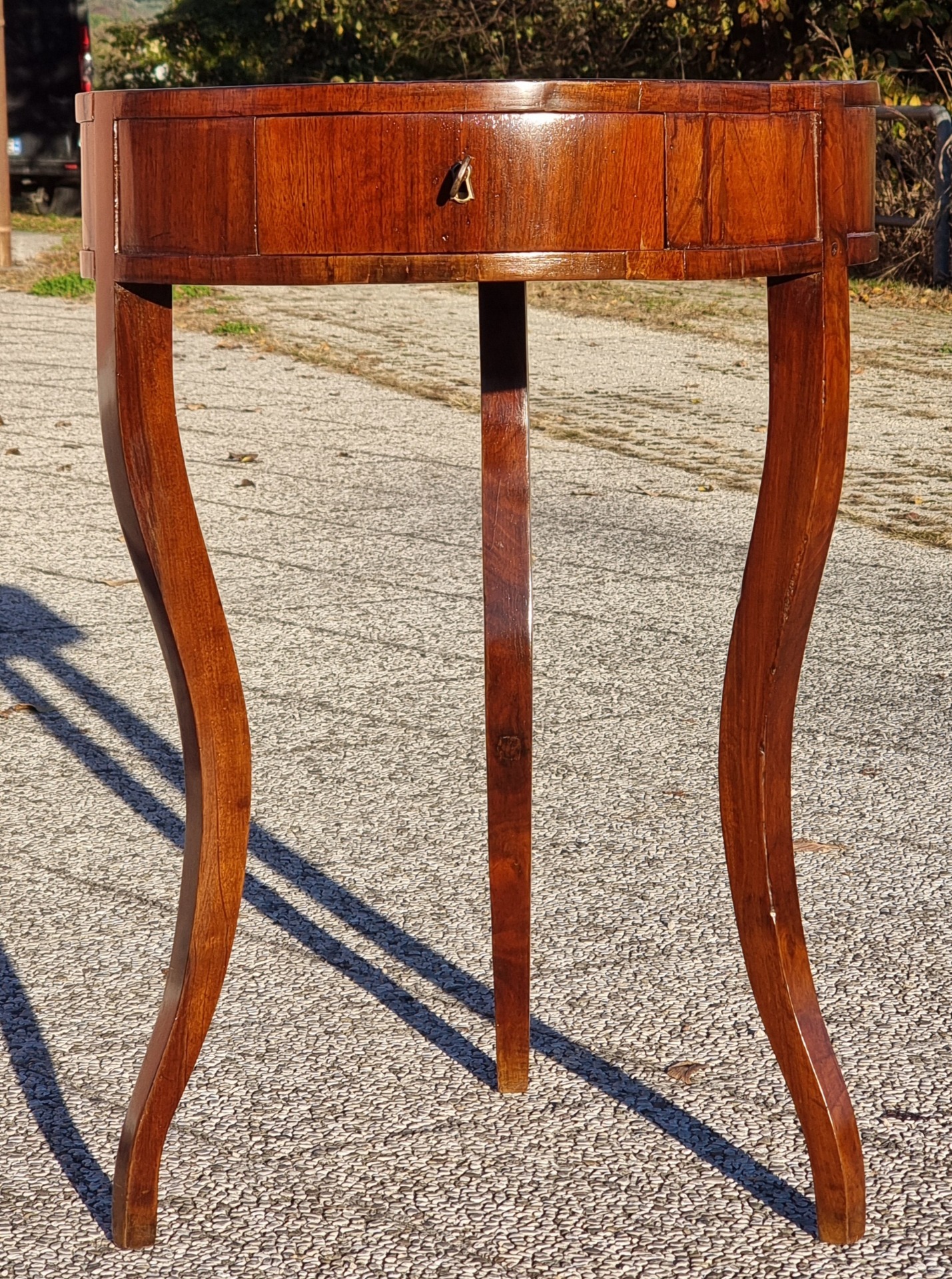 Elegant center table from the Veneto region, likely from Vicenza, dating back to the very early 19th century. The piece features a refined round walnut top with radial "segment" inlay, created by joining elements of wood chosen for grain and chromatic depth. The top, 55 cm in diameter, retains a beautiful antique patina and a typical Venetian craftsmanship from the late 18th and early 19th centuries. The edge of the top shows slight undulations and minor signs of use consistent with age; the surface shows normal wood settling and slight natural movement, without compromising its stability and legibility. On the back of the furniture, there are some antique replacements of the veneer along the lower edge, visible upon close examination. The belt is equipped with a front drawer; the lock has been replaced in recent times with a modern model, while maintaining the functionality of the opening. The structure rests on three elegant saber legs in solid walnut, which give balance and slenderness to the whole. Overall, the table is in good condition, with an excellent patina, authentic flavor of time and no structural issues. Measurements: – Diameter: 55 cm – Height: approx. 78–79 cm Note: authentic furniture, with normal traces of time and minor past interventions. For further information, photos or technical details, please do not hesitate to contact us. Worldwide shipping available with professional packaging.