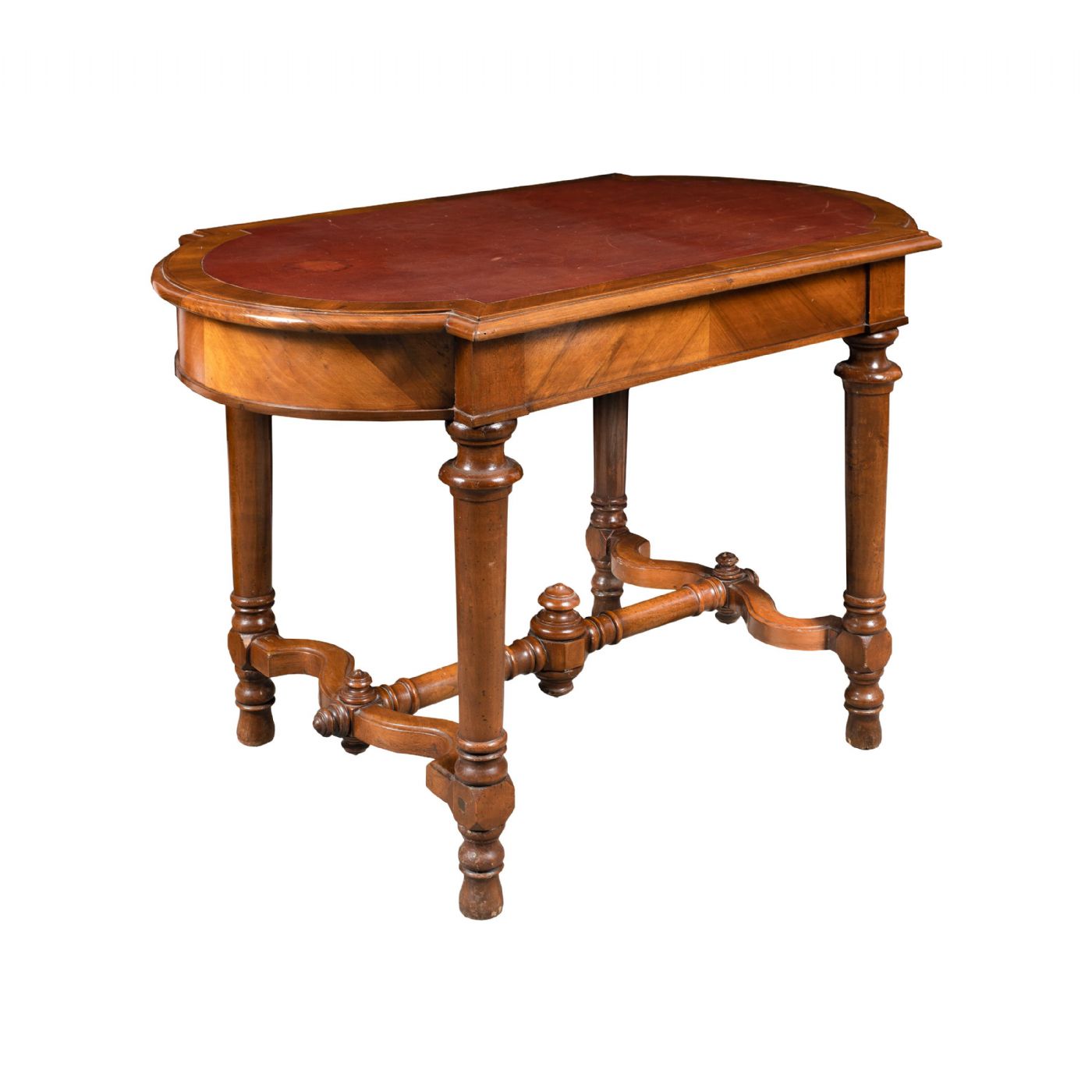 Made entirely of walnut wood, with turned legs and leather-covered top.