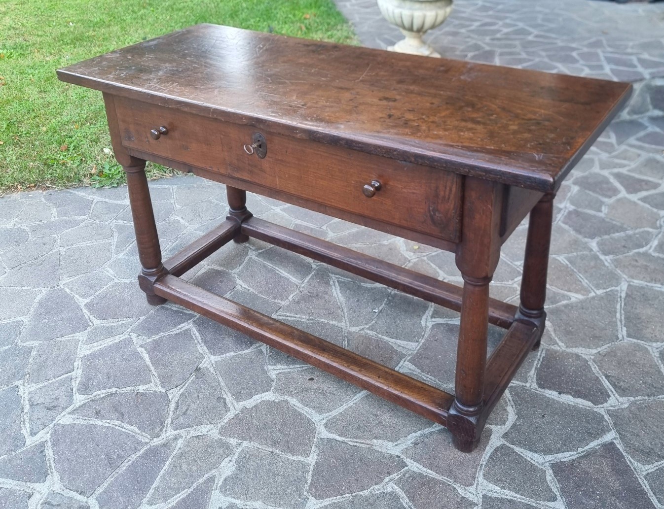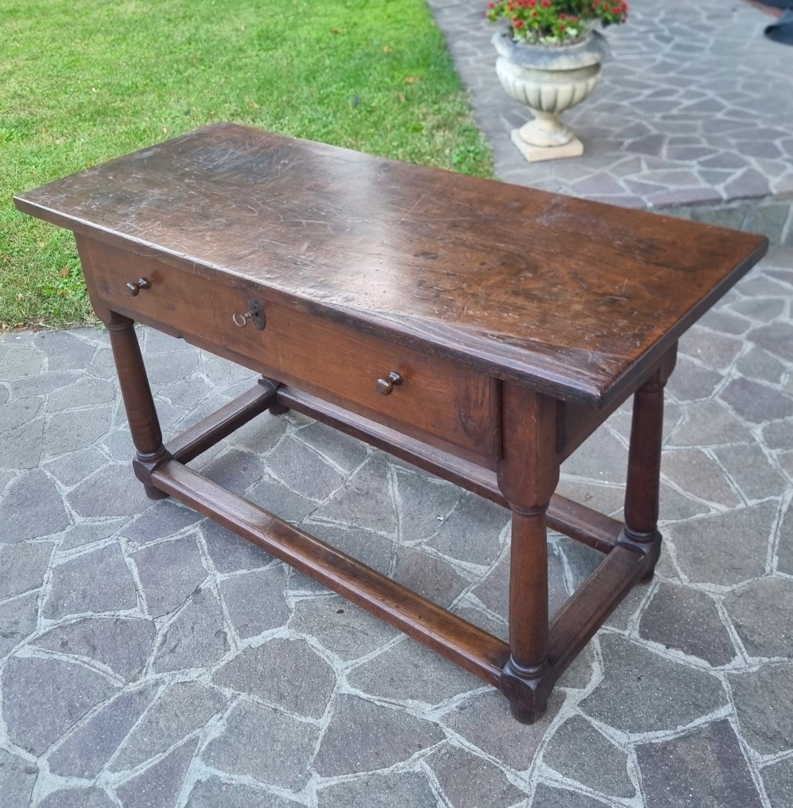 The oak, chosen for its hardness and durability, gives this table exceptional solidity. Furthermore, the manual workmanship of the time, visible in the joints and turned legs, testifies to the very high level of the 17th-century Tuscan artisans.