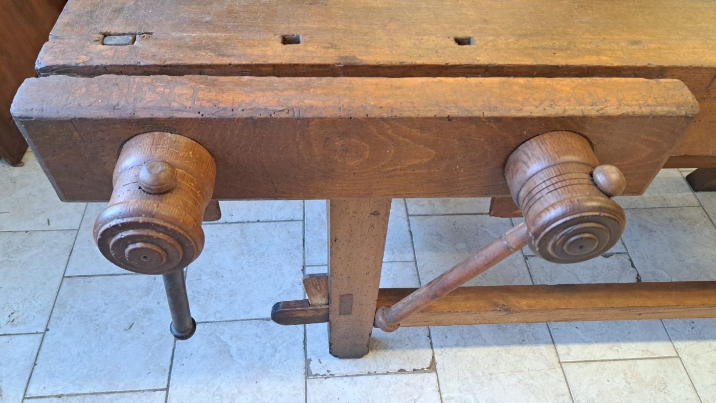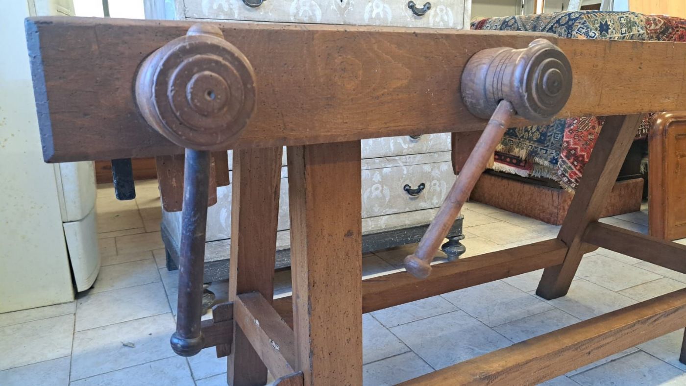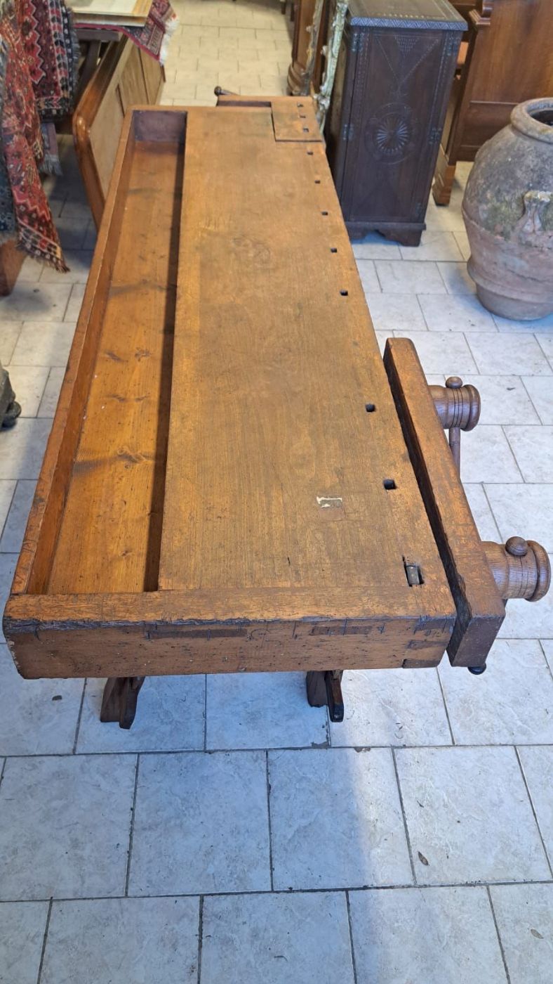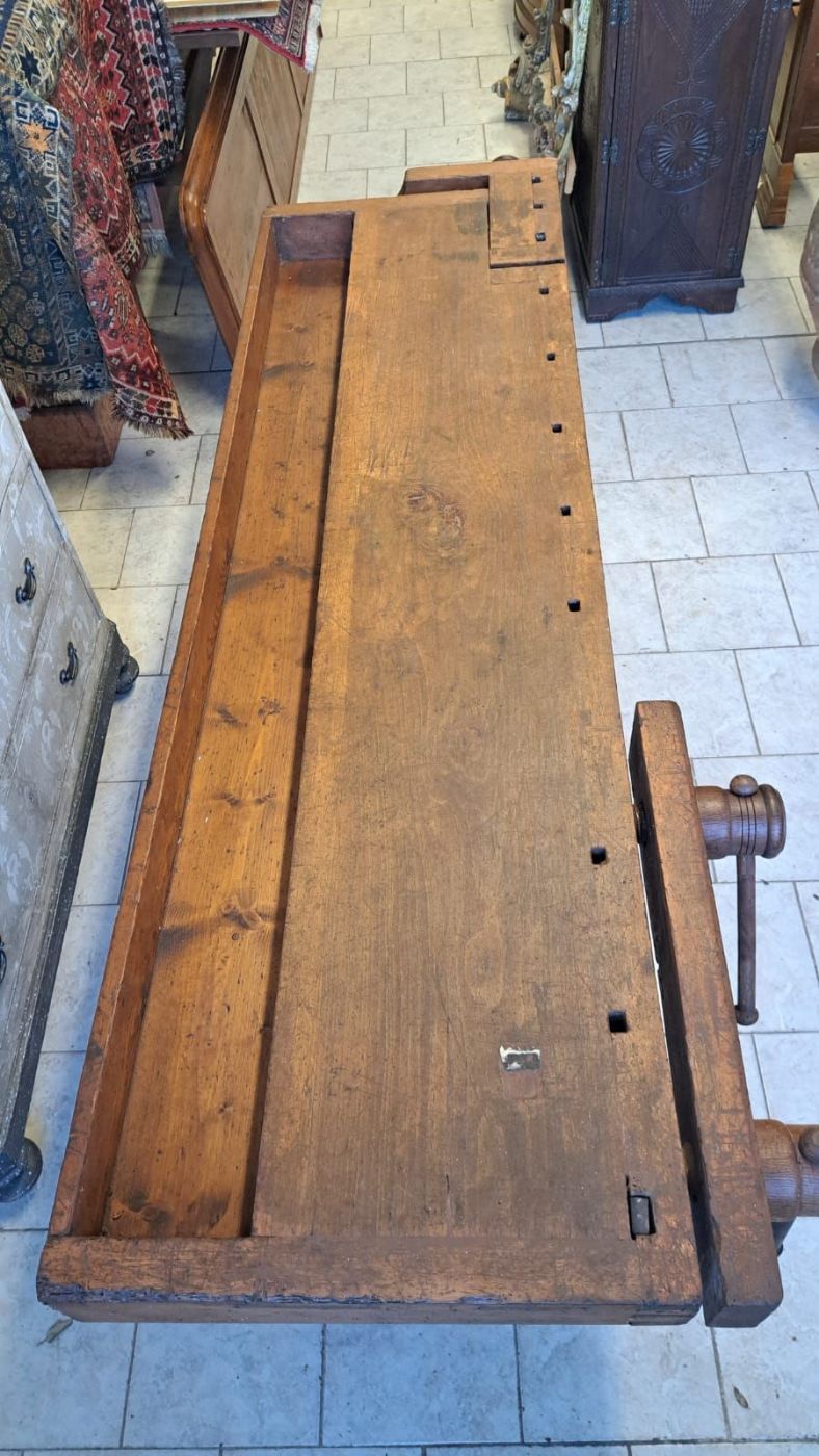 Beautiful and large 19th-century carpenter's workbench with a wooden triple vise. The table, already set in an old country house, has been restored and is therefore in optimal condition.Dimensions 220 x 78 height 86