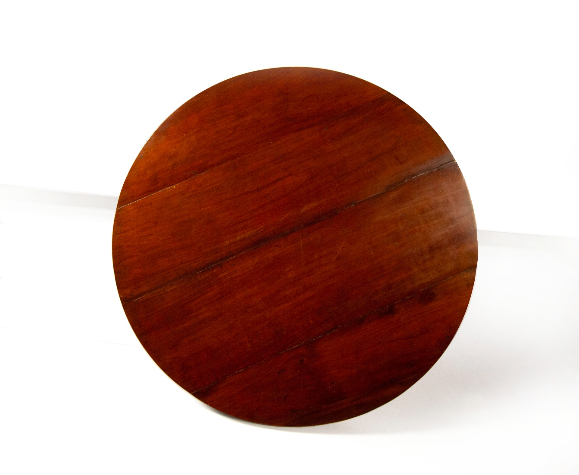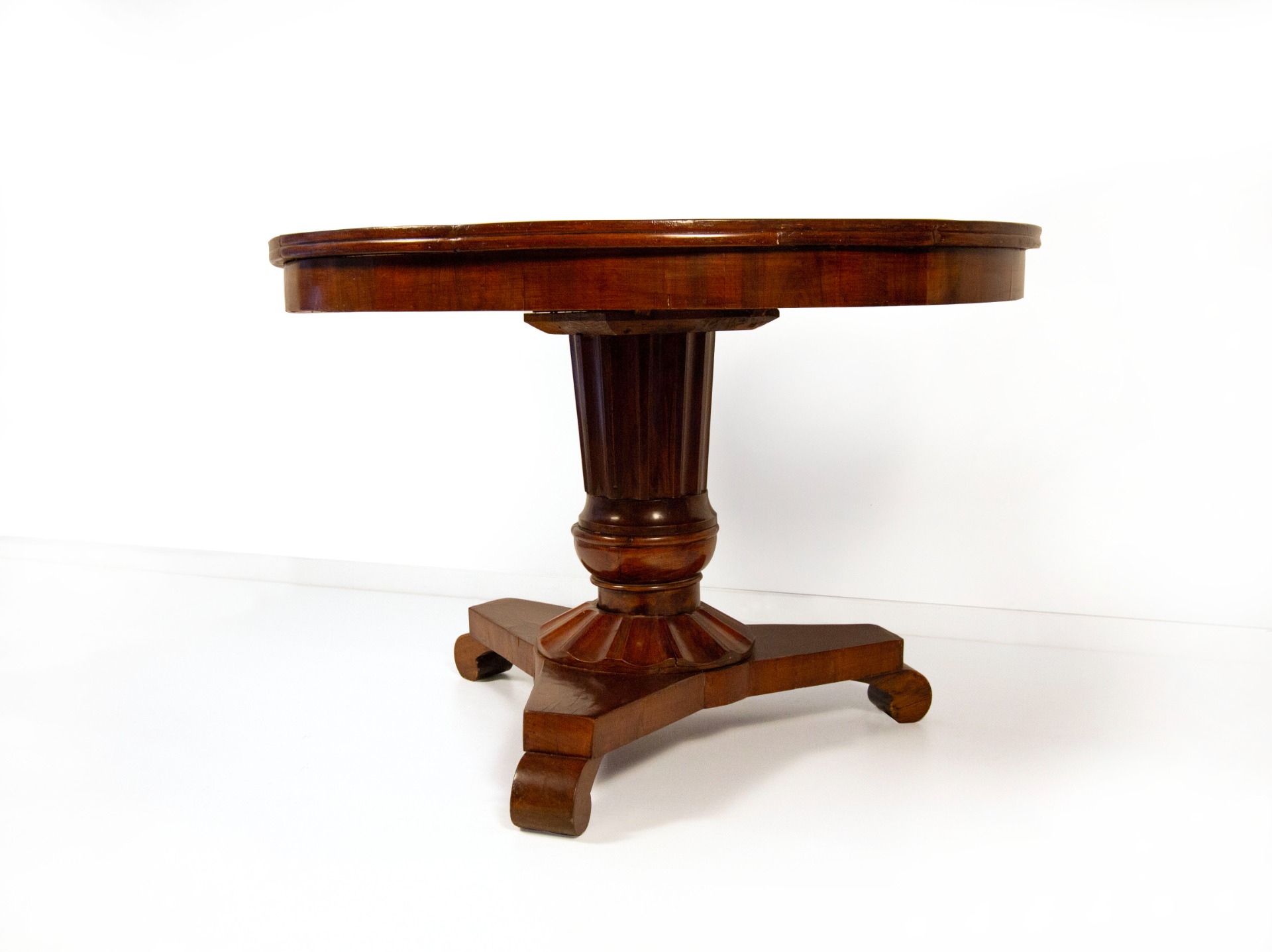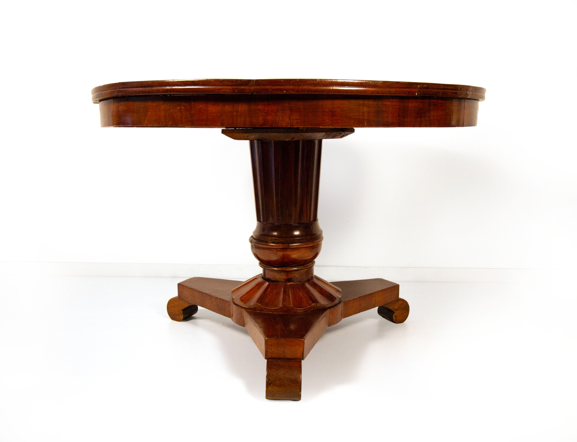 19th century walnut table, circular top, straight apron resting on a fluted and molded upright, tripod base on shaped scroll feet, cm 76x114