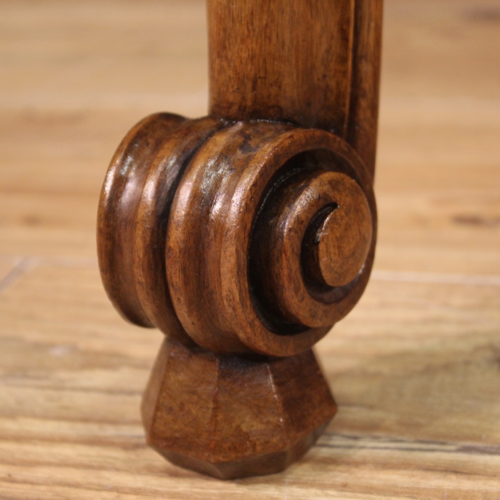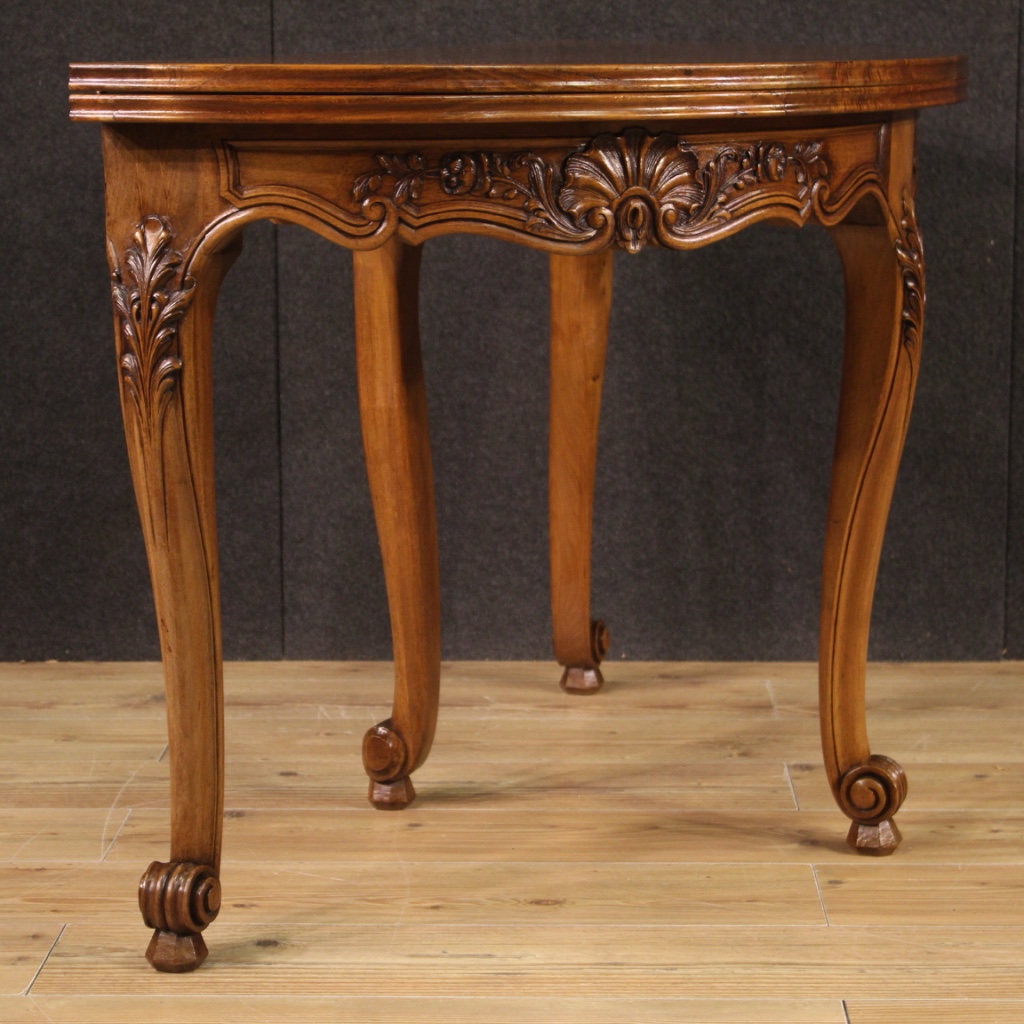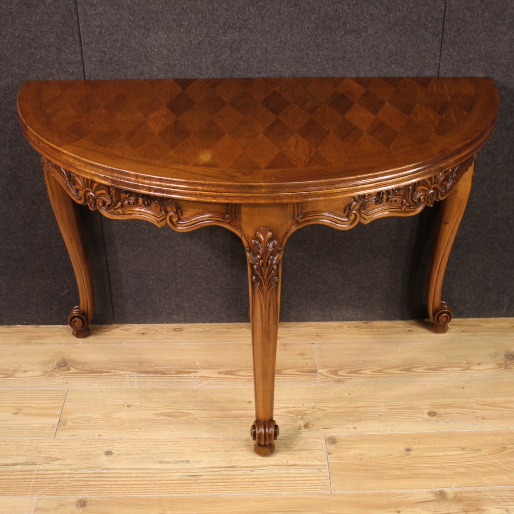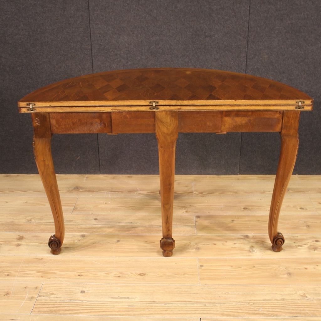 French table from 20th century. Demilune furniture carved and veneered in oak, beech and fruitwood of beautiful lines and pleasant furnishings. Table adorned with geometric decorations on the top which, once opened, reaches 120 cm in diameter, of excellent service. Furniture resting on four sculpted and moved legs with curled feet, of good stability. Ideal table to be placed in a living room or salon, for antique dealers and interior decorators. Furniture that shows some signs of wear, structurally sound, overall in a good state of conservation.