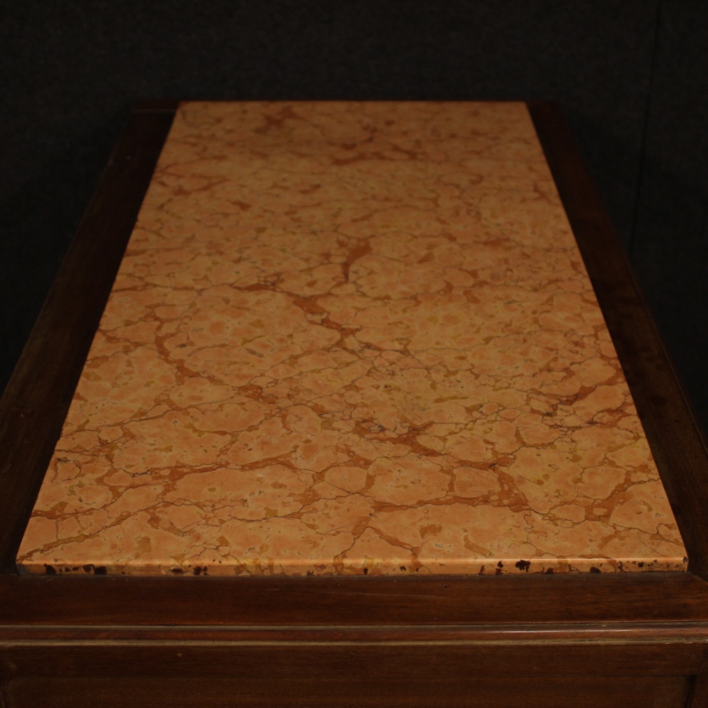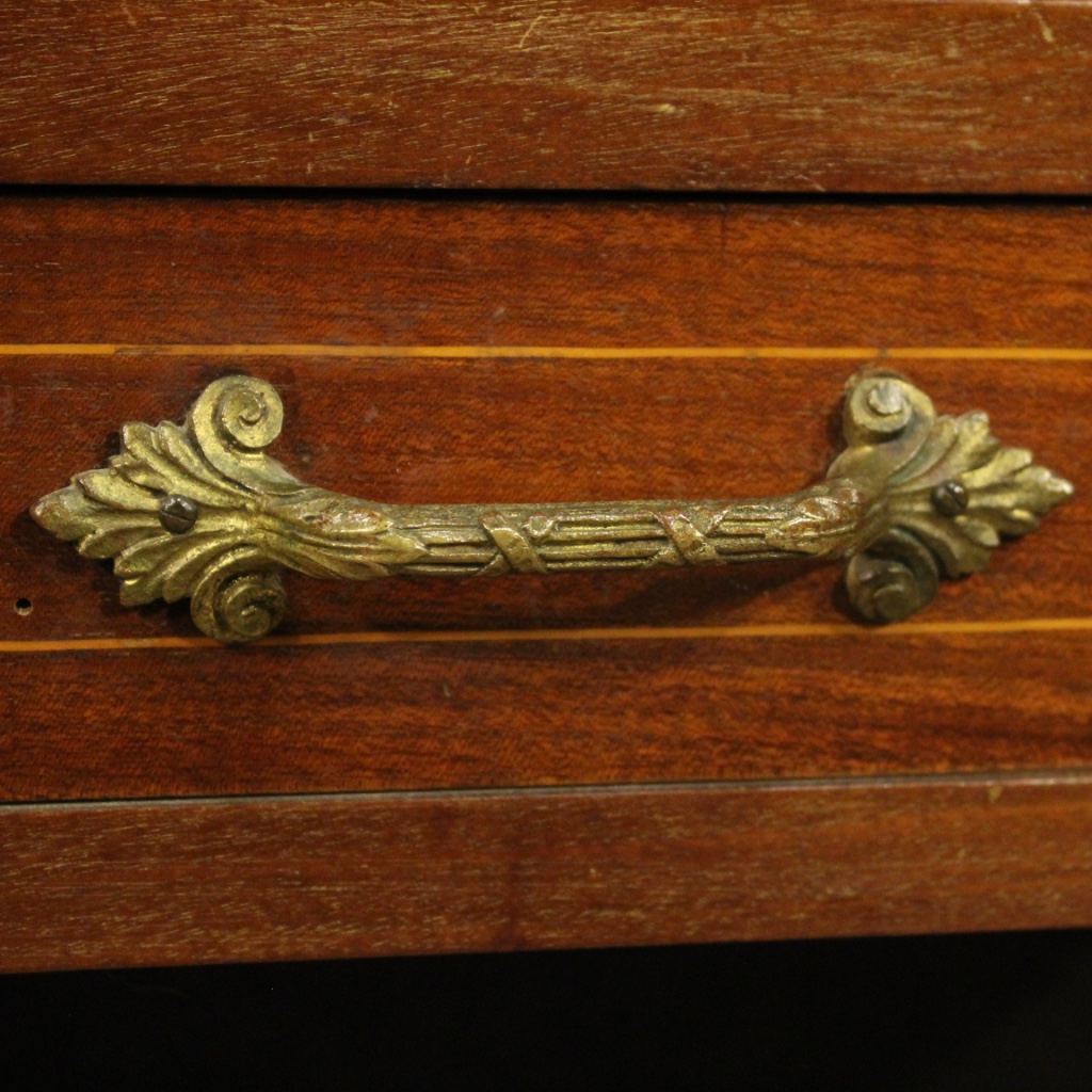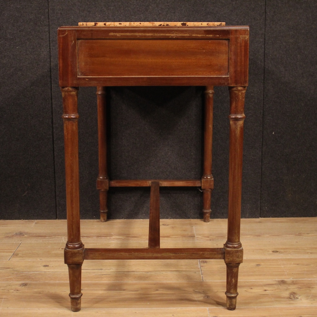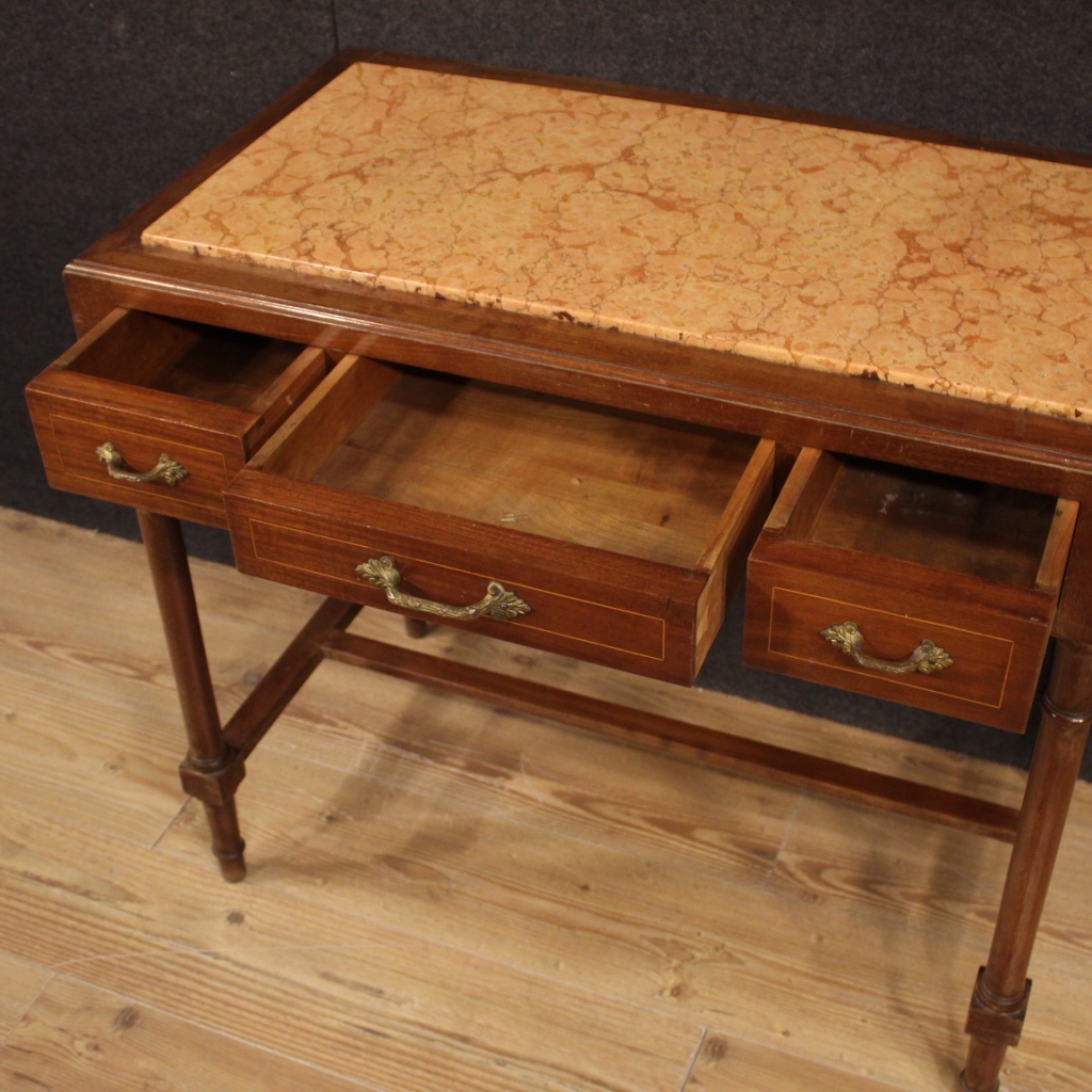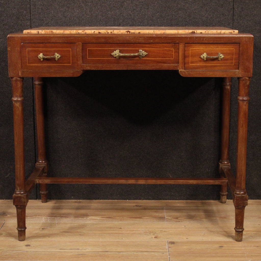 Italian table from the first half of the 20th century. Carved and inlaid furniture in mahogany and maple with decorations in gilded and chiseled bronze. Small desk equipped with three front drawers and recessed marble top of discrete size and service. Furniture of excellent proportion that can be easily placed in different points of the house. Dressing table adapted to a desk that carried a built-in mirror, now missing. It has some signs of aging, overall in fair state of conservation.