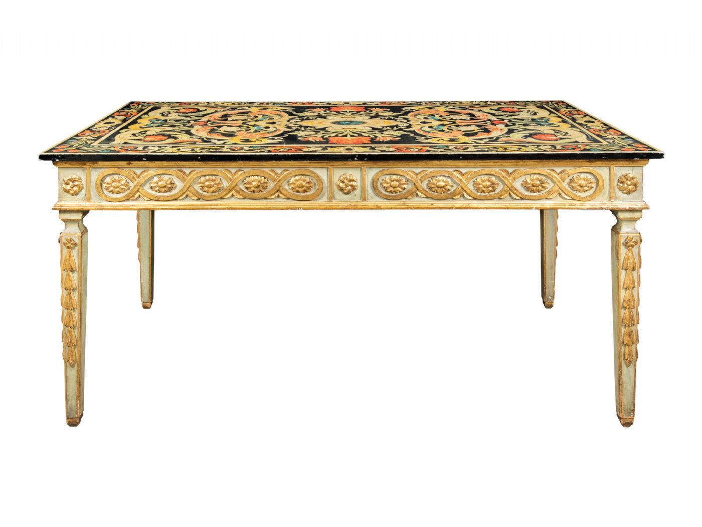 Entirely in carved, lacquered and painted wood, with golden festoon decorations on a cream-colored background. Top entirely painted with vegetal motifs simulating scagliola (some defects and small lacks).