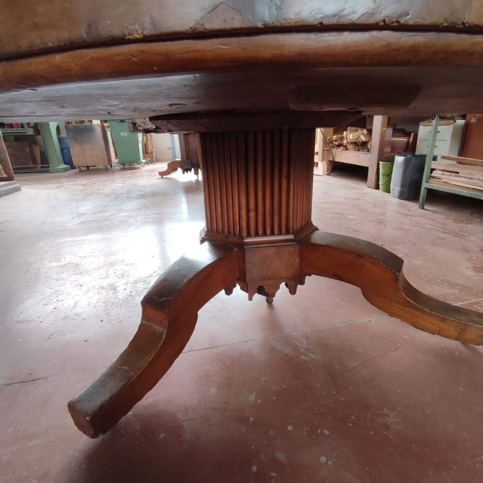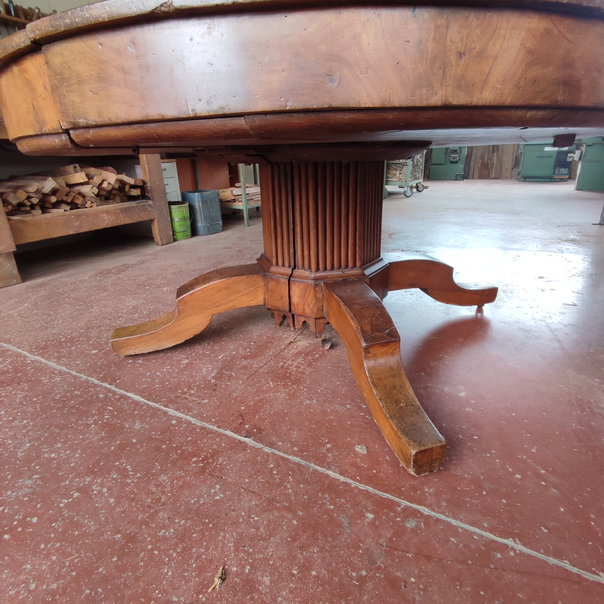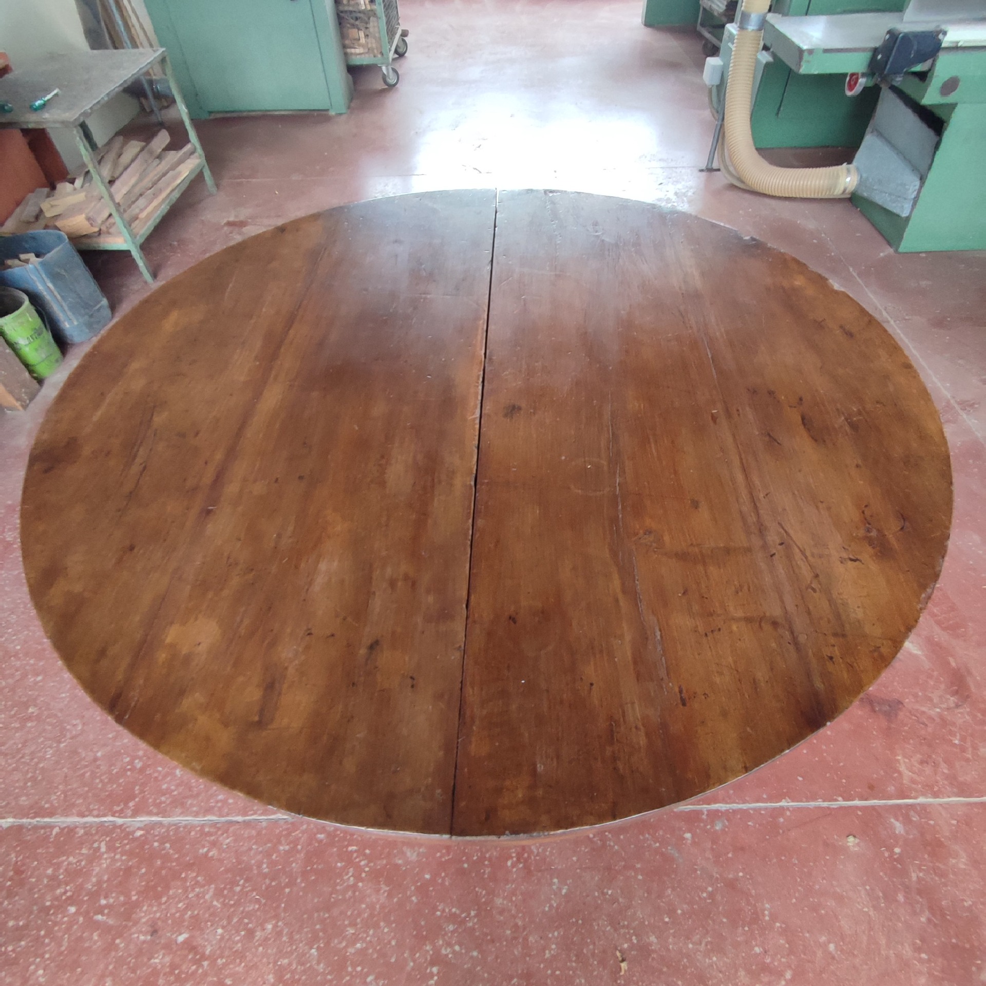 Large round extendable walnut table with support leg. Early 1800s period.Measurements: