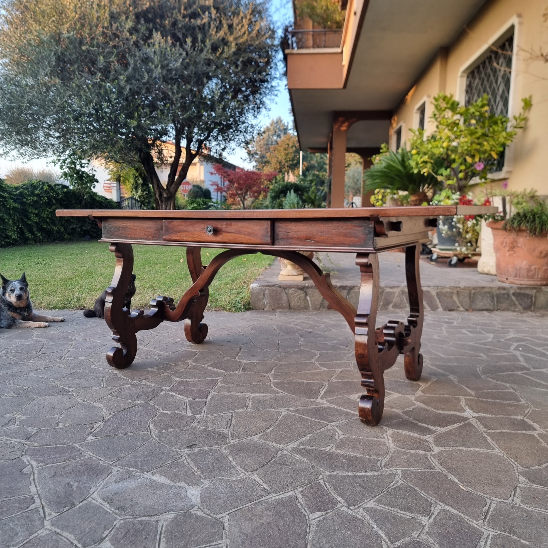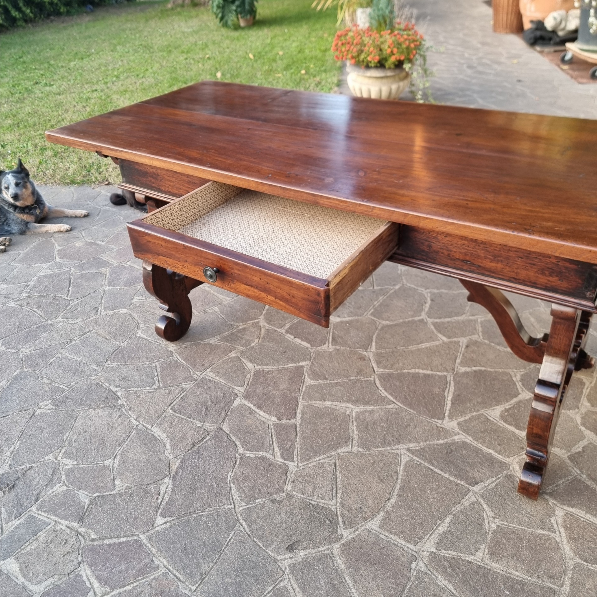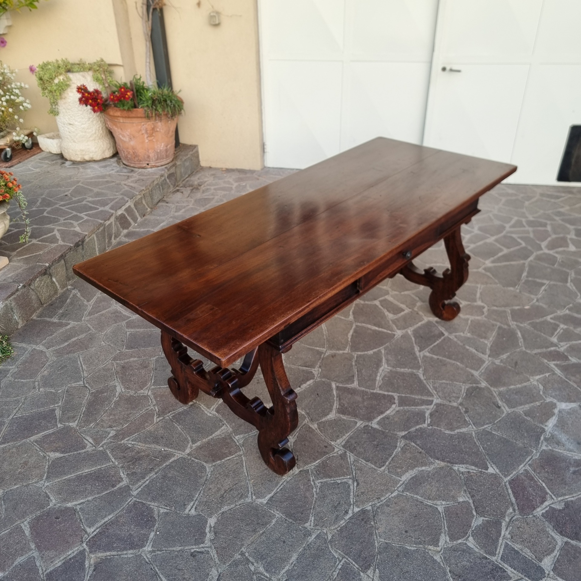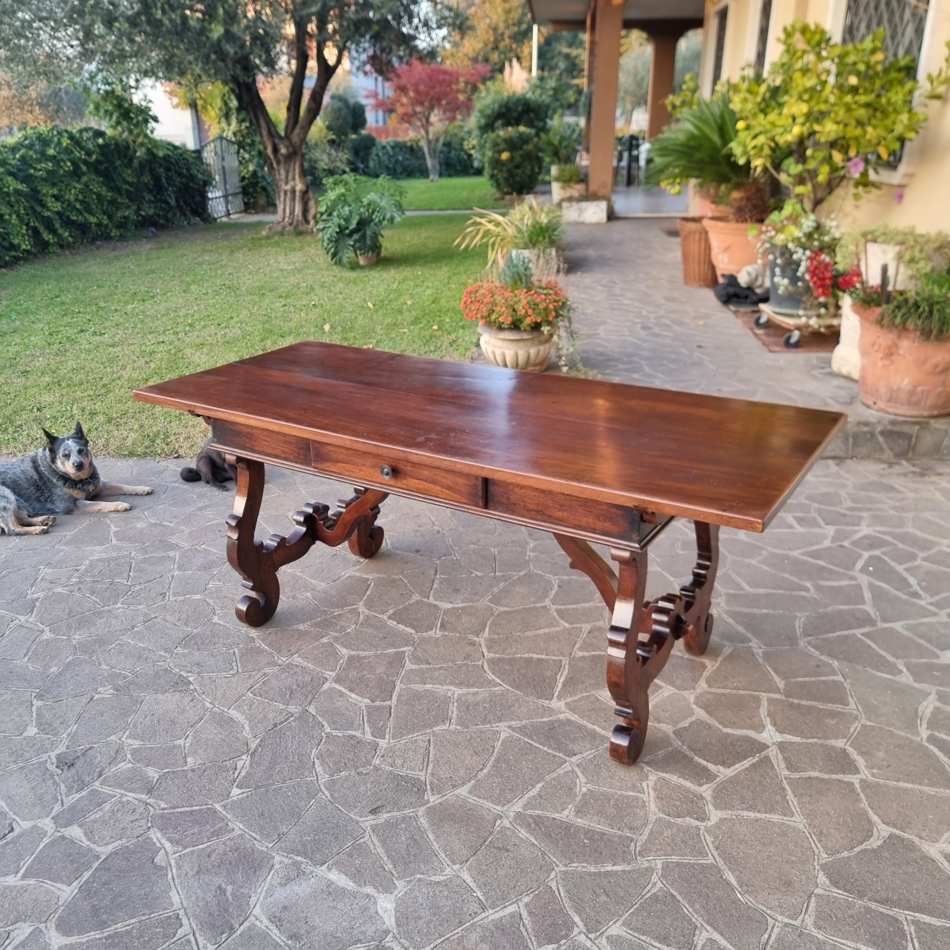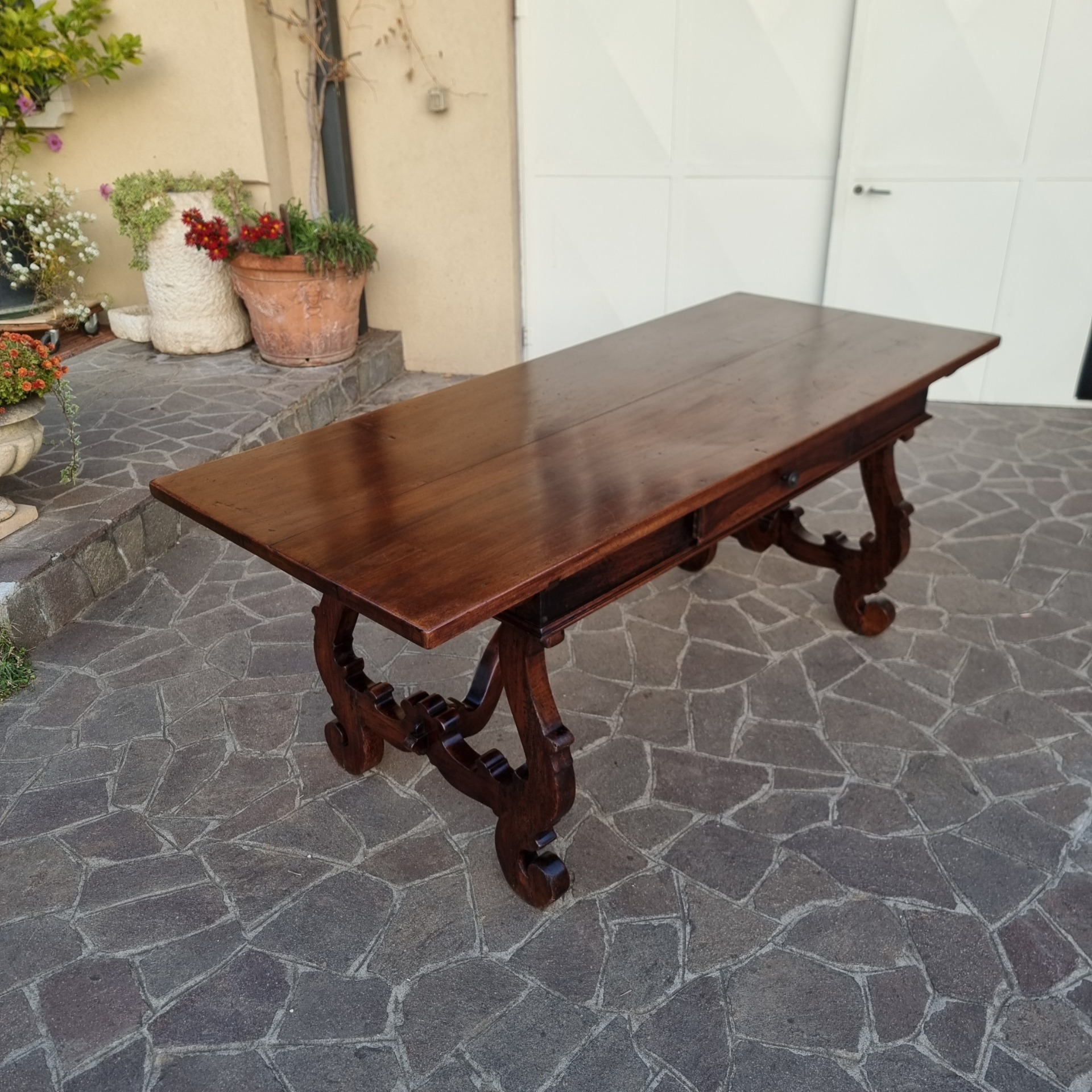 This large refectory table, made of solid walnut, represents an excellence of the Tuscan tradition of the 1800s. Characterized by simple but robust lines, the design preserves the balance between functionality and beauty typical of the period.