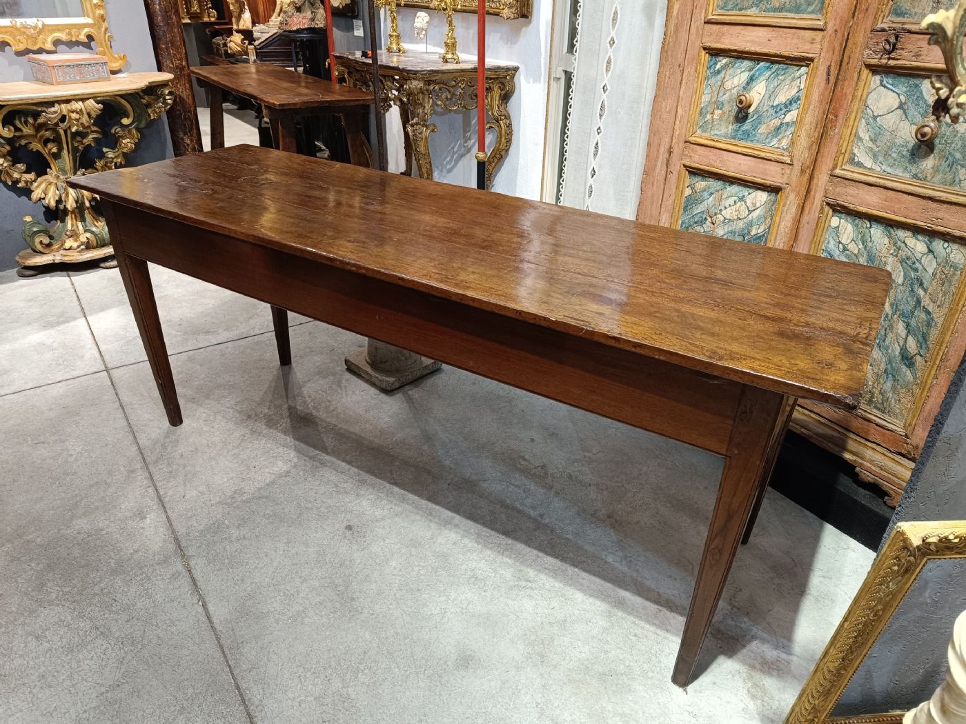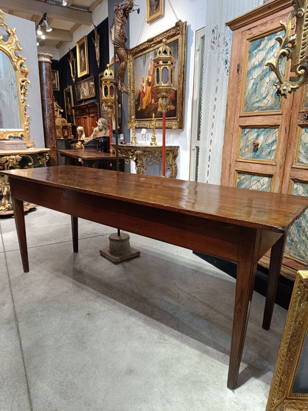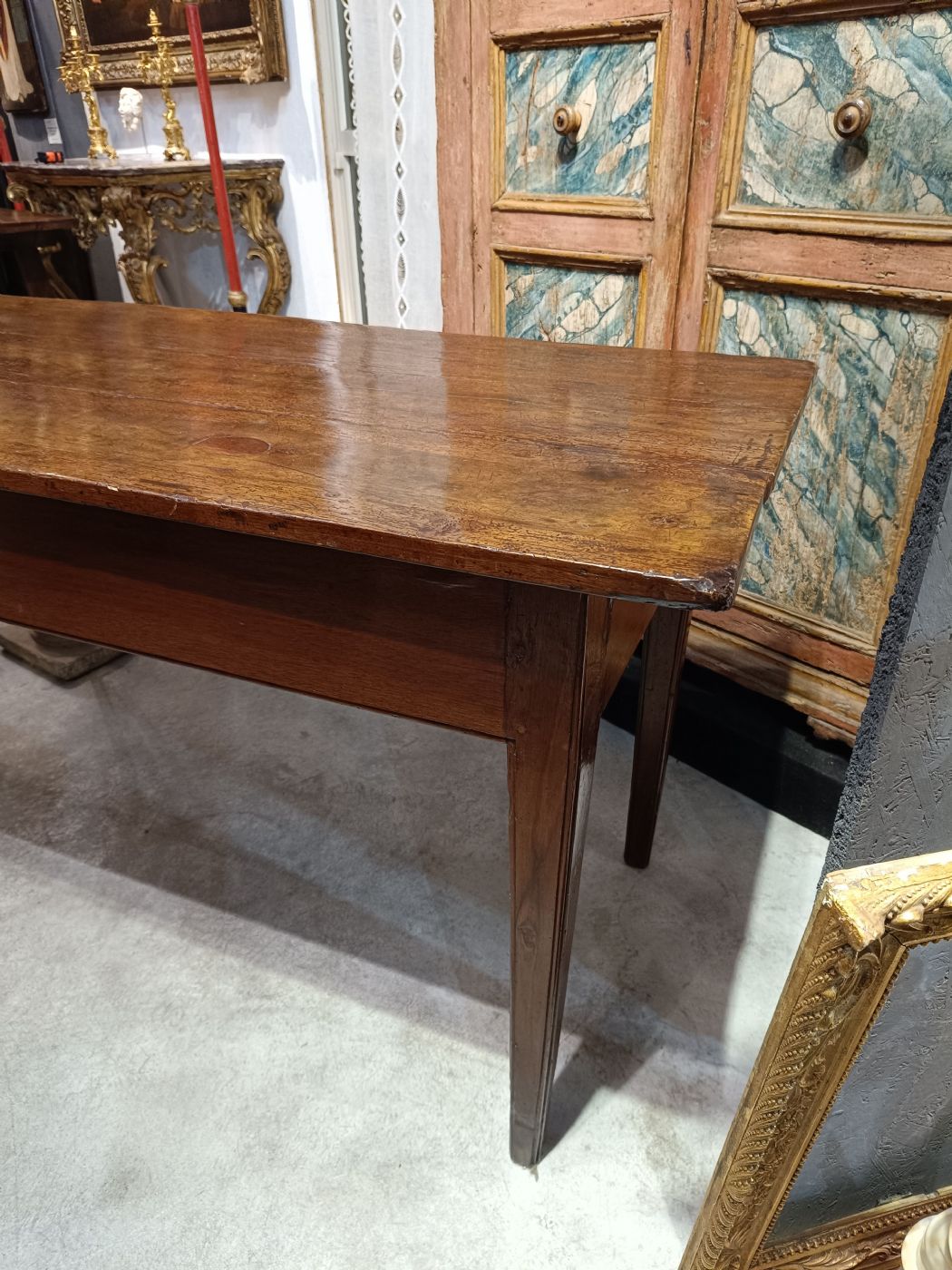 Unique Tuscan monastic refectory table, in walnut wood, with fluting at the 4 corners of the leg and along the crosspieces.