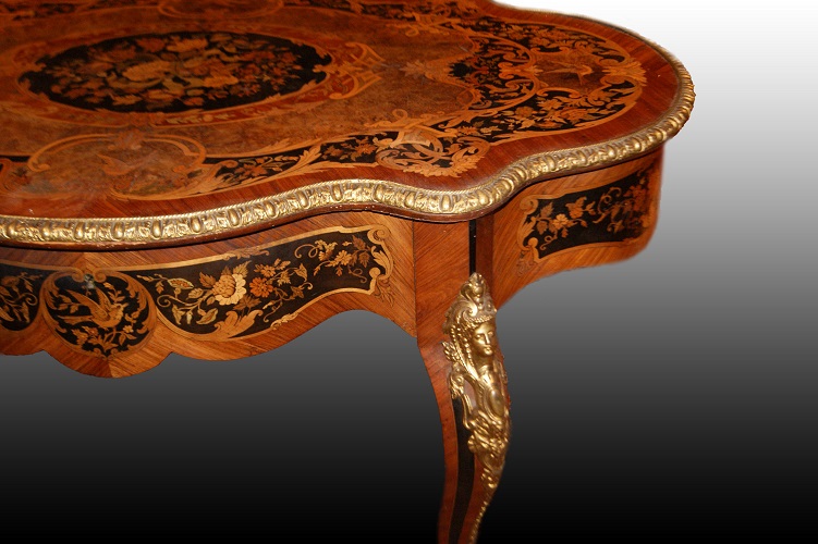 Superbo tavolo da salotto francese di metà 1800, stile Luigi XV, in legno bois de rose, radica di noce ed ebano. Presenta motivi di intarsio floreale con uccelli lungo tutto il piano e fascia sottopiano, applicazioni in bronzo, piano perimetrato da bordatura in bronzo e cassettino sottopiano.