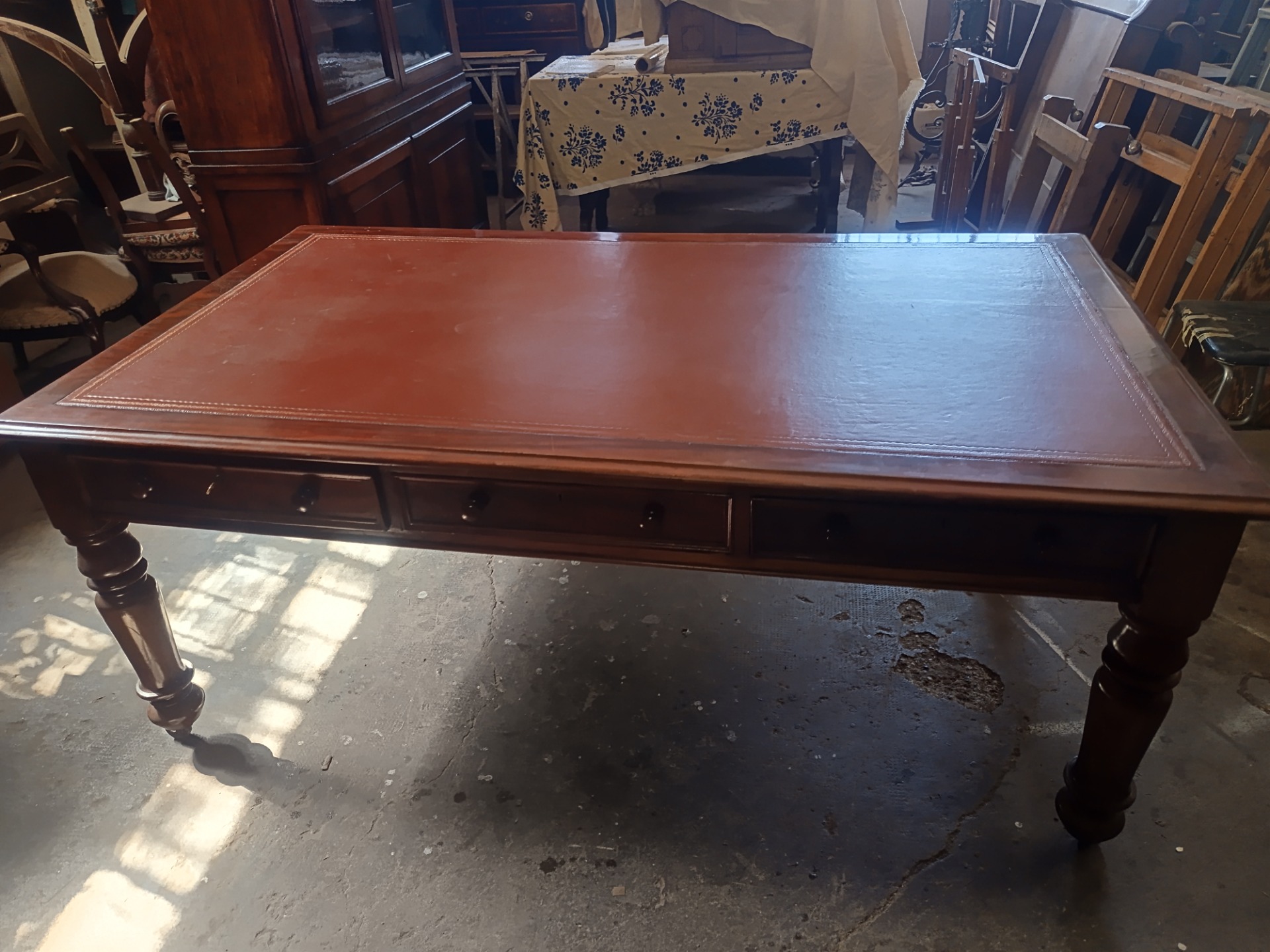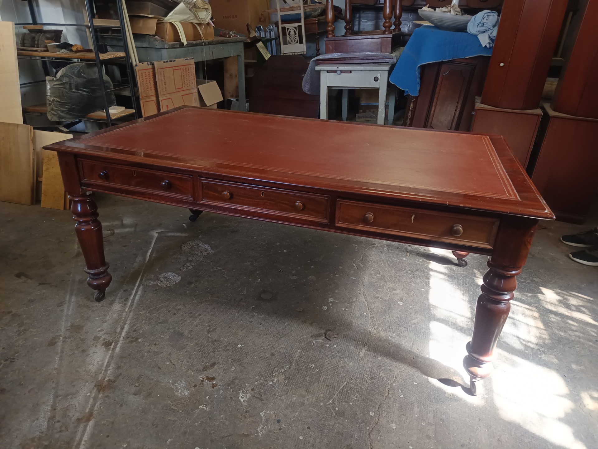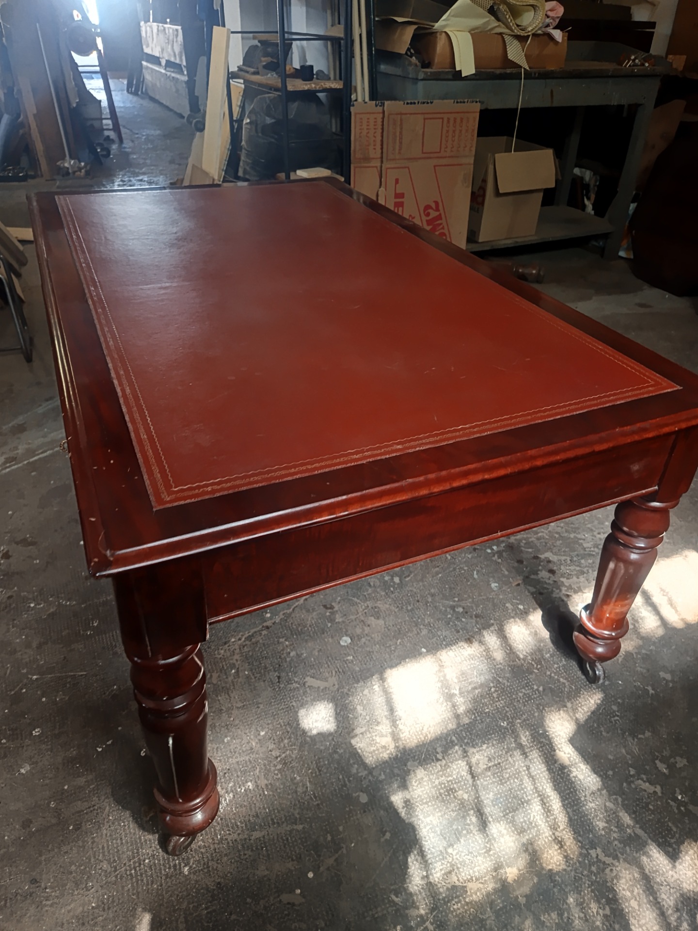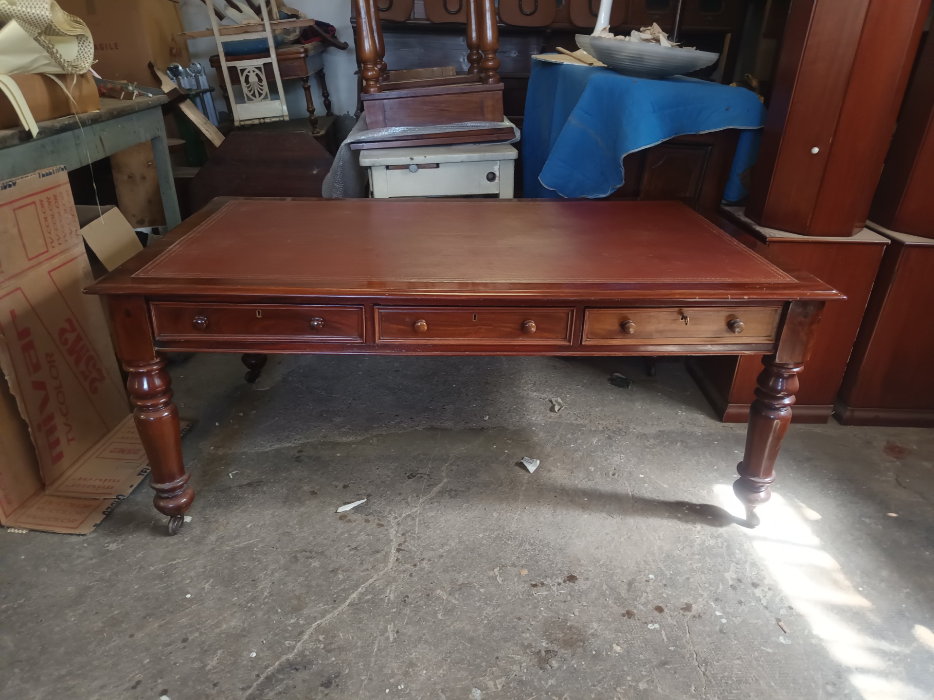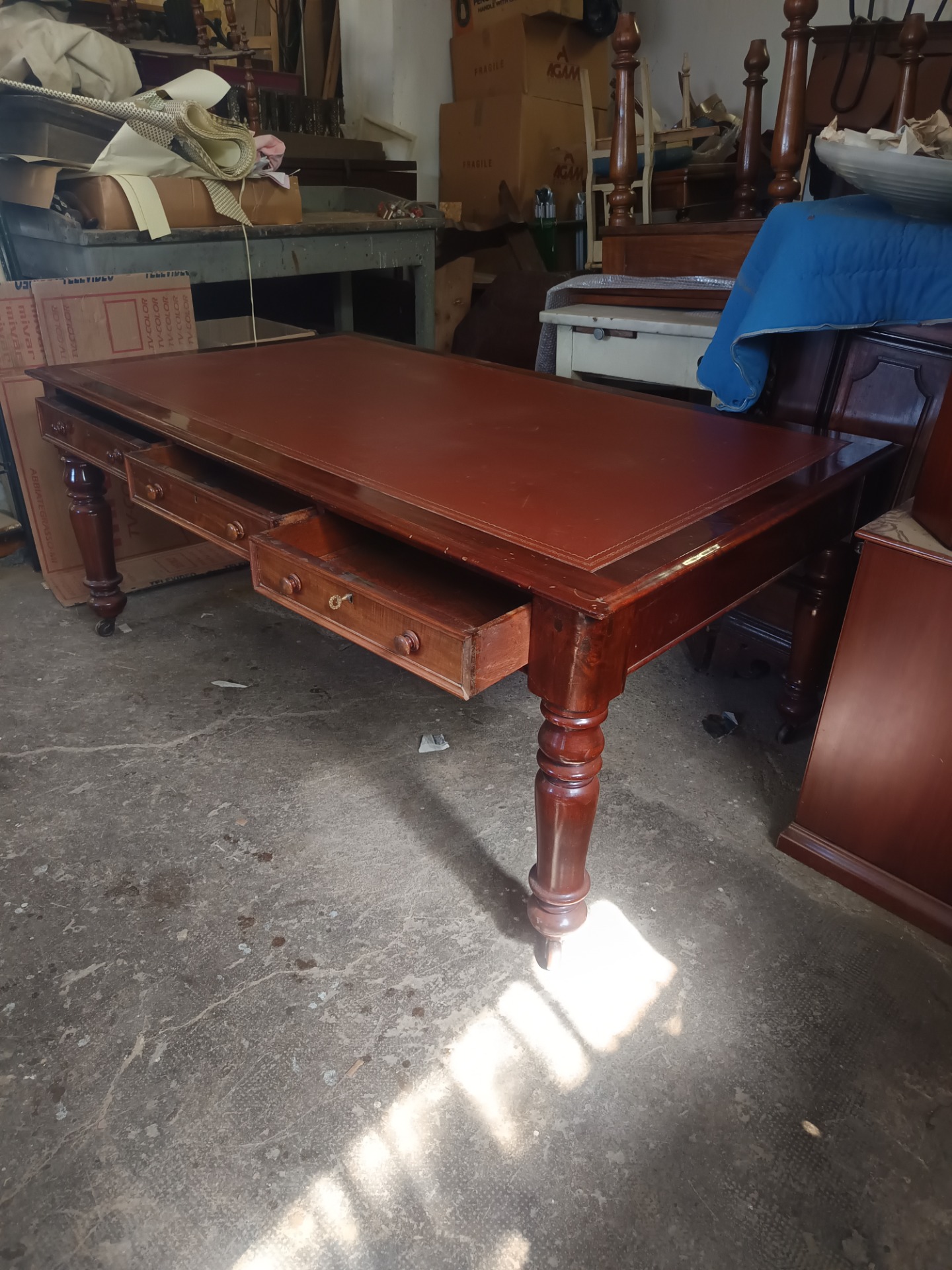 The table is made of mahogany and contains 6 drawers (three on each side).