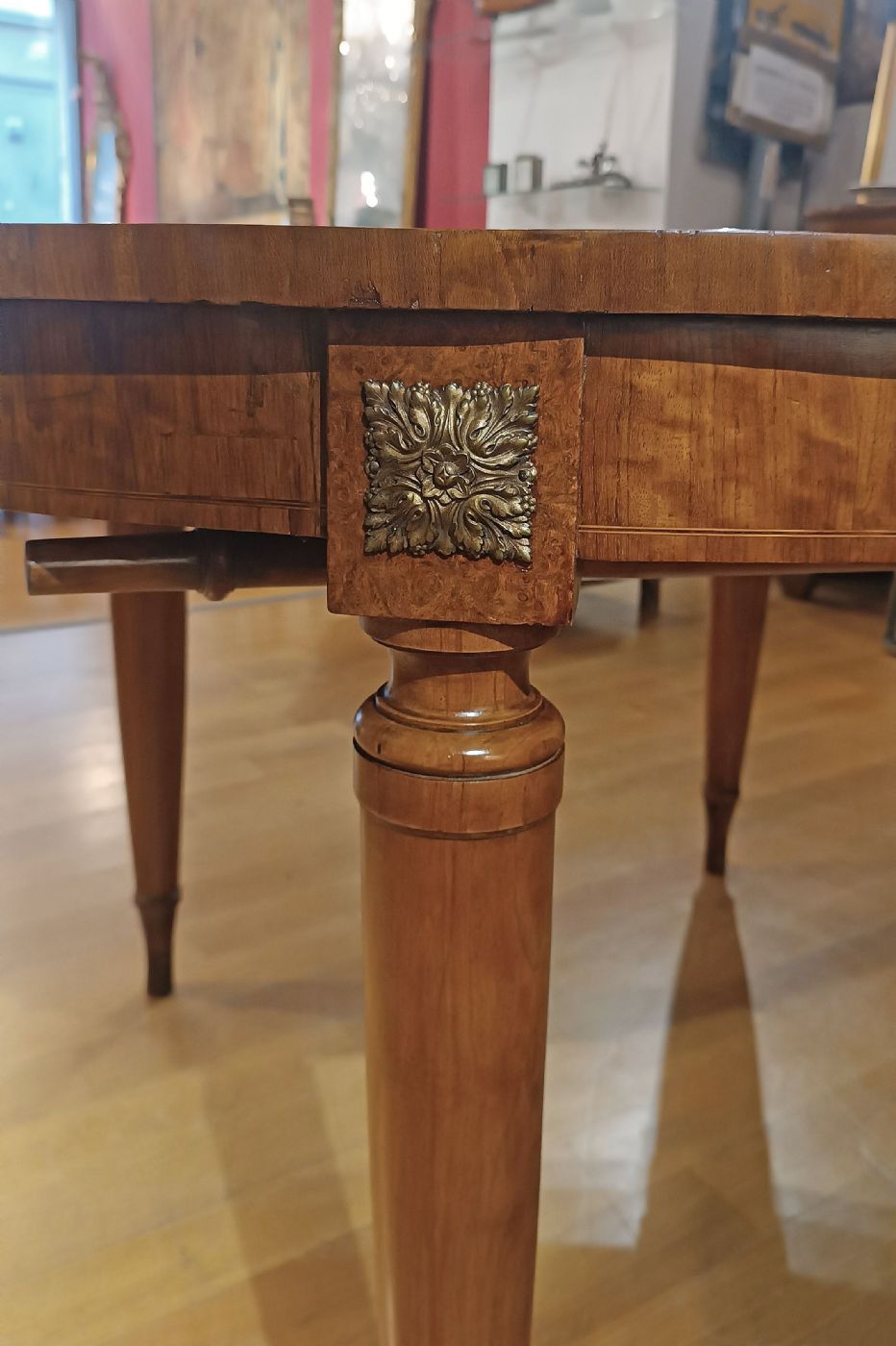 Refined oval dining table made of thuja root, hand-carved. The table features four straight legs with pointed feet and an apron decorated with floral details in lost-wax cast bronze. The top is inlaid with geometric rosewood threads that enhance its overall elegance. In addition, the table is extendable and equipped with an extension also made of thuja root. It is a piece of furniture of great taste and elegance, capable of furnishing any environment with refinement. French manufacture from the mid-19th century.