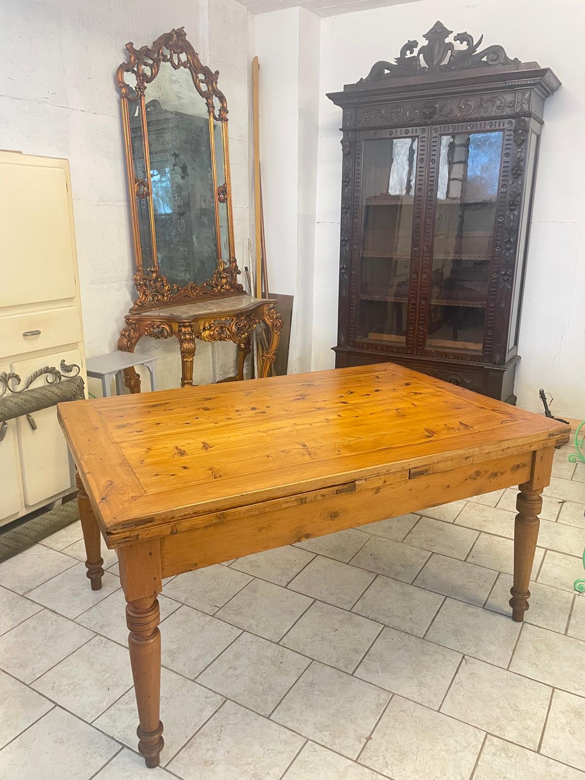 Meraviglioso tavolo allungabile a tiro in cipresso dalle dimensioni molto importanti (oltre 3 metri allungato), piano ed allunghi rifiniti con un’elegante riquadratura, bella la tornitura delle gambe.