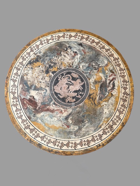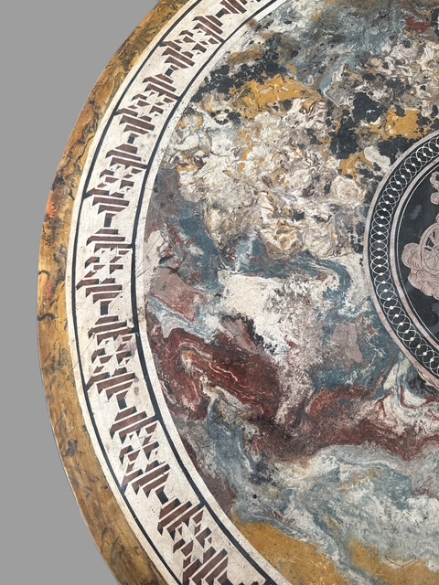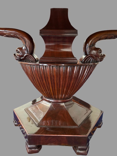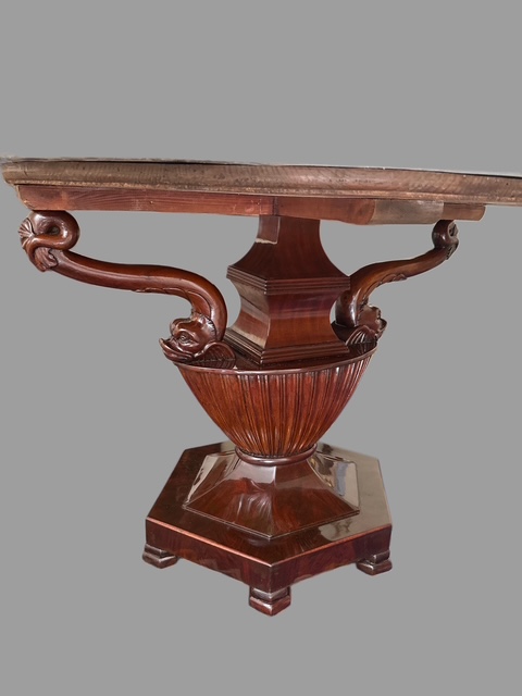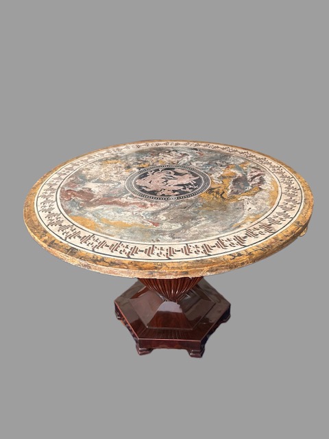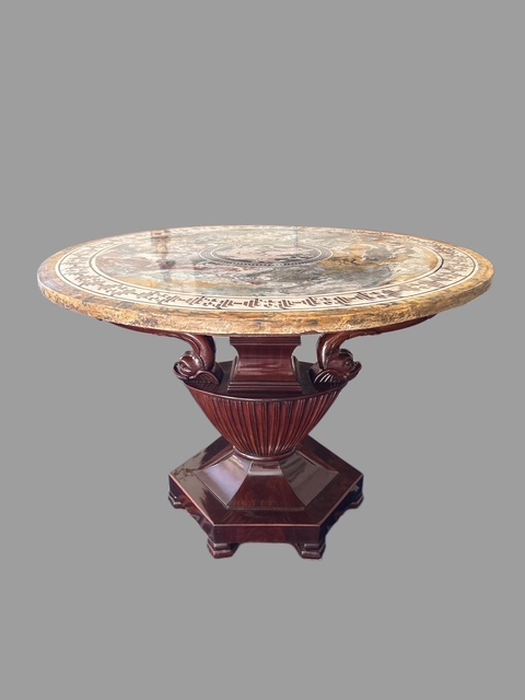 Tavolo con piano in scagliola raffigurante scena neoclassica datato " 1832 " sorretto da tritoni poggianti su base centrale a forma di vaso in legno di mogano.