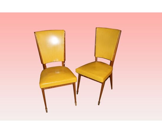 Tavolo con 6 sedie italiane di inizio 1900, stile Decò. Il tavolo è in legno di acero e mogano con piano parquettato dotato di 2 allunghe originali, le sedie sono in legno di mogano con seduta e spalliera rivestiti in similpelle di colore giallo.