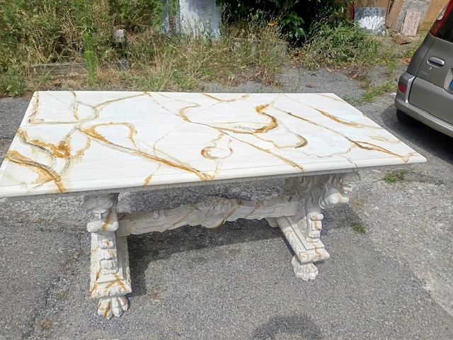 Tavolo neo rinascimentale scolpito con cariatidi dipinto a finto marmo. Misure: cm 149 x 69 x 82