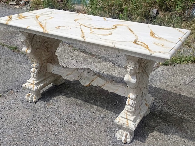 Tavolo neo rinascimentale scolpito con cariatidi dipinto a finto marmo. Misure: cm 149 x 69 x 82