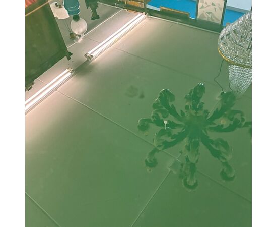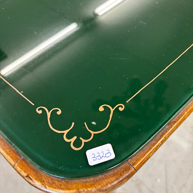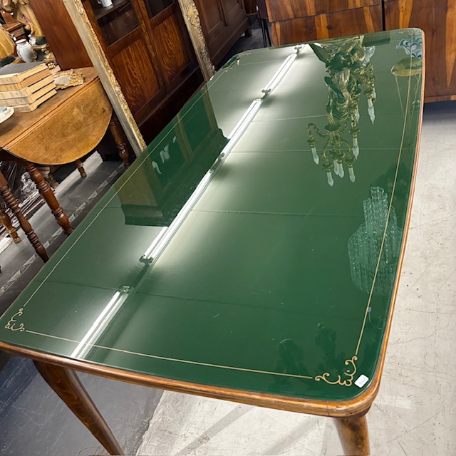 Tavolo modernariato anni 60 con piano in vetro verde dipinto . Restaurato. Mis 178 x 86 h 80