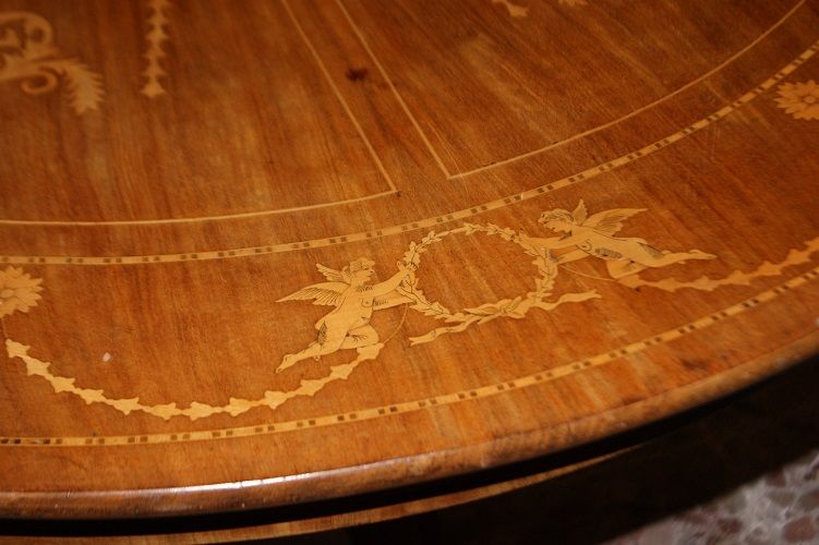 Tavolo Nord Europa di inizio 1800, stile Regency, in legno di mogano biongo. Presenta piano riccamente intarsiato e pirografato con anfore ghirlande, putti e lira, basamento a ceppo centrale anch'esso riccamente intarsiato e la bordatura sotto piano con filetto di intarsio pirografato....