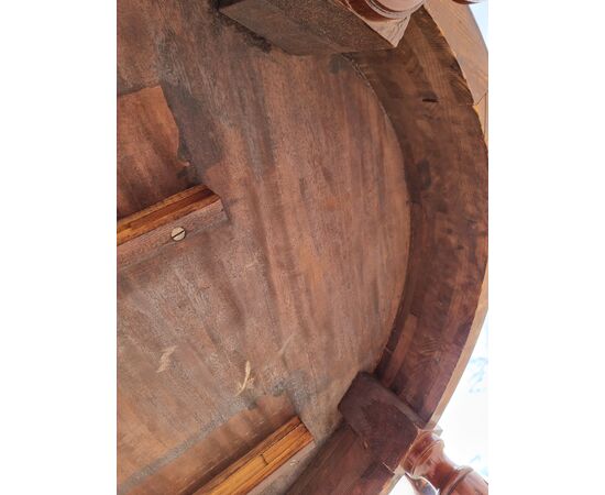 Elegante tavolo ovale allungabile in legno di mogano, databile ai primi del Novecento. Il piano, pellicciato in mogano, misura 110 x 139 cm da chiuso e può raggiungere una lunghezza massima di 270 cm in posizione estesa. Le prolunghe originali non sono più presenti, ma è possibile realizzarle su misura. Il tavolo poggia su quattro gambe tornite e scanalate in stile Luigi XVI, arricchite da placche ornamentali in metallo poste all'attacco delle gambe. In origine probabilmente dorate, queste placche hanno perso la doratura, ma possono essere restaurate su richiesta. Quando aperto, si attivano due gambe centrali di supporto (attualmente prive di rotelle, ma reintegrabili). Strutturalmente in buone condizioni, con fusto solido e incastri stabili. Il piano presenta segni di usura e graffi superficiali compatibili con l'età e l’uso dell’oggetto. Può essere utilizzato così com'è o, su richiesta, sottoposto a intervento di restauro conservativo, parziale o completo. Spedizioni in tutto il mondo. Per maggiori informazioni o per un preventivo di restauro, non esitate a contattarci.