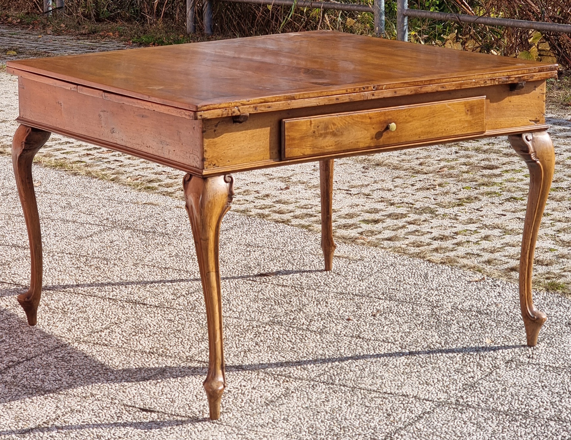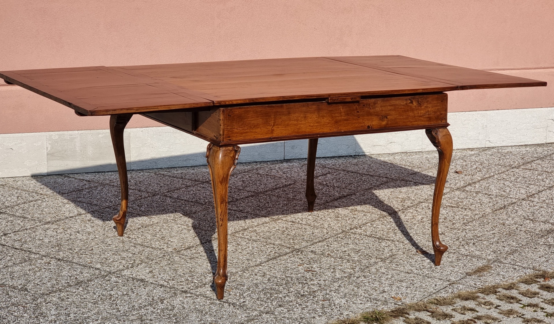 Elegant center or dining table made of solid walnut wood, of Venetian production, datable to the 18th century. The furniture has a sober and refined line, embellished with wavy legs with a cut section, in a clear Venetian taste, which give momentum and lightness to the structure while maintaining great stability. The rectangular top is extendable by means of two pull-out extensions housed under the main top: one on each side. This solution allows you to double the useful surface, going from 116 x 113.5 cm (closed) to 216 x 113.5 cm (open), for an overall height of 80.5 cm. The table is also equipped with two opposing drawers, inserted in the edge under the top and sliding on original guides, comfortable and perfectly functional. The warm and deep patina of walnut, together with the natural veins and signs of aging, testify to the authentic beauty of a piece of furniture that has been used, but is still perfectly solid and ready to be placed in both classic and contemporary environments. A beautiful example of eighteenth-century Venetian cabinetmaking, balanced in proportions and full of charm. --- Closed dimensions: 116 × 113.5 × h 80.5 cm - Open dimensions: 216 × 113.5 × h 80.5 cm --- Note: For further information, photos or technical details, please do not hesitate to contact us. Worldwide shipping available with professional packaging.
