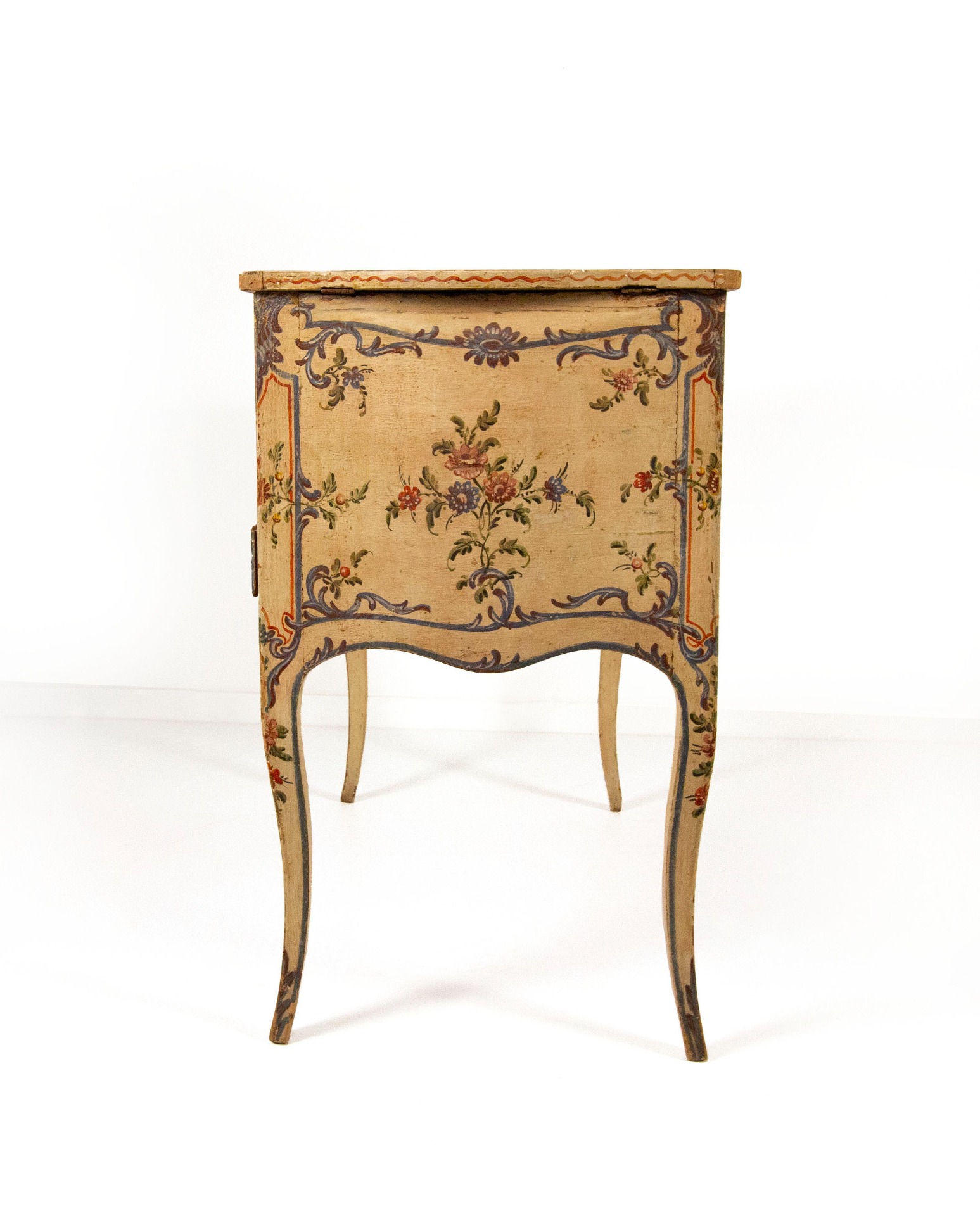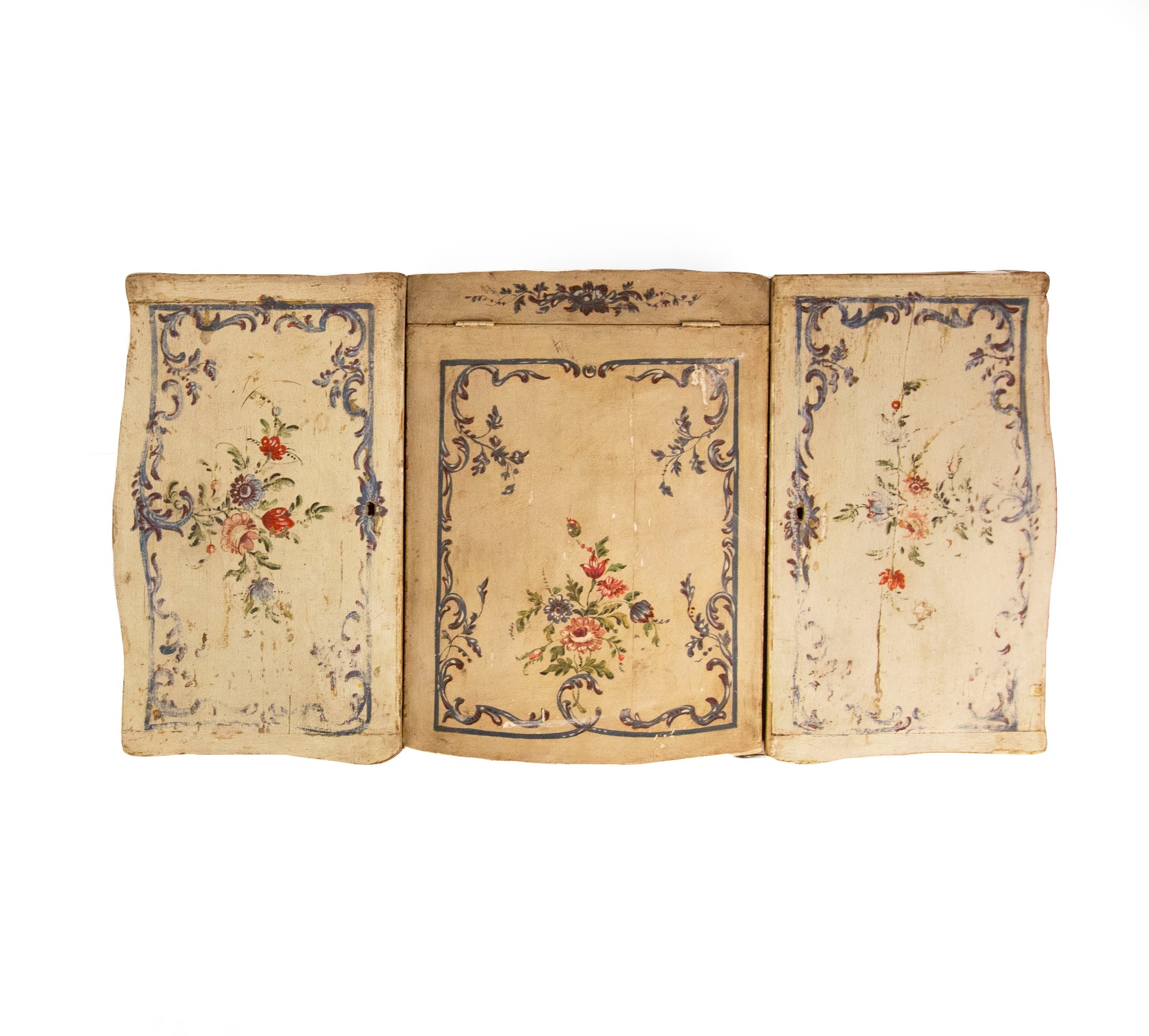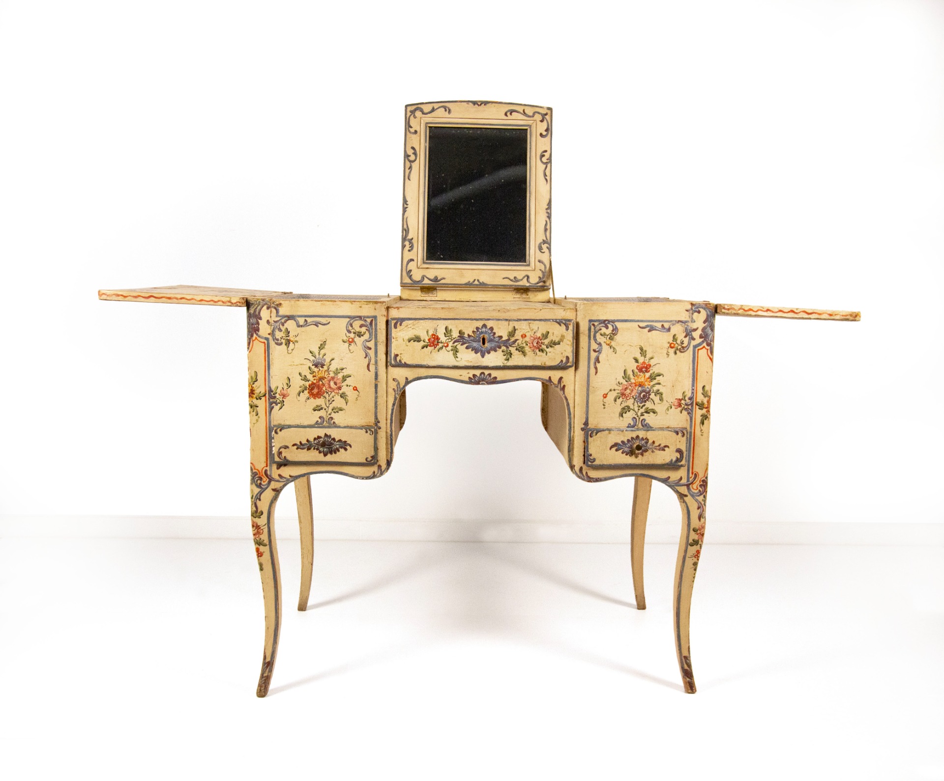 Lacquered wooden dressing table, Genoa, 18th century, slightly curved body decorated in polychrome with bunches of flowers within reserves with volutes on an ivory background. The top is tripartite with two side doors that conceal two compartments, in the center a panel lifts up and hides a mirror. In the belt there is a central drawer and a smaller one on the sides; arched legs, cm 85x96x53