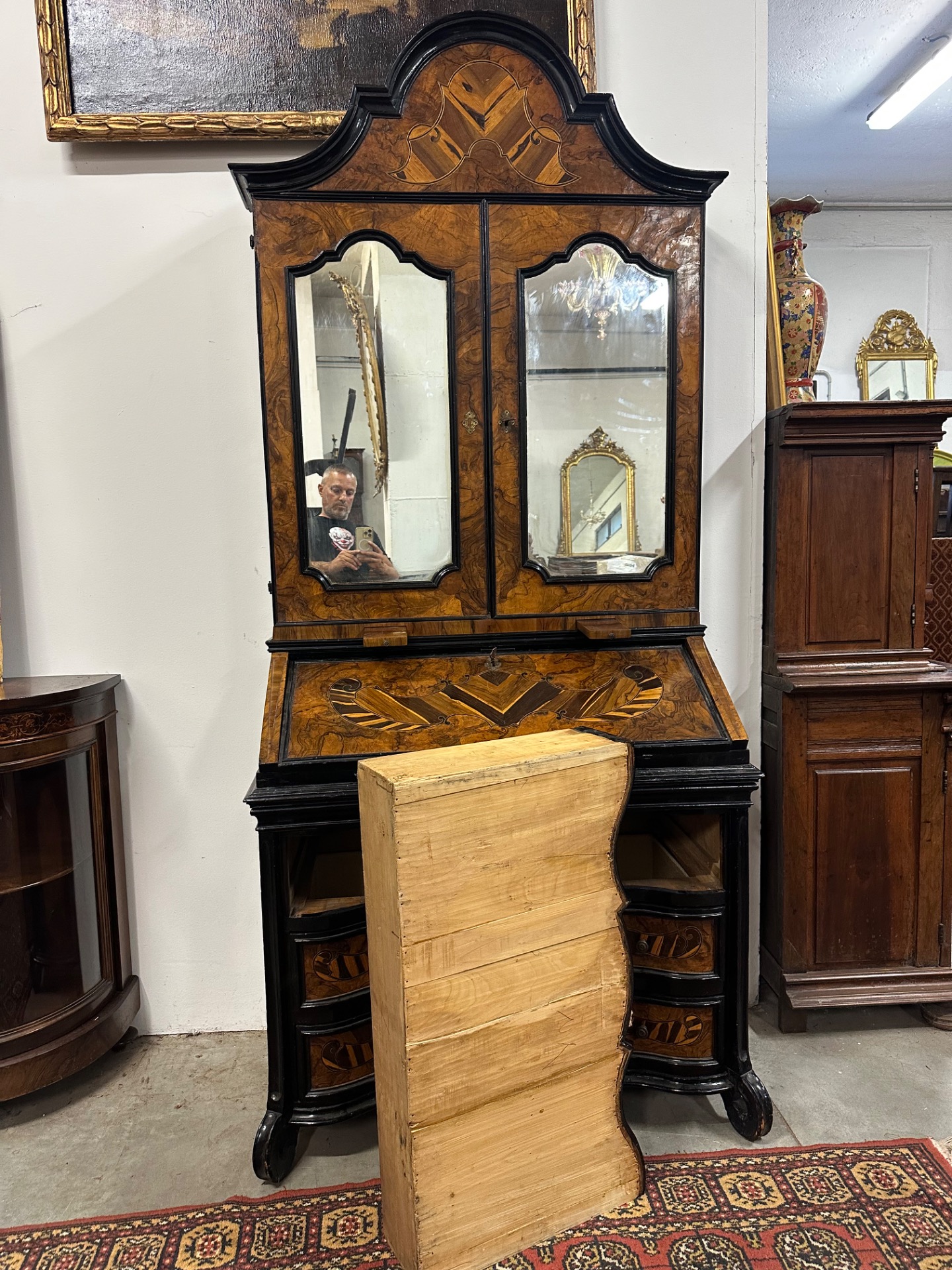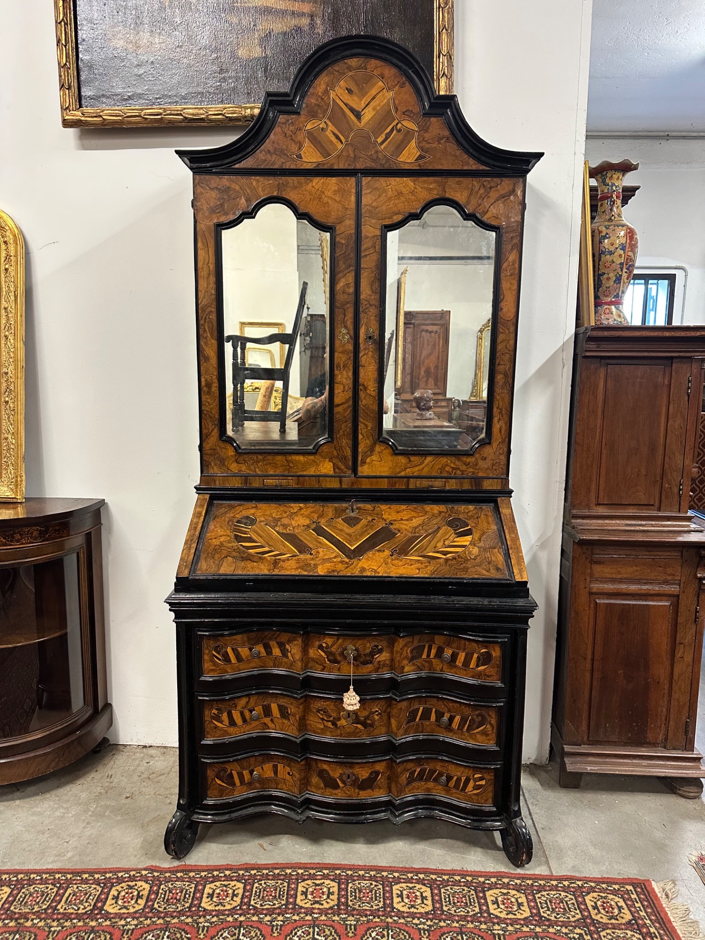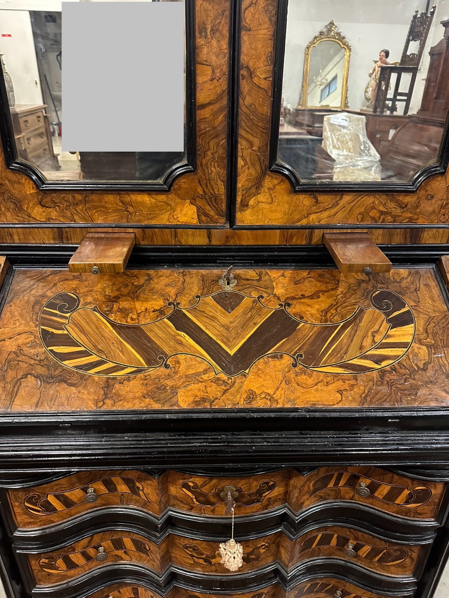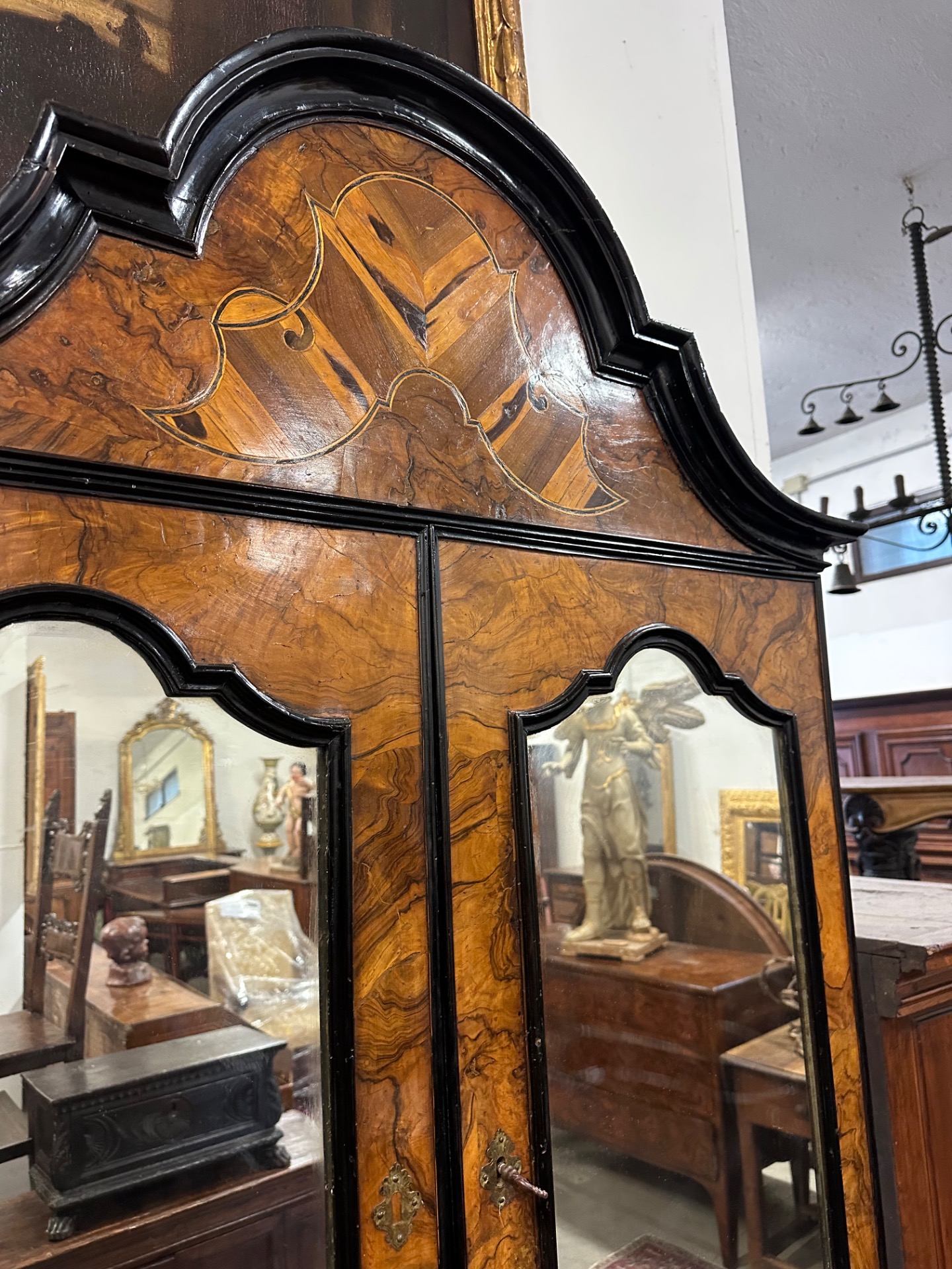 Important Lombard Louis XV trumeau from the early 18th century, shaped on the front, entirely veneered in walnut and walnut burl with ebonized mixtilinear frames, mercury glass, six internal drawers in the cabinet, coeval scroll feet of the period.