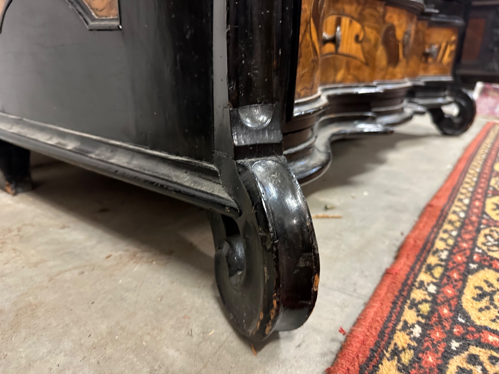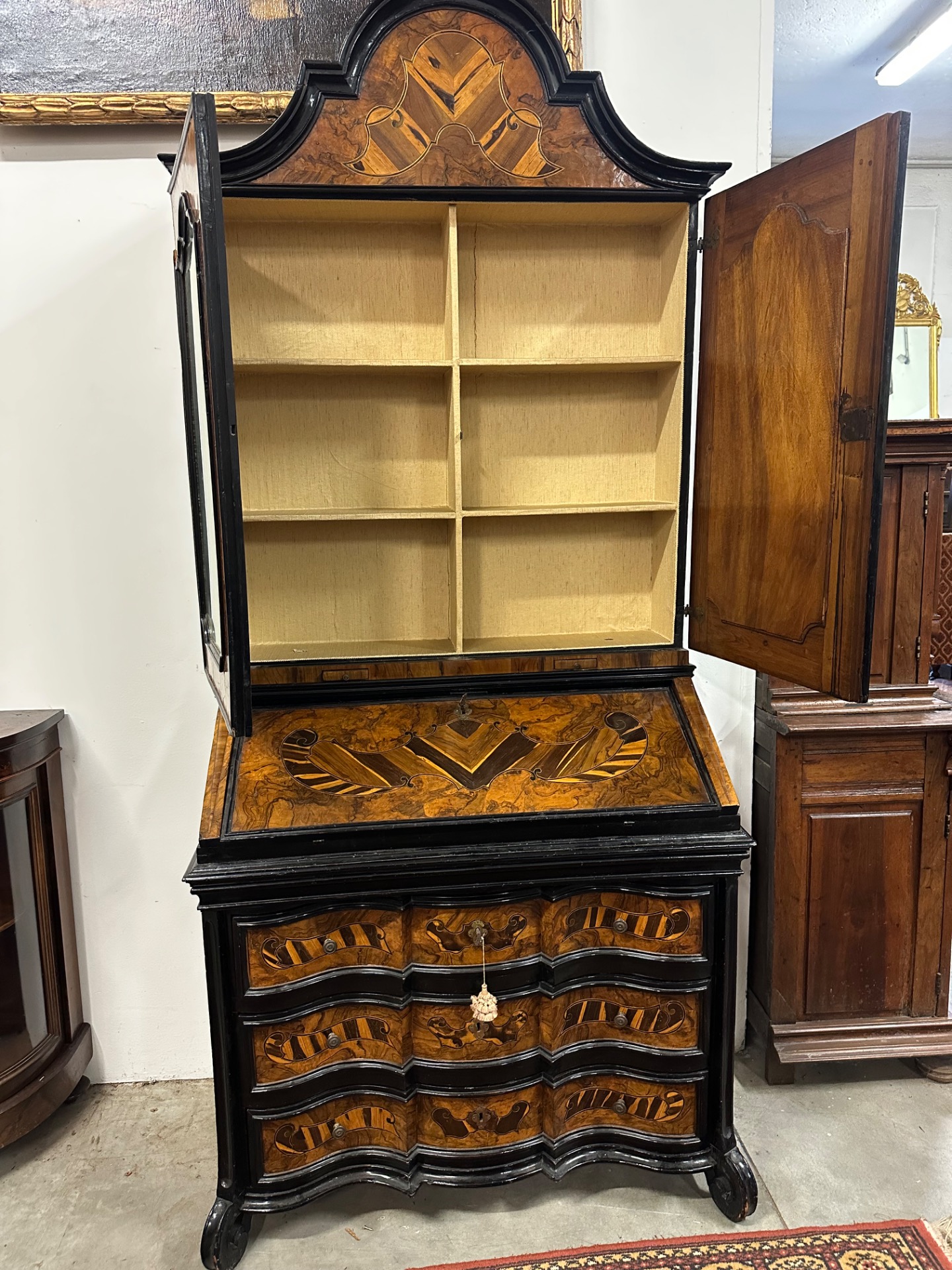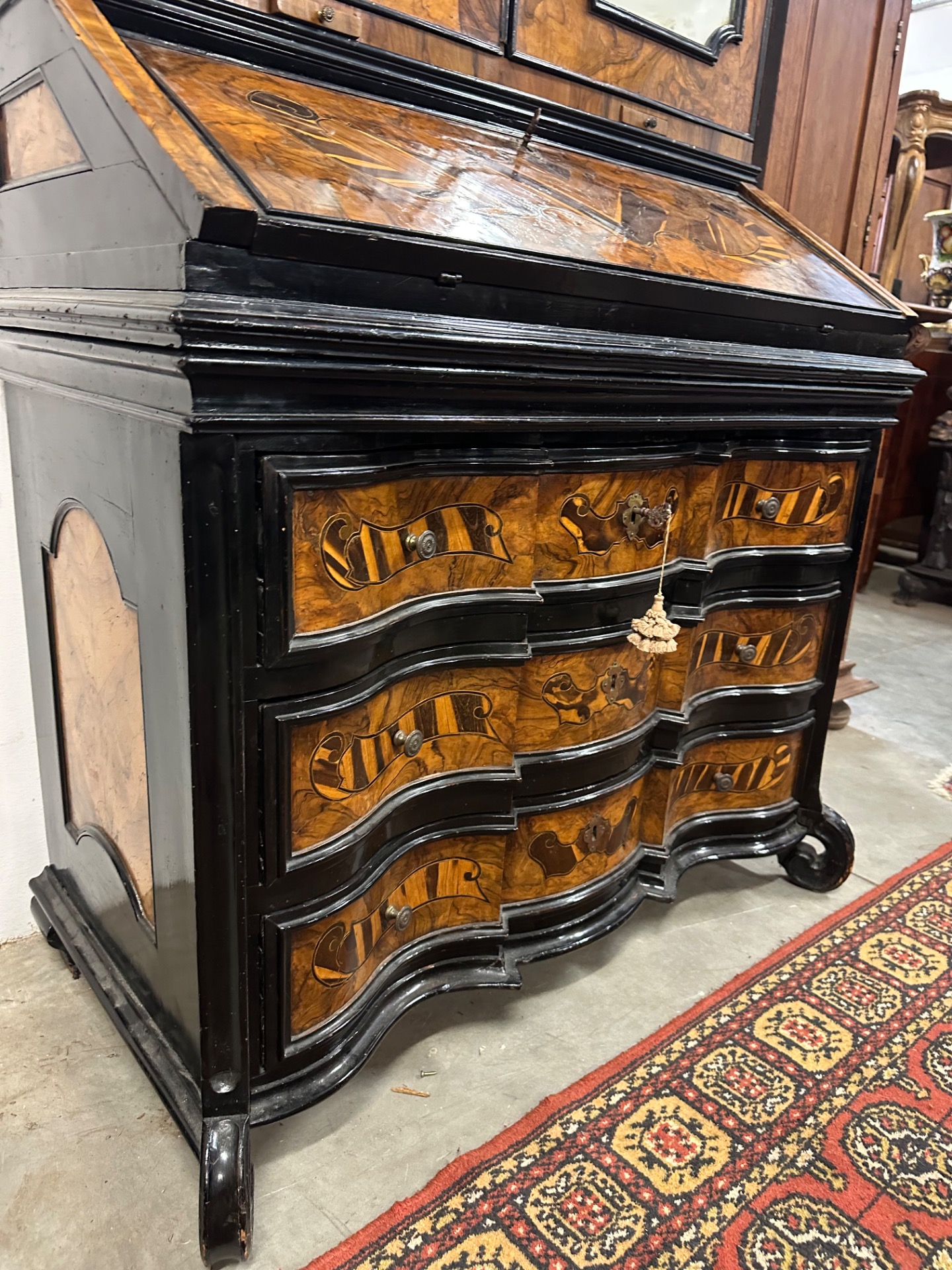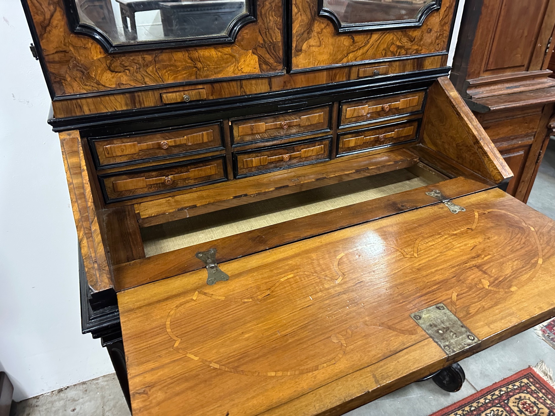 Important Lombard Louis XV trumeau from the early 18th century, shaped on the front, entirely veneered in walnut and walnut burl with ebonized mixtilinear frames, mercury glass, six internal drawers in the cabinet, coeval scroll feet of the period.