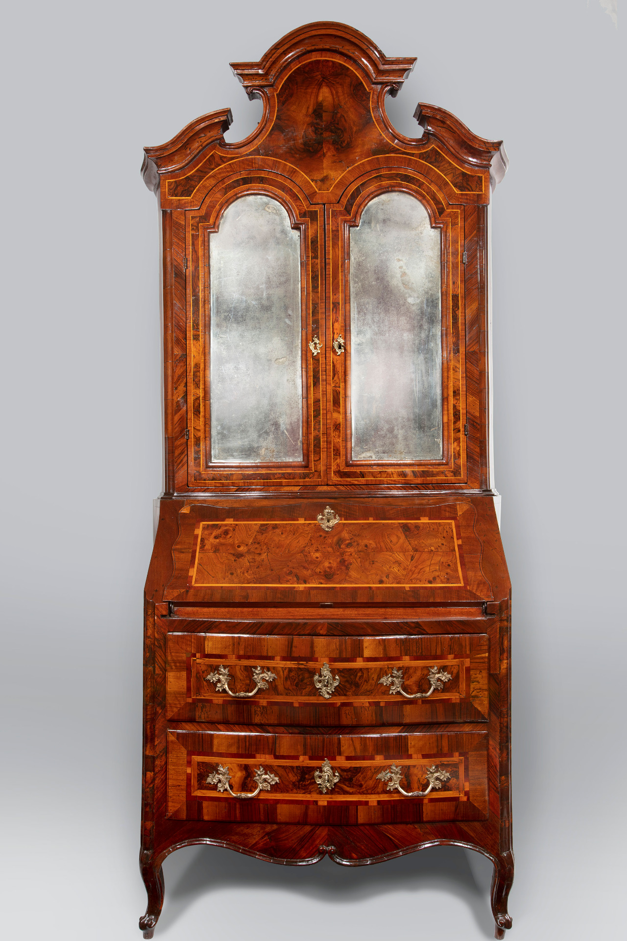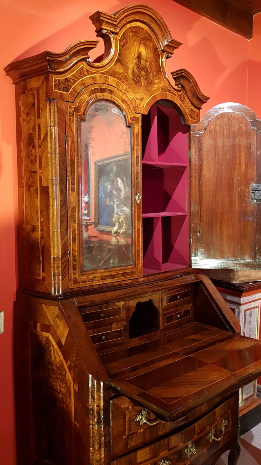Lombard trumeau, veneered and rootwood in walnut and elm wood, two drawers and two mirrored doors, 17th/18th century, height 233 cm, dimensions 100x54 cm.