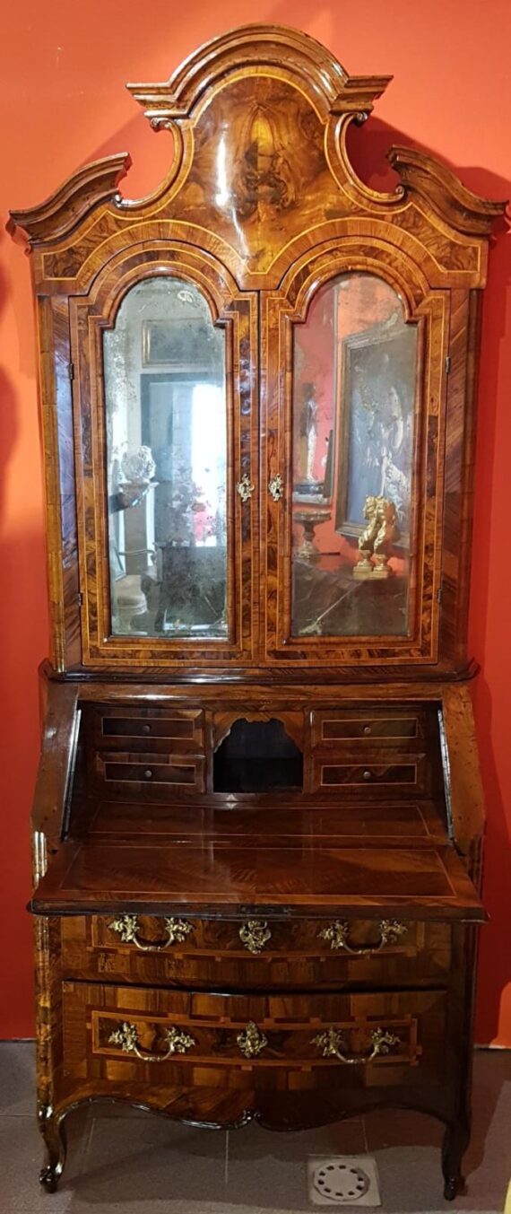 Lombard trumeau, veneered and rootwood in walnut and elm wood, two drawers and two mirrored doors, 17th/18th century, height 233 cm, dimensions 100x54 cm.