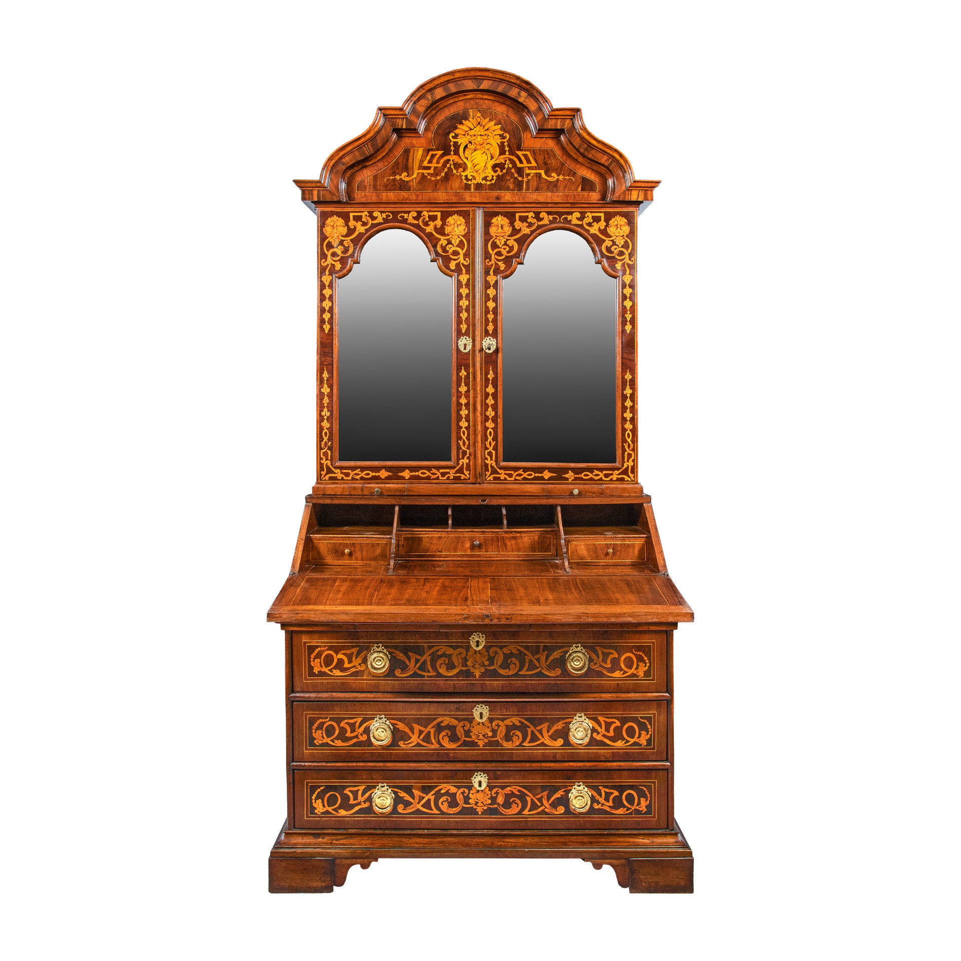 Entirely in finely inlaid wood with vegetal motifs and masks. A noble effigy is represented on the cyma.
